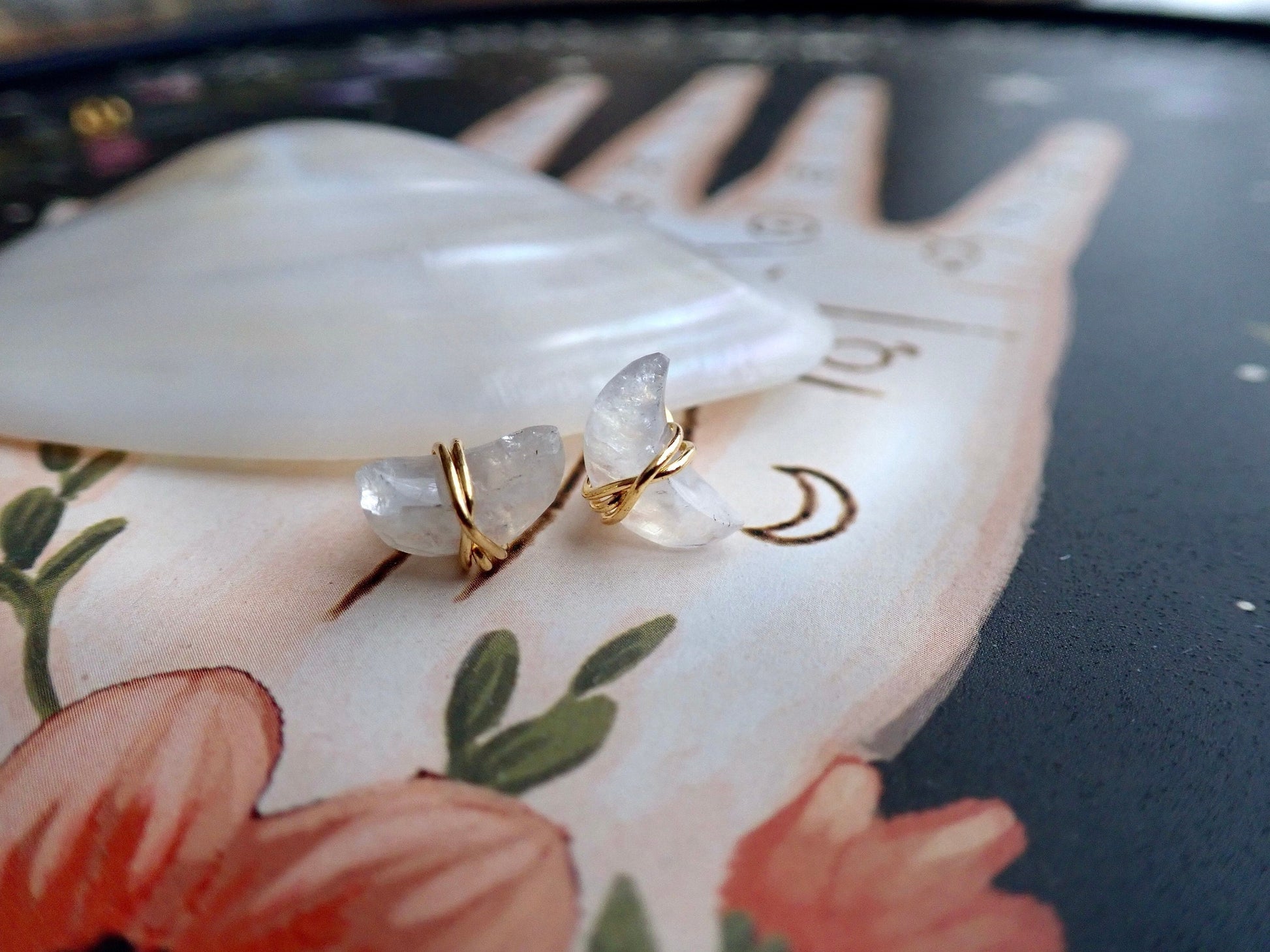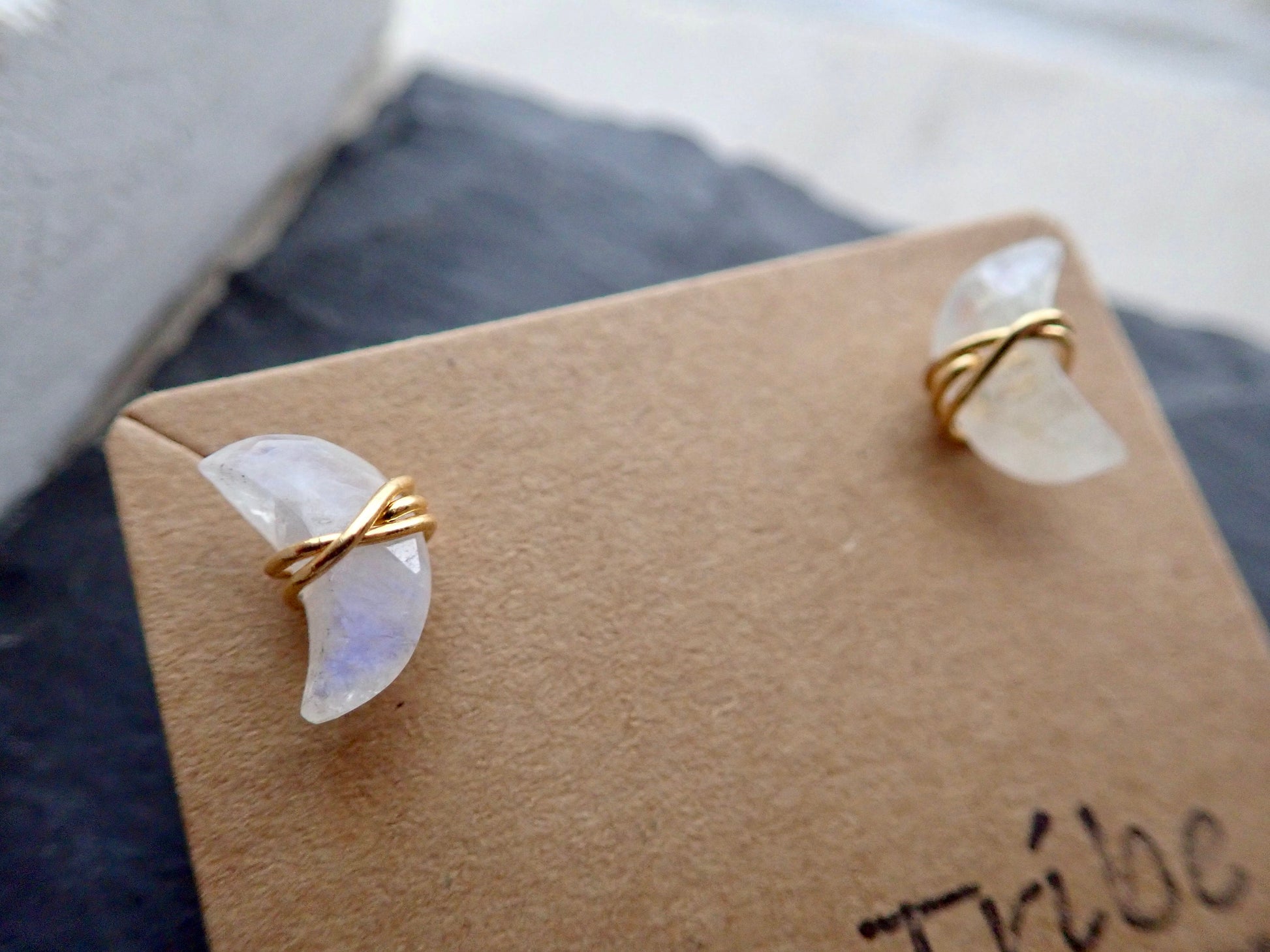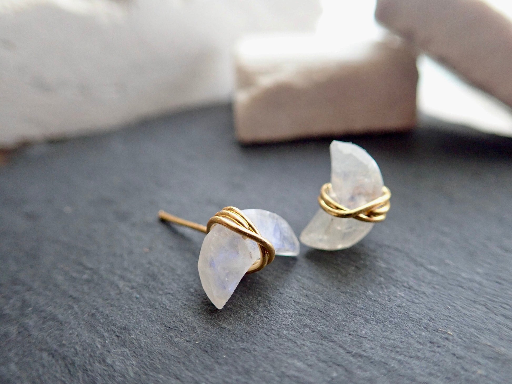 Beautiful and alluring genuine moonstone, cut into a faceted crescent moon is hand wire-wrapped onto either gold plated or sterling silver posts in these beguiling stud earrings. Moonstone is a powerful gem that can mean a lot of things with its diverse healing effects. It is a balancing gem, a birthstone, a lucky stone, and a sacred crystal. Moonstone's aesthetic charm derives from adularescence, an unearthly sheen that moves under the stone's surface and creates a semblance of moonlight glimmering in water