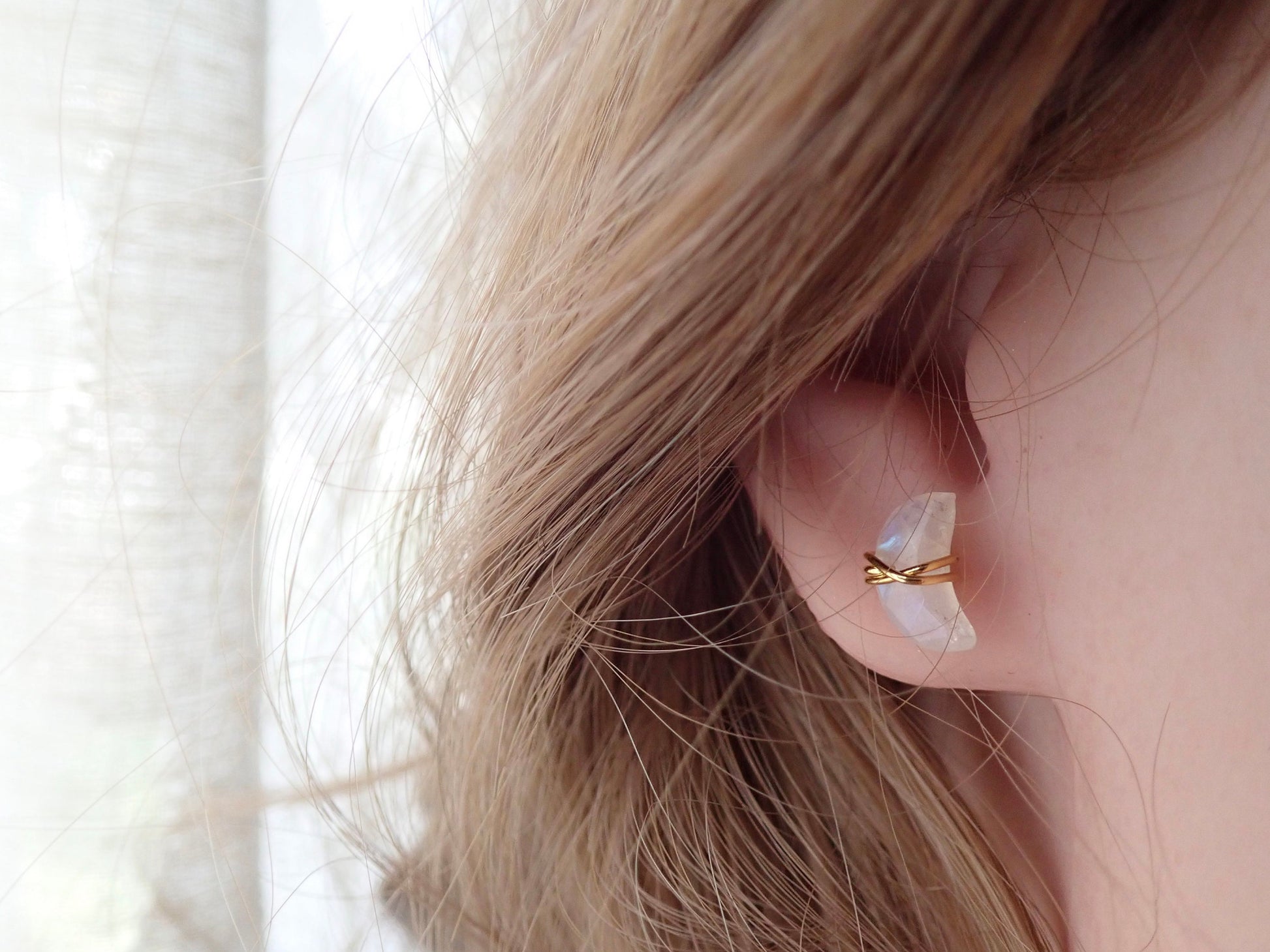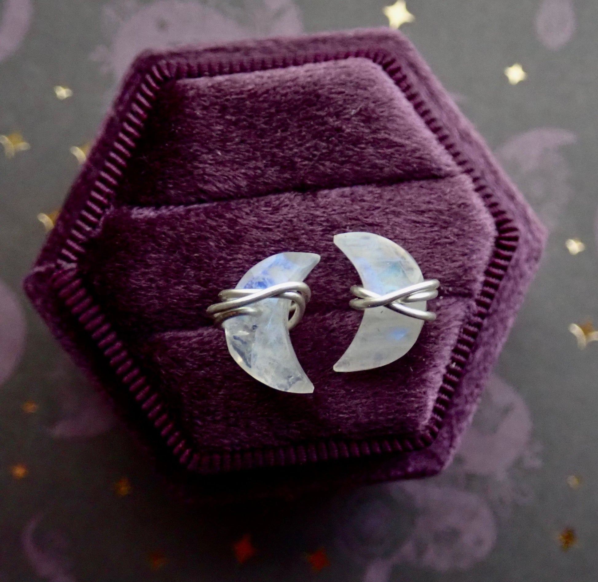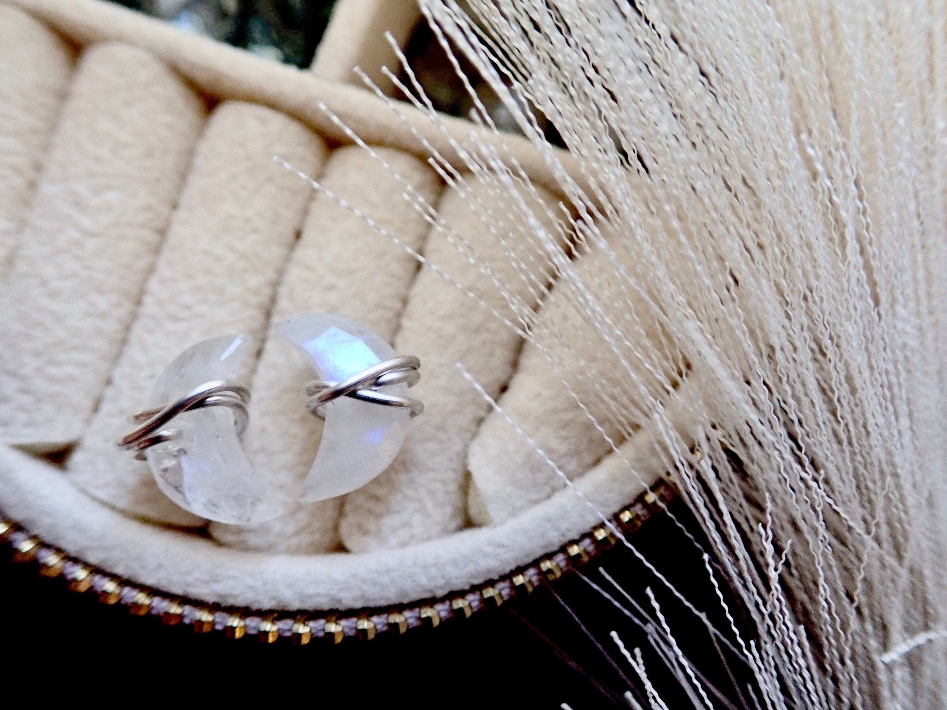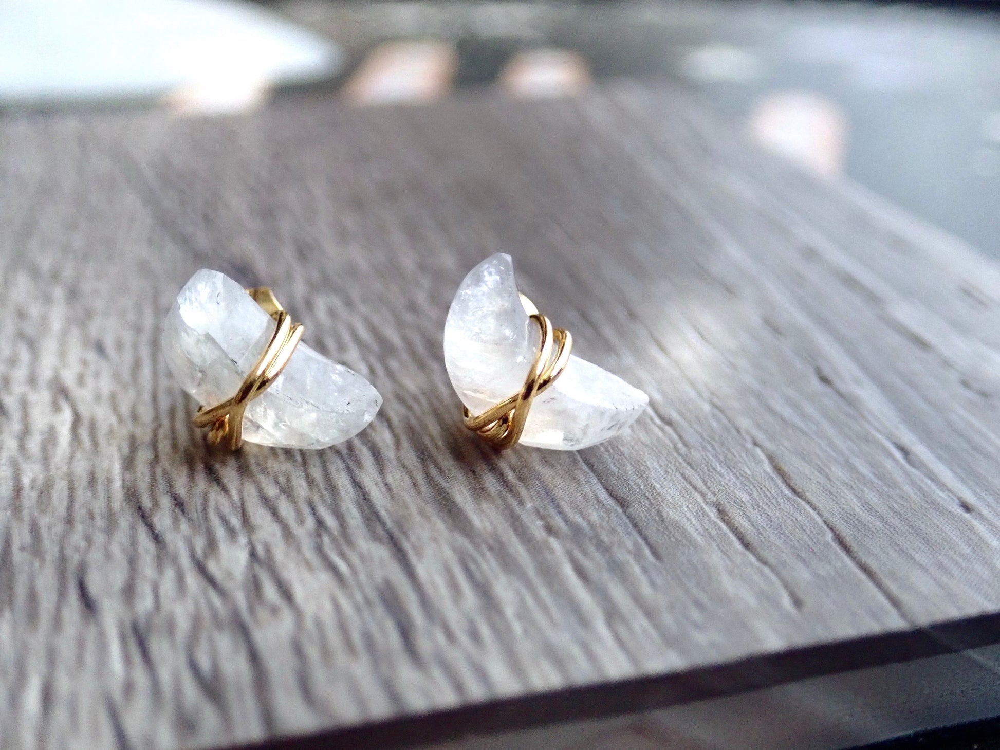 Beautiful and alluring genuine moonstone, cut into a faceted crescent moon is hand wire-wrapped onto either gold plated or sterling silver posts in these beguiling stud earrings. Moonstone is a powerful gem that can mean a lot of things with its diverse healing effects. It is a balancing gem, a birthstone, a lucky stone, and a sacred crystal. Moonstone's aesthetic charm derives from adularescence, an unearthly sheen that moves under the stone's surface and creates a semblance of moonlight glimmering in water