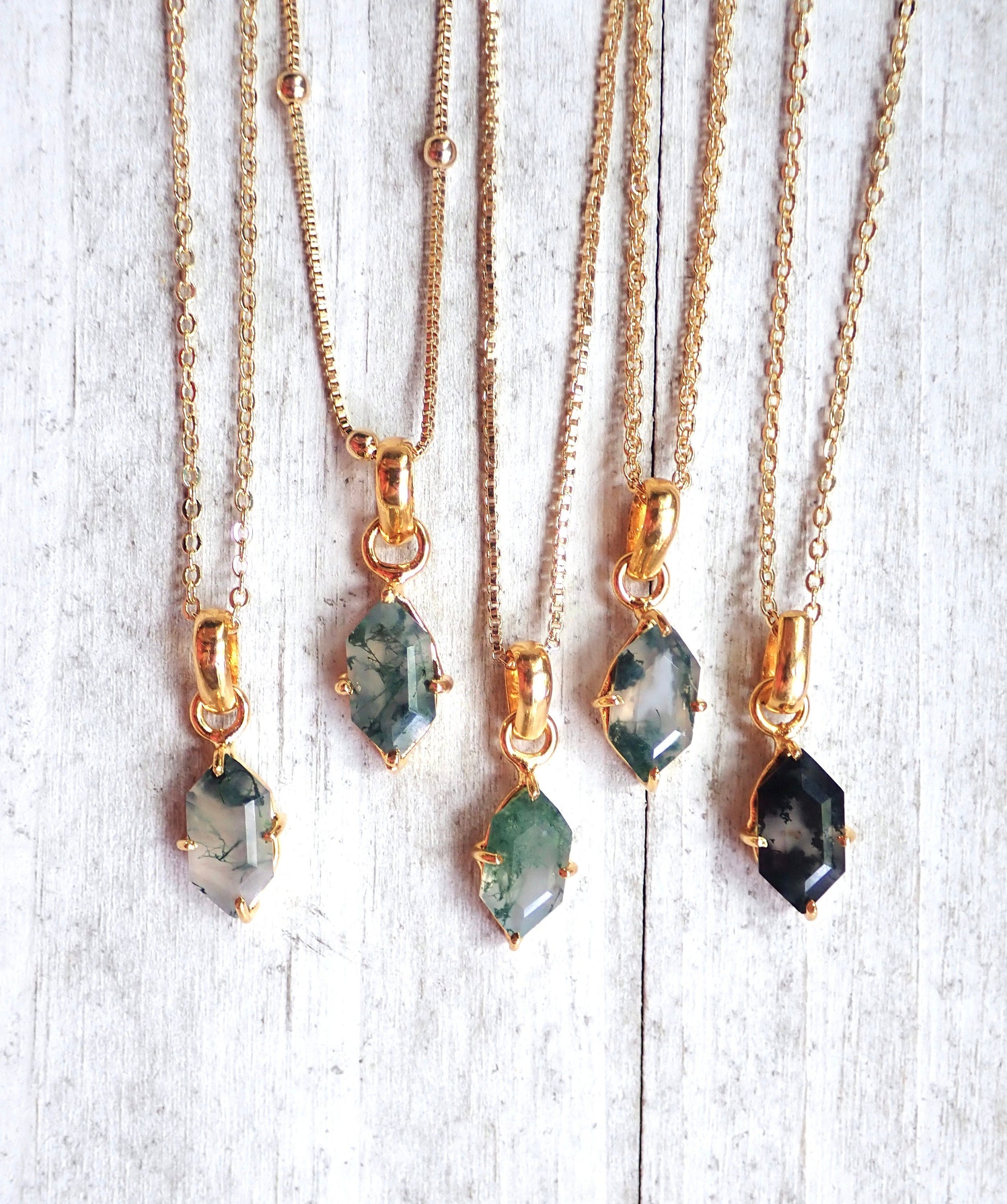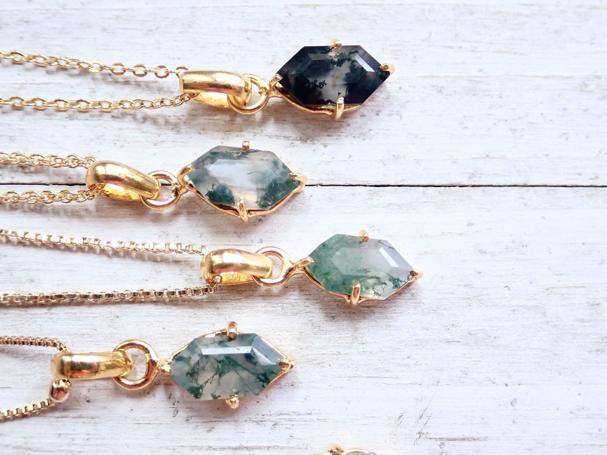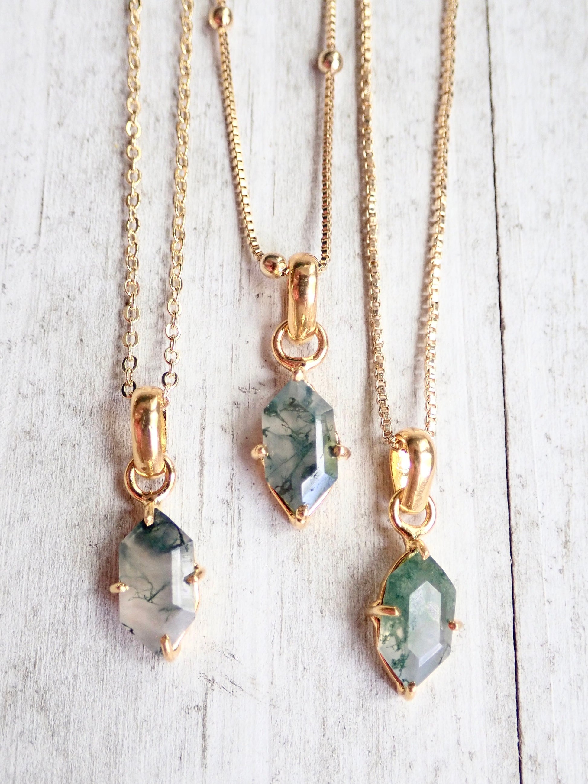 Beautiful and alluring genuine moss agate is hung from your choice of high quality gold fill chain. These stones have such a wonderful and natural beauty that inspires a connection to nature. Moss Agate is considered to be the stone of new beginnings and is all about attracting abundance and tapping into deep-set creativity. Such a beautiful and unique gemstone. It can be clear to milky white, with dendritic inclusions of manganese or iron that have grown into patterns similar to moss or lichen, giving these a super organic feel.Metaphysically, some believe moss agate to be a stabilizing and strengthening influence. Agate is excellent for balancing emotional, physical and intellectual energy and is connected to the heart chakra.