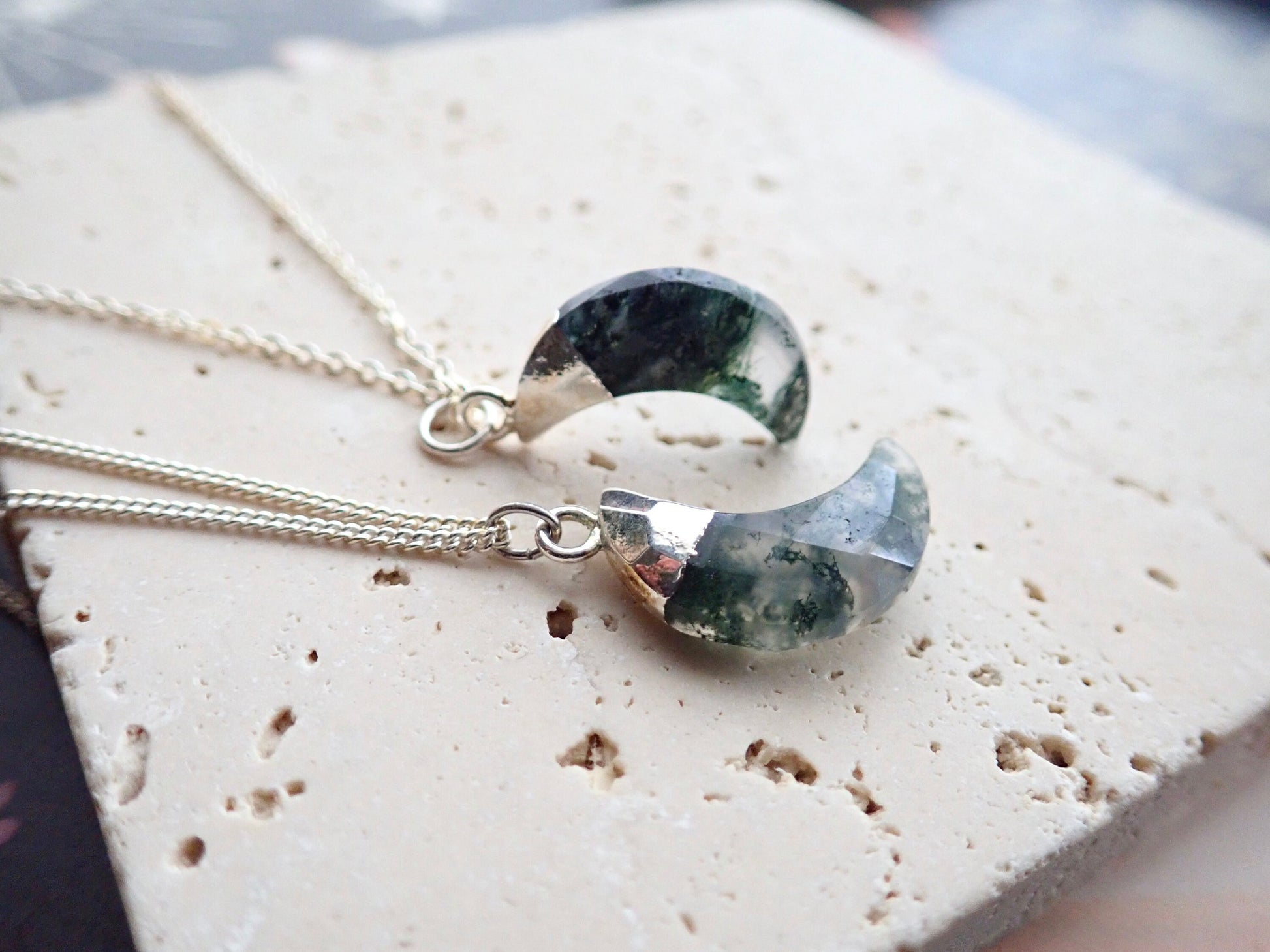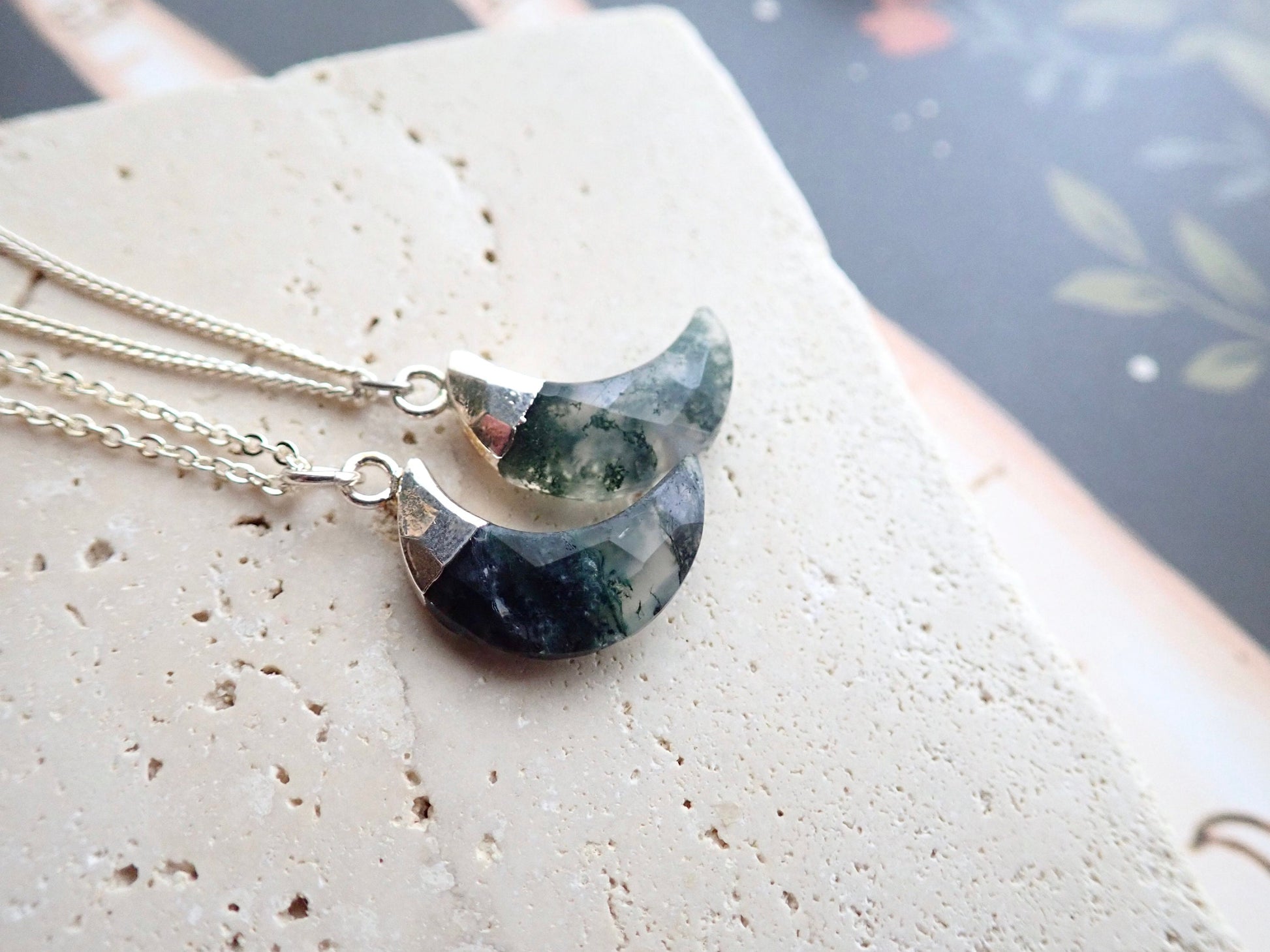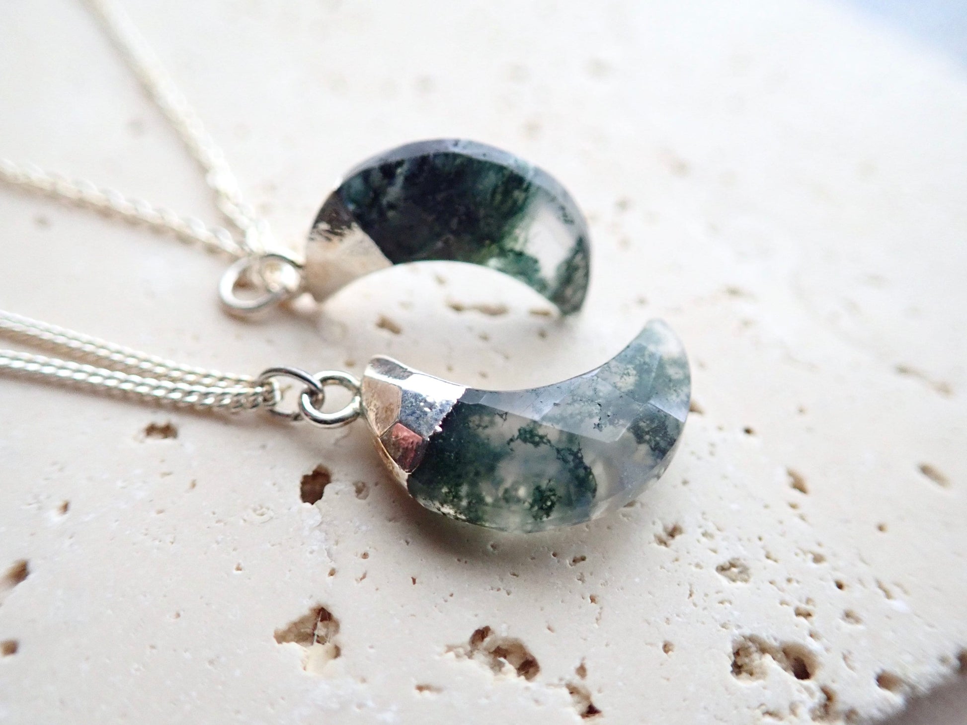 Beautiful and alluring genuine moss agate is hung from your choice of high quality silver fill chain. These stones have such a wonderful and natural beauty that inspires a connection to nature. The captivating moss agate gemstones evoke the tranquil allure of a lush forest, while the delicate crescent moon design adds a touch of celestial magic to your look. ✨🌳