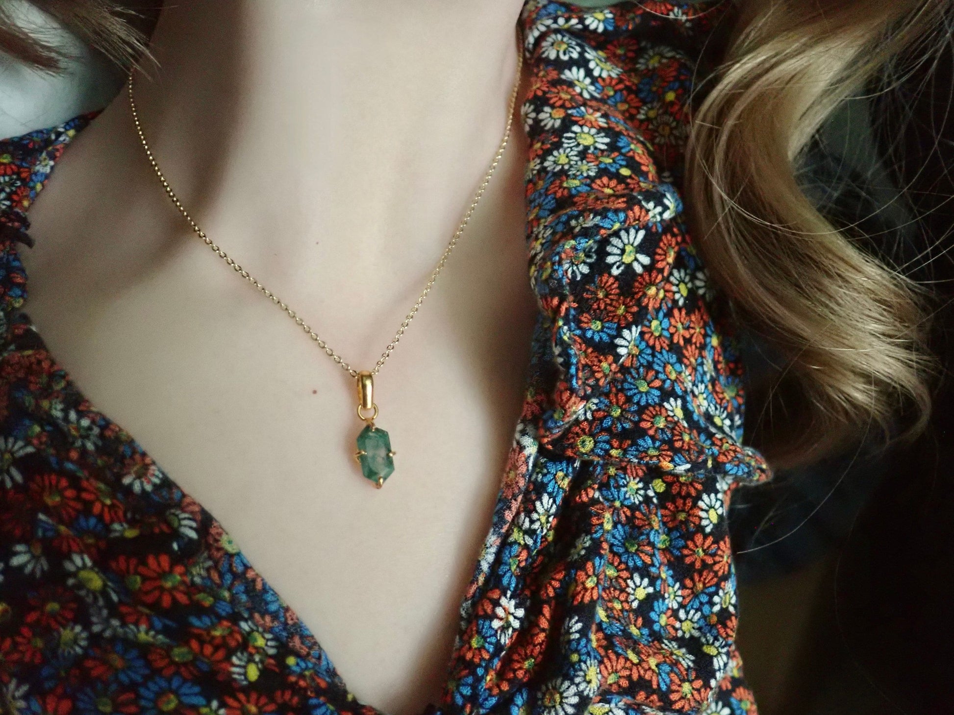 Moss Agate Necklace Silver Fill - Dainty Gemstone Necklace - Hexagon Crystal Pendant