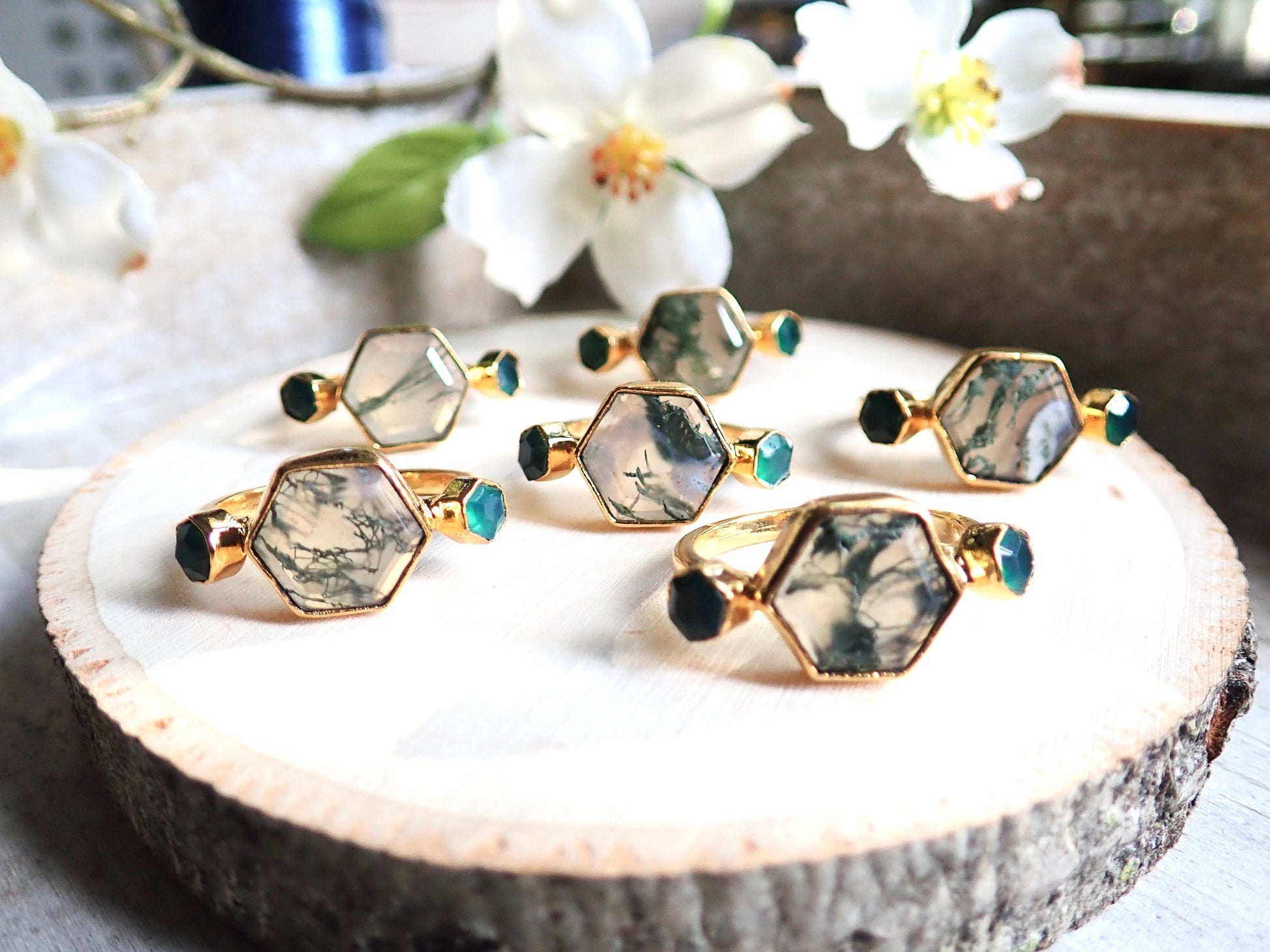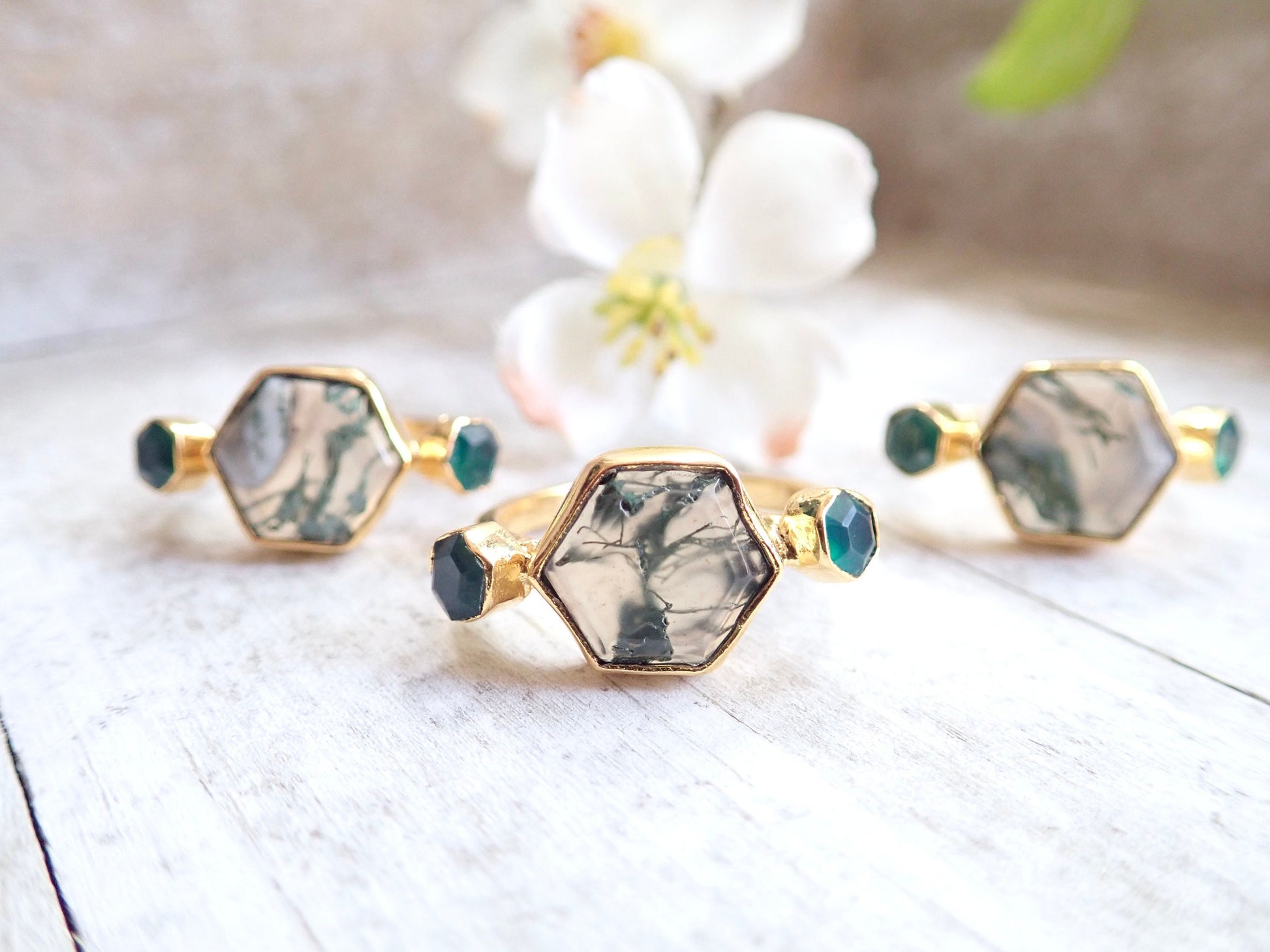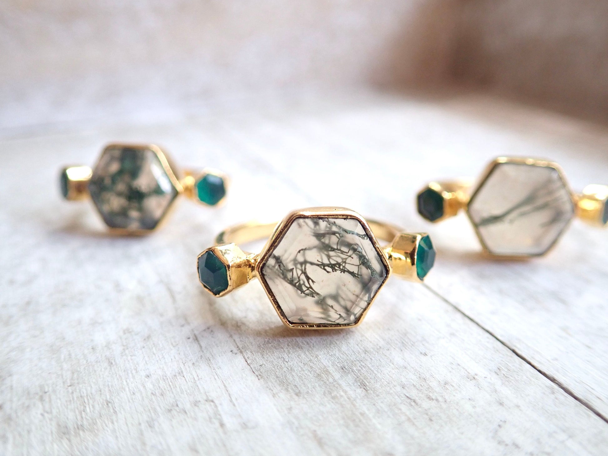 Beautiful and alluring genuine moss agate set with two shimmering green chalcedony gemstones in a 14k Gold Plated Bezel Ring. These stones have such a wonderful and natural beauty that inspires a connection to nature. Moss Agate is considered to be the stone of new beginnings and is all about attracting abundance and tapping into deep-set creativity. Such a beautiful and unique gemstone. It can be clear to milky white, with dendritic inclusions of manganese or iron that have grown into patterns similar to moss or lichen, giving these a super organic feel. Metaphysically, some believe moss agate to be a stabilizing and strengthening influence. Agate is excellent for balancing emotional, physical and intellectual energy and is connected to the heart chakra.