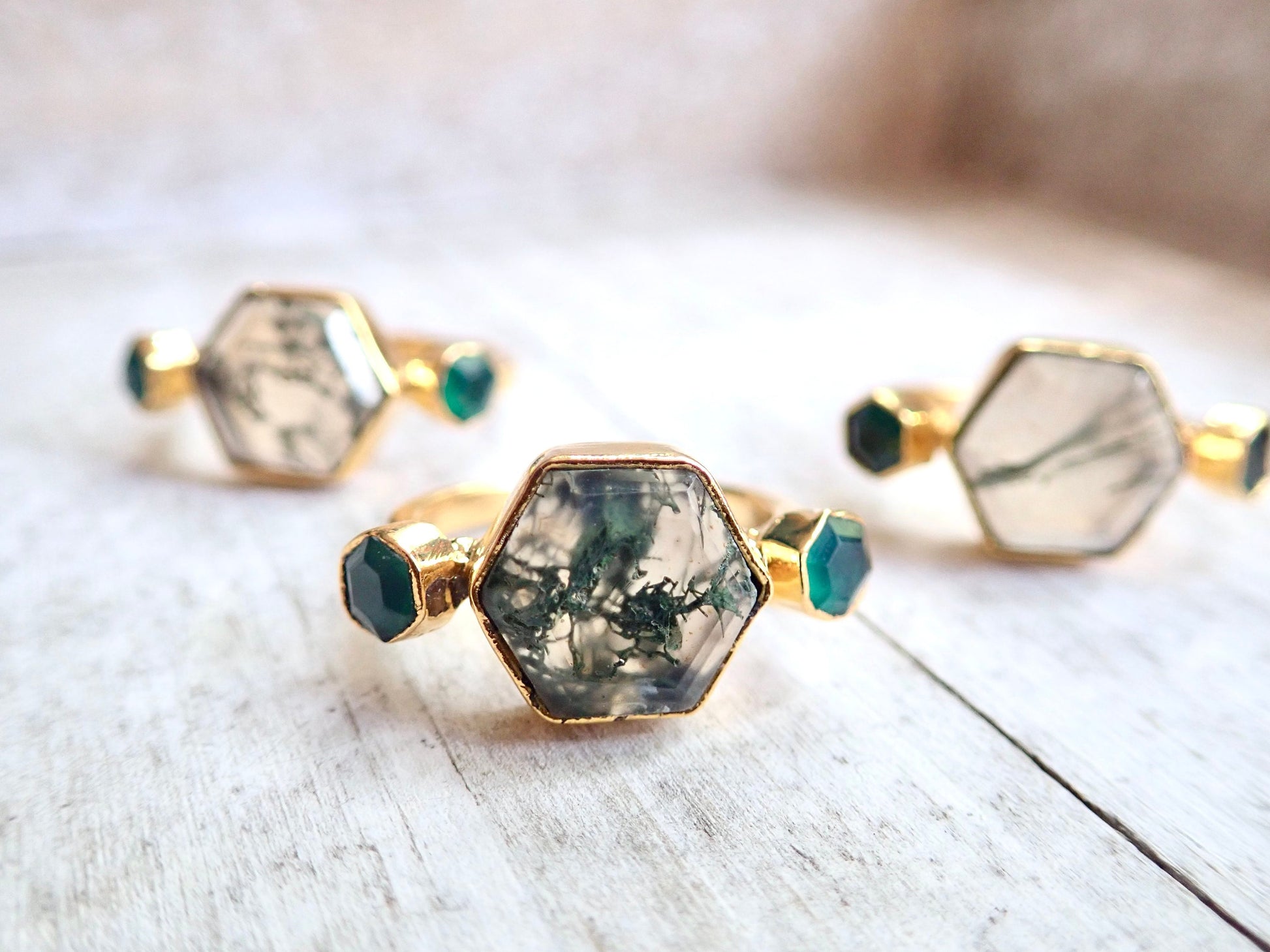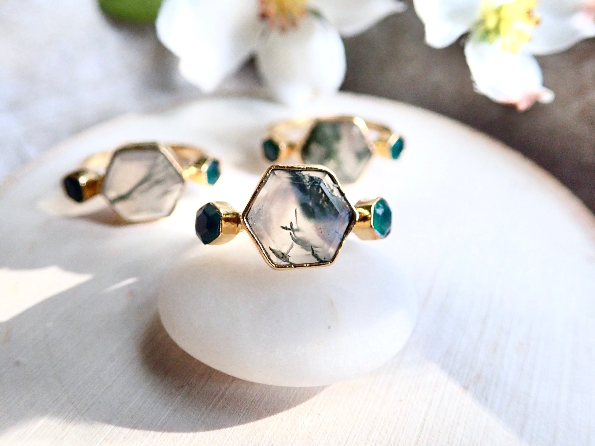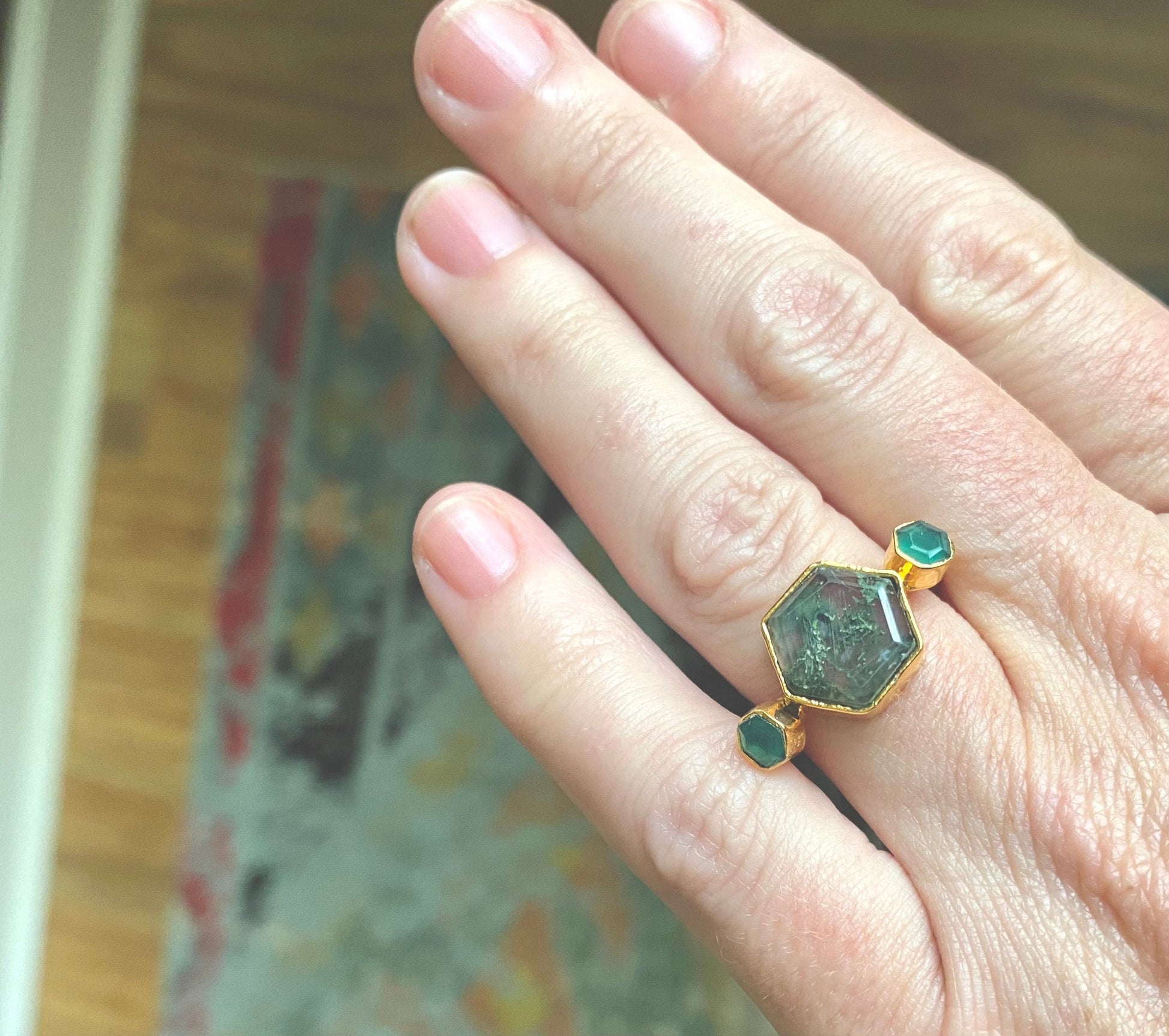 ★14k Gold Plated Band is 2mm thick and set with two dainty green chalcedony stones and a center hexagon-cut moss agate