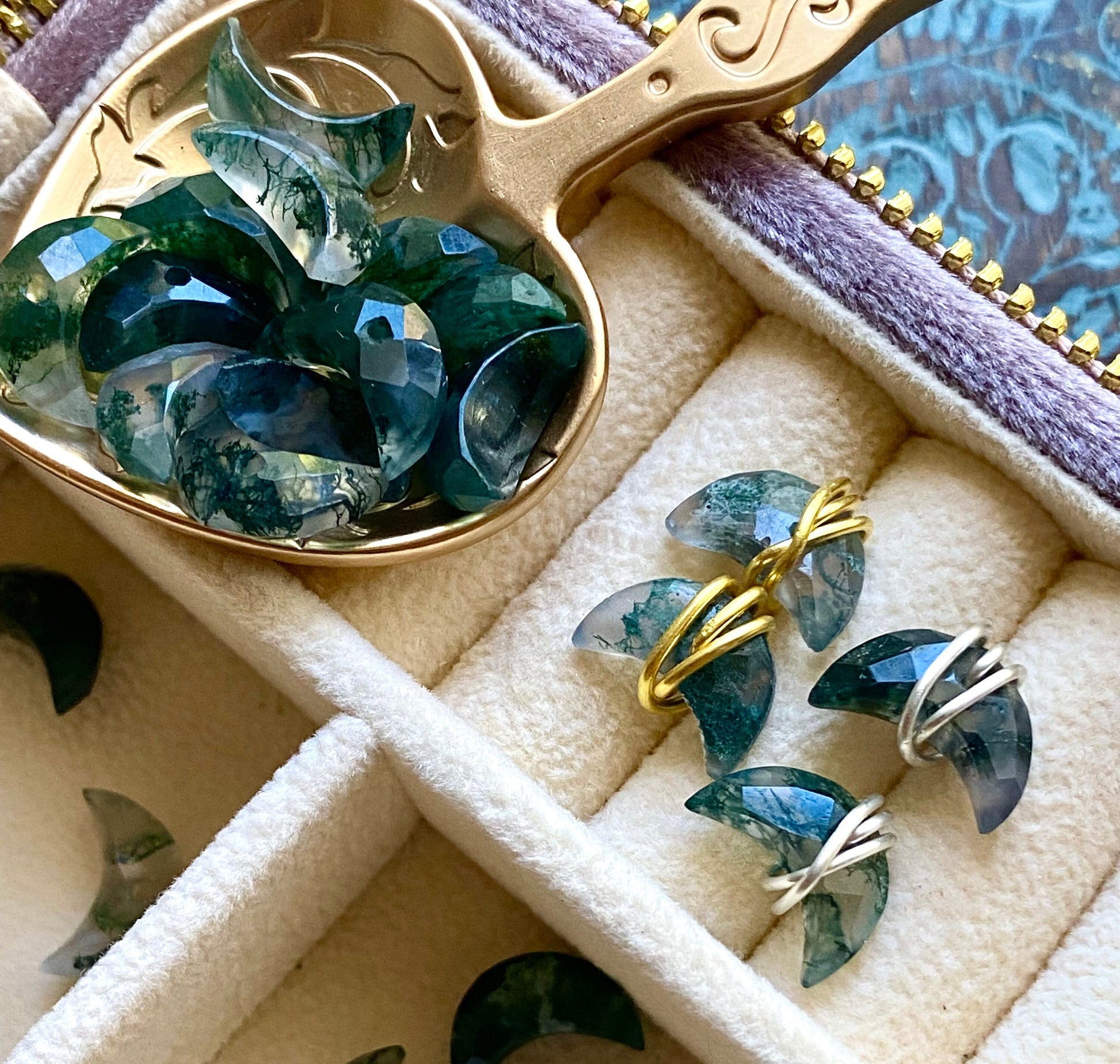 Beautiful and alluring genuine moss agate, cut into a faceted crescent moon is hand wire-wrapped onto your choice of either genuine 14k gold plated posts or hypo-allergenic genuine 14k gold vermeil posts (14k gold plated over solid sterling silver), solid sterling silver, gold plated or silver plated. These raw crystals have such a wonderful and natural beauty that inspires a connection to nature. The captivating moss agate gemstones evoke the tranquil allure of a lush forest, while the delicate crescent moon design adds a touch of celestial magic to your look. ✨🌳