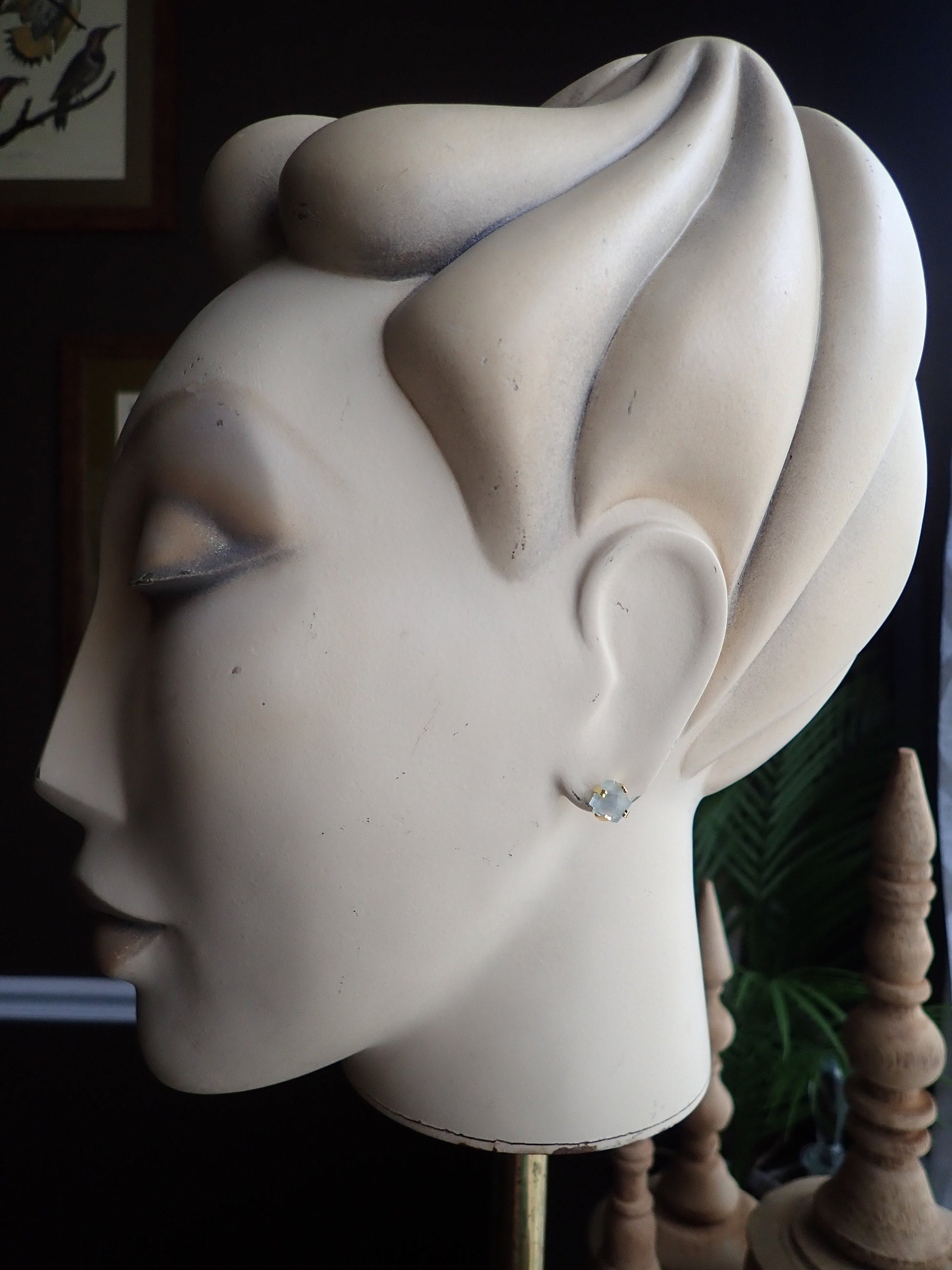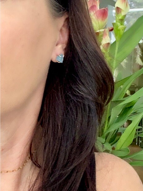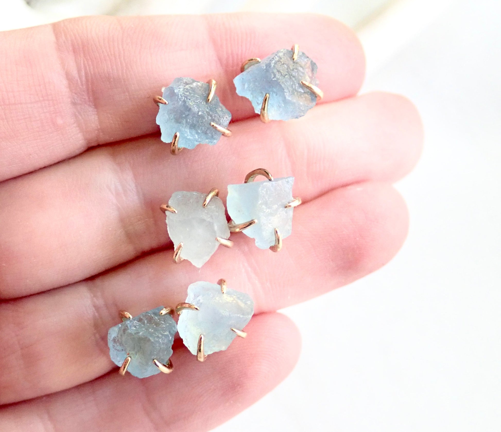 These everyday studs are made with genuine raw aquamarine crystals and prong-set in 14k gold over brass.