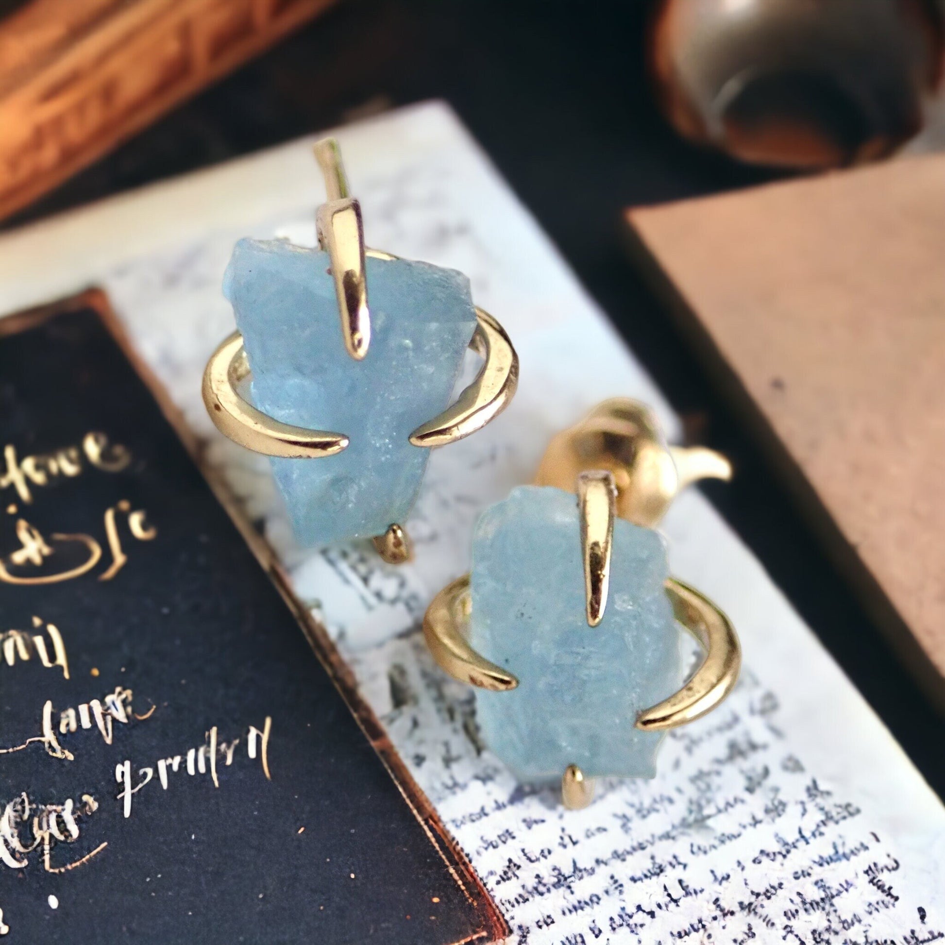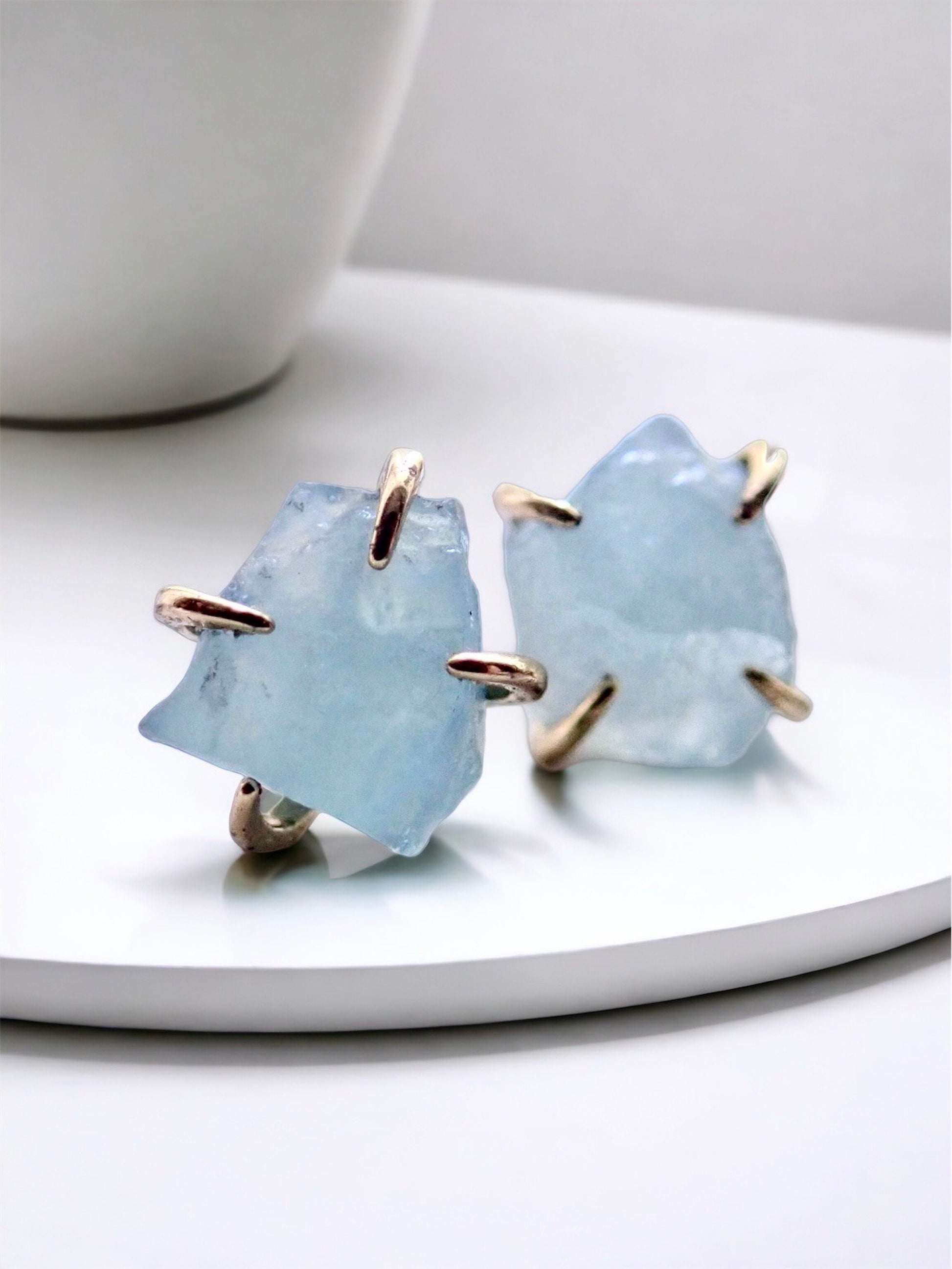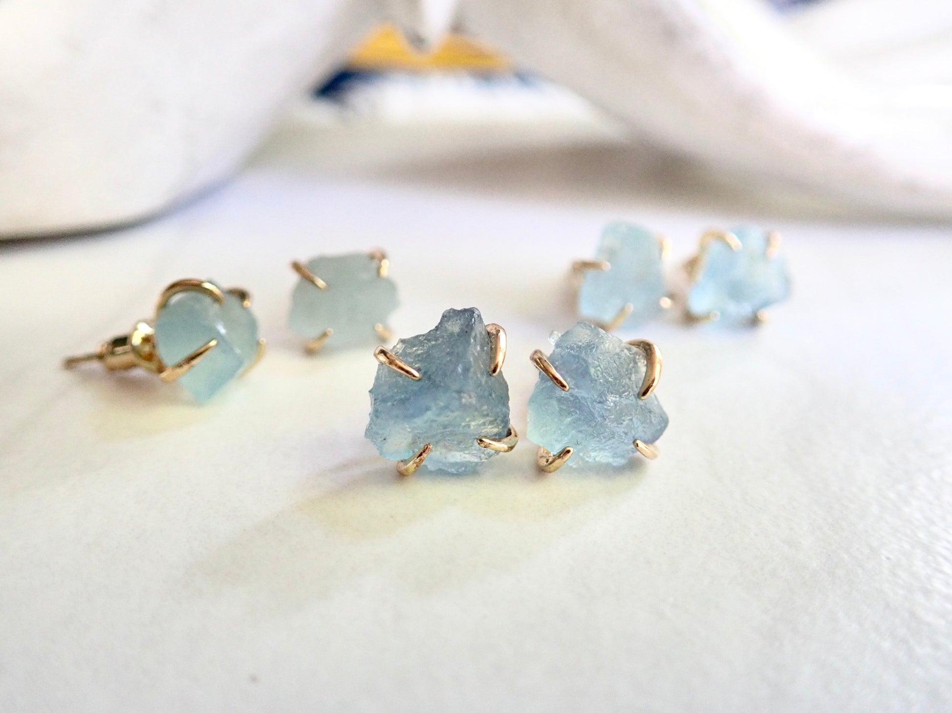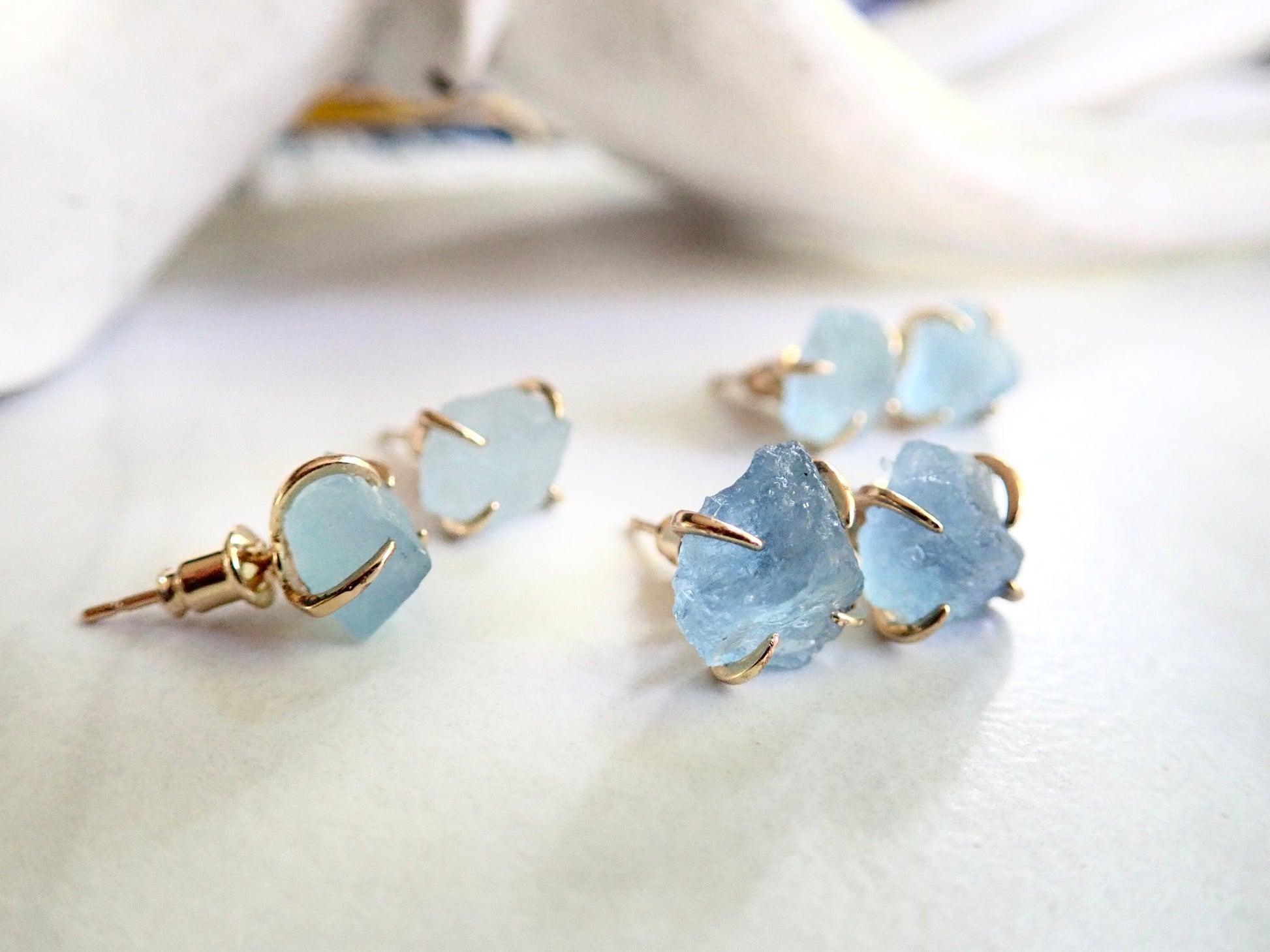 Gorgeous raw aquamarine crystal stud earrings prong-set in 14k gold. Aquamarine, the birthstone of March, has a calming, smoothing energy and has long been a symbol of youth, health and hope. Its mesmerizing color ranges from pale to medium blue.