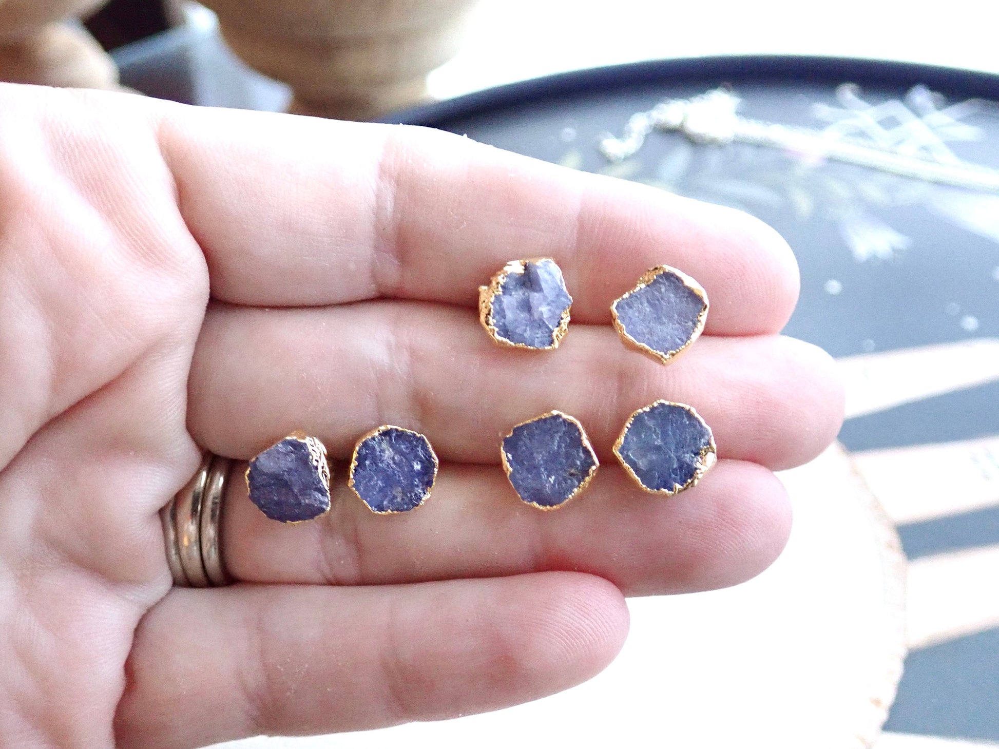 These raw tanzanite stud earrings feature natural, uncut tanzanite crystals electroplated in 14k gold vermeil (Solid Sterling Silver plated in gold). Each stone highlights the beautiful violet-blue shades tanzanite is known for, giving a natural and earthy touch to a classic stud style.