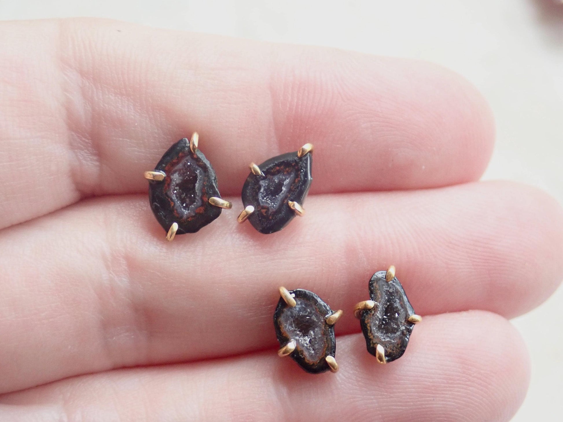 Geodes are natures little surprises. Geodes are rocks that are plain on the outside but have beautiful crystals on the inside, grown over millennia. Each geode is different so every pair of earrings is unique. Super lightweight and versitile. Each geode is prong-set in 24k gold over brass.