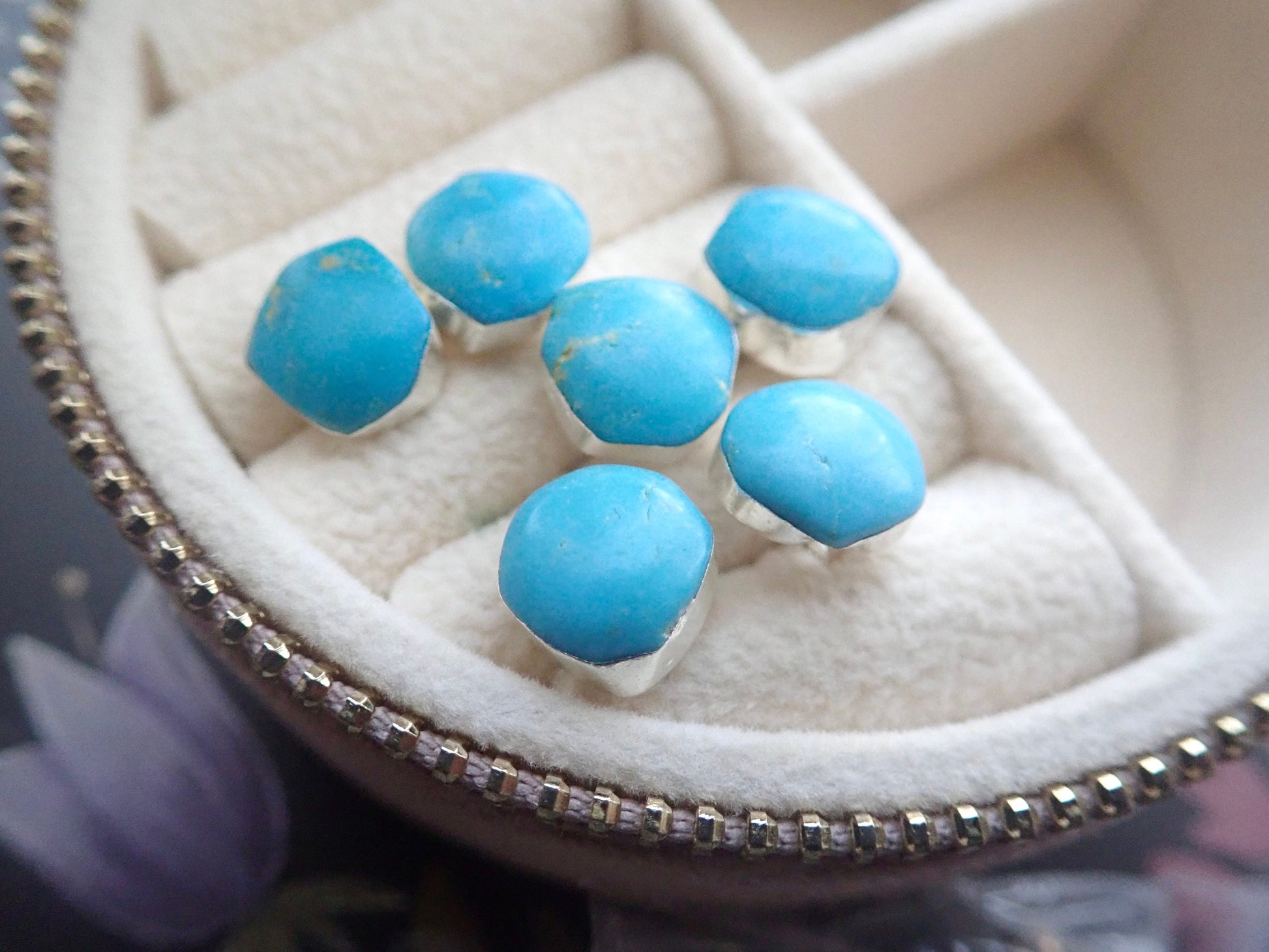 Each set is unique and varies in color and shape as can be seen in the photos. Sold as a pair, with each earring including the turquoise stud, the hammered hoop that fits onto the stud, and the earring back to hold them firmly in place. Wear the stud alone or add the included hoop...