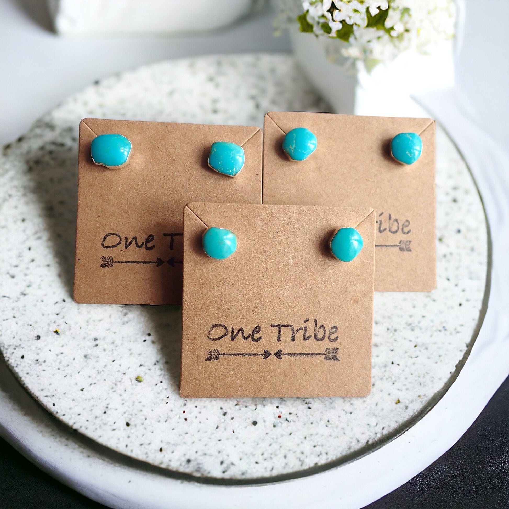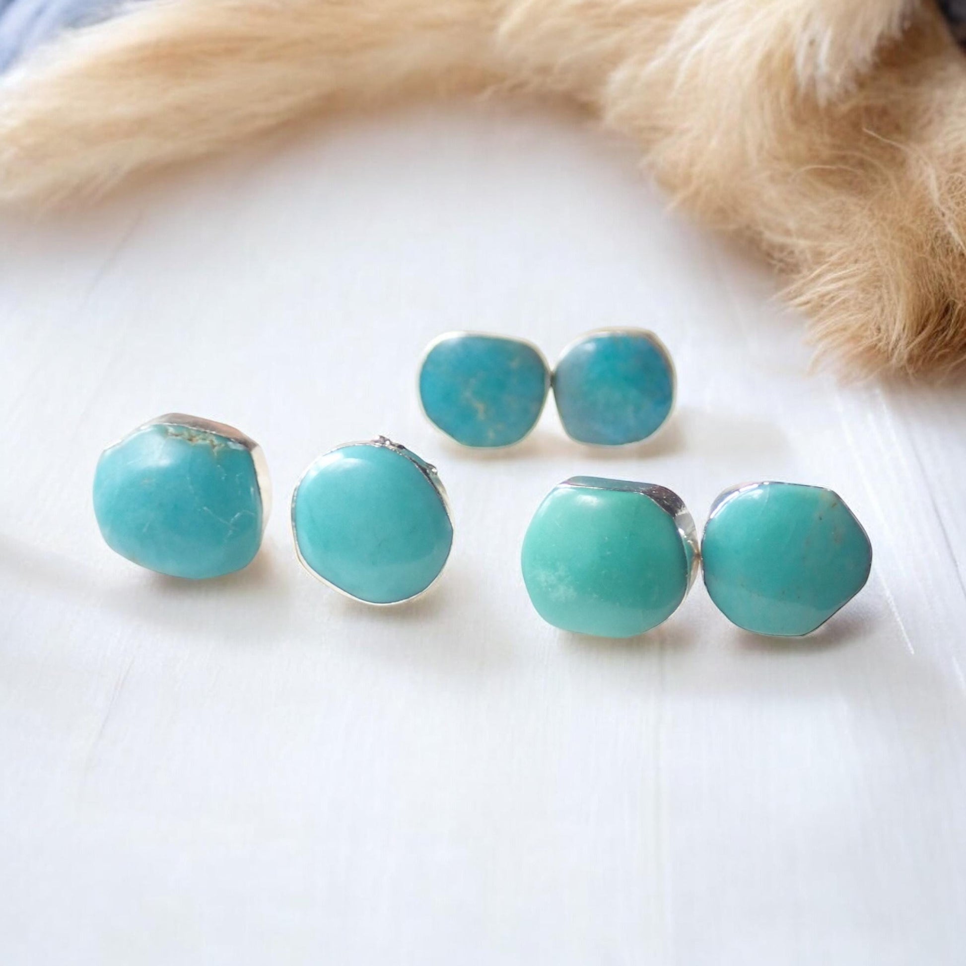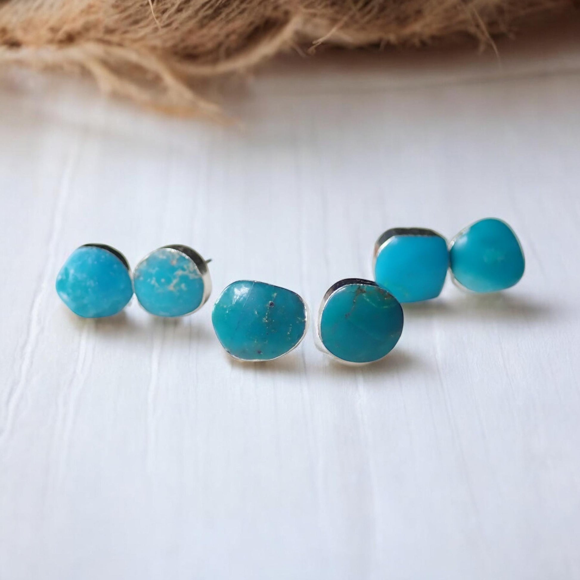 These handcrafted turquoise stud earrings are made with natural, freeform turquoise stones electroplated in silver. Each pair features unique organic shapes and vibrant blue-green hues, making them a one-of-a-kind addition to your jewelry collection.