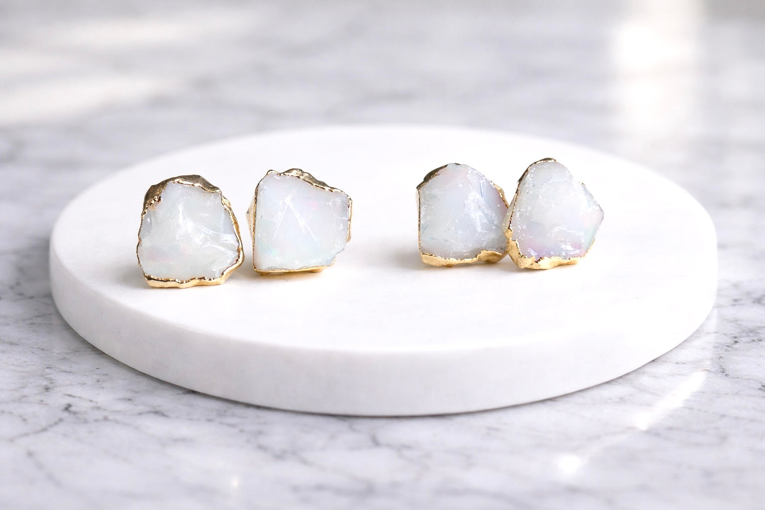 Each of the stones we use to create these special earrings were formed by nature over millions of years. Each one is unique and beautiful just like nature itself. They will vary one to another, just like Mother Nature intended. We don't treat our stones in any way and accept their rough and "imperfect" beauty and try to highlight their uniqueness in our plating process. We don't polish away "flaws" in the stones but rather leave them in their natural state. The pair you receive will be what nature intended that stone to be and may be lighter or darker, clear or more opaque, smooth or rough, rounded or angular. Just like people, each stone has special characteristics unique to itself and in that lies the beauty.