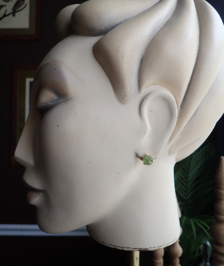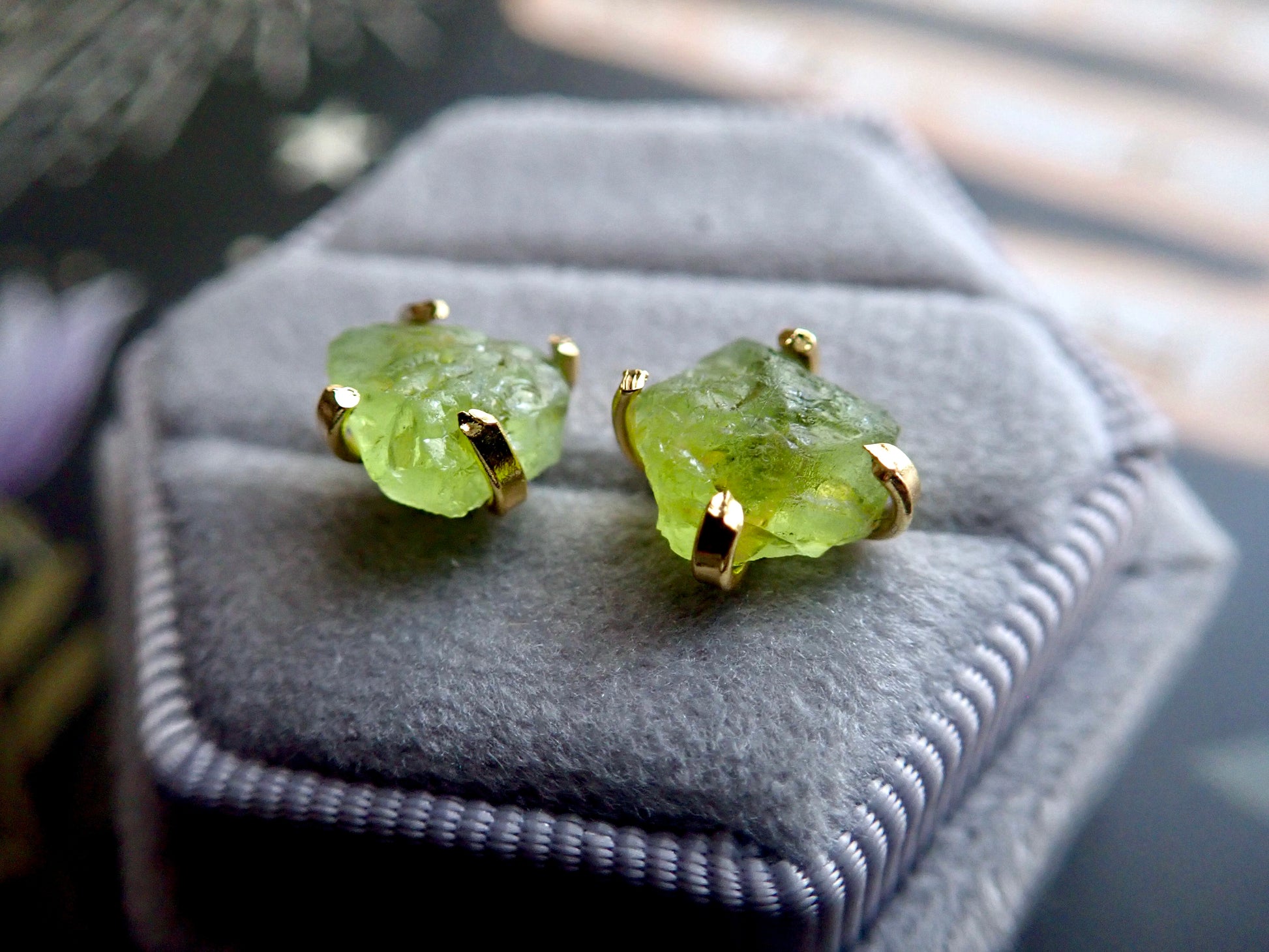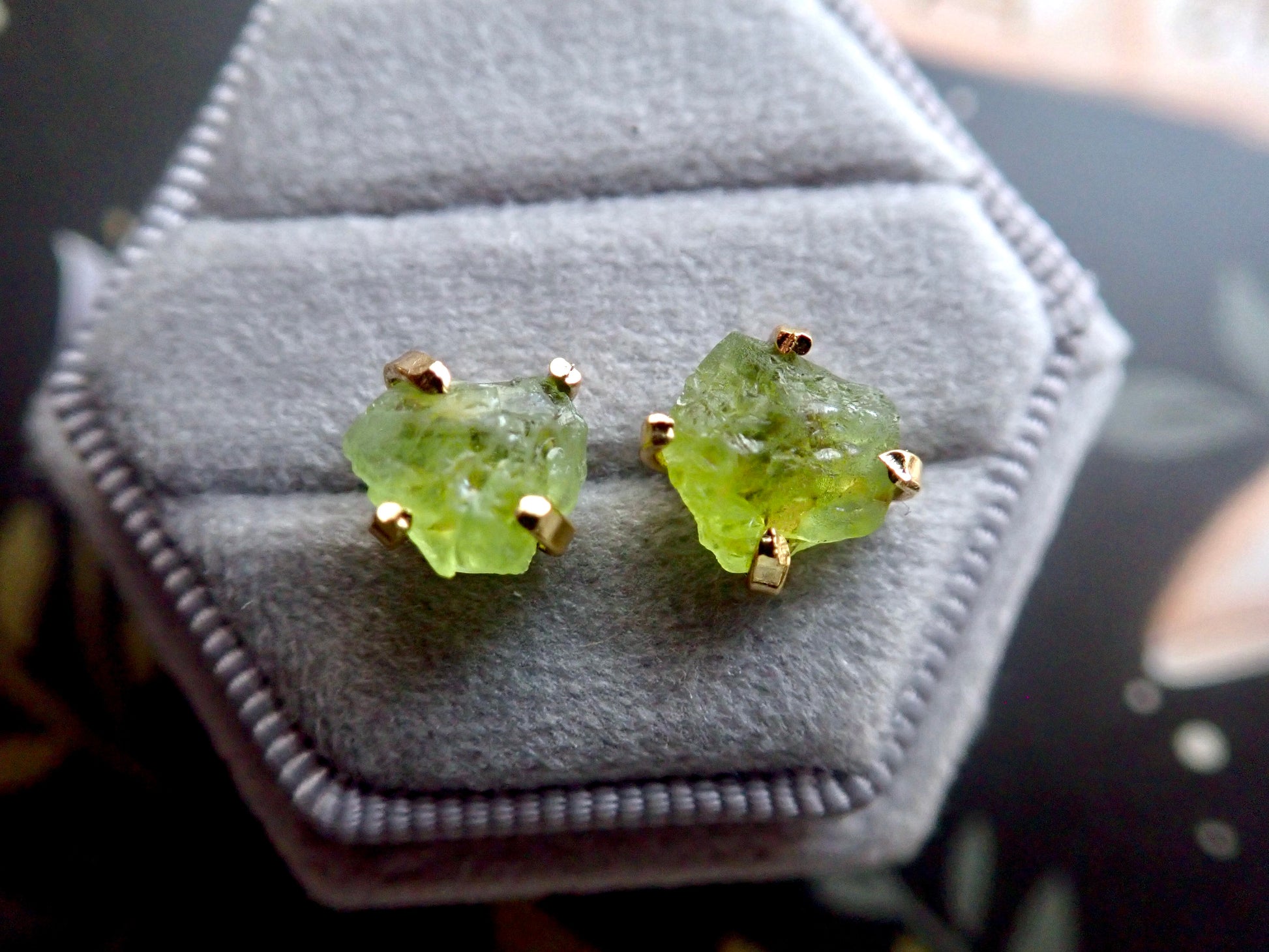 Gorgeous little raw peridot stud earrings prong-set in 14k plated over brass.