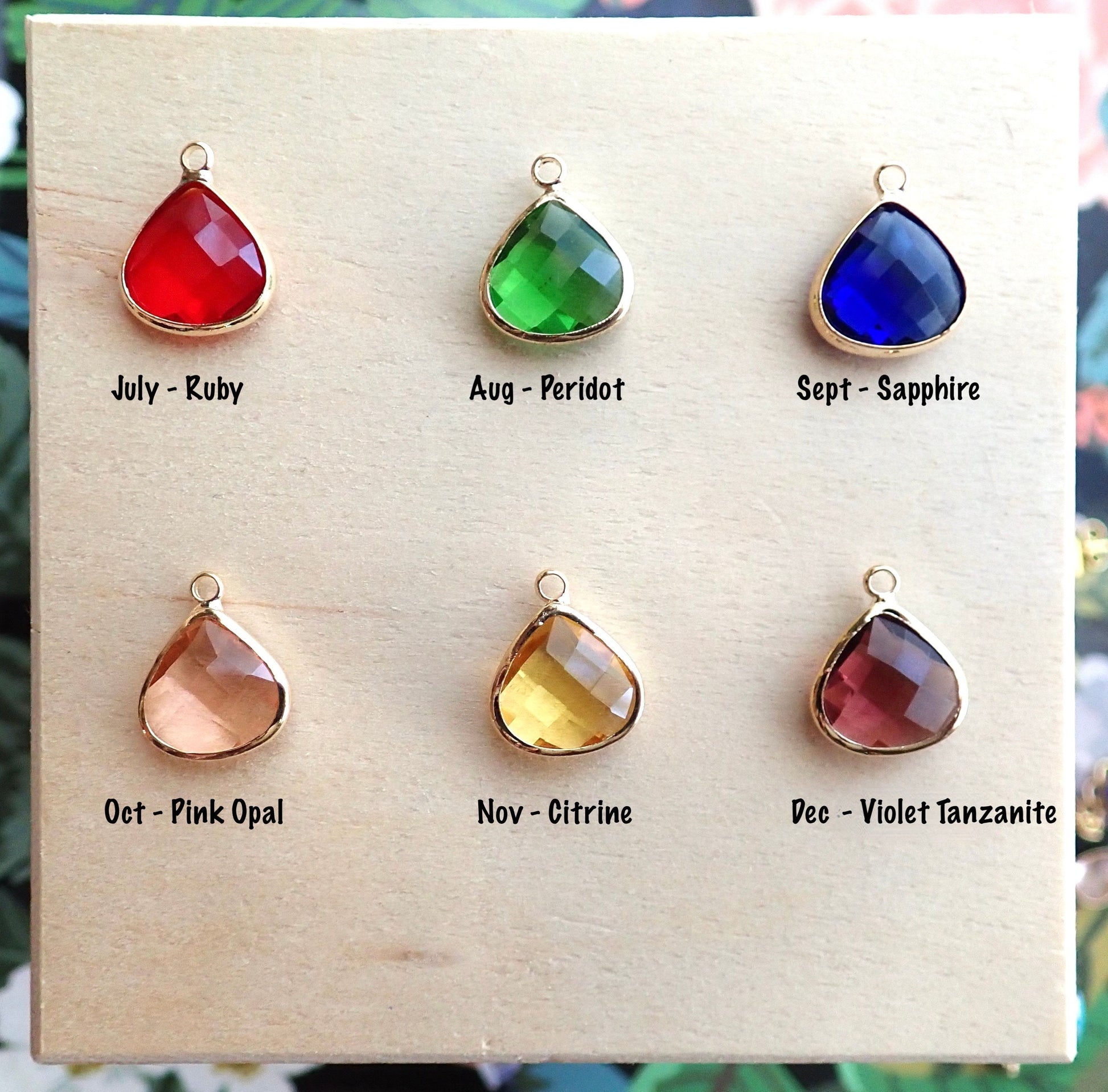 *BIRTHSTONES* January ... Hyacinth Crystal( Burnt Orange Color) or Garnet Red (same color crystal as July's Ruby) February... Purple Amethyst Crystal March ... Aquamarine Crystal April ... Clear Crystal May ... Green Emerald Crystal June ...Lilac Alexandrite Crystal July ... Ruby Red Crystal August ... Peridot Green Crystal September ... Sapphire Blue Crystal October... Pink Opal Crystal November ... Yellow Citrine December... Violet Tanzanite