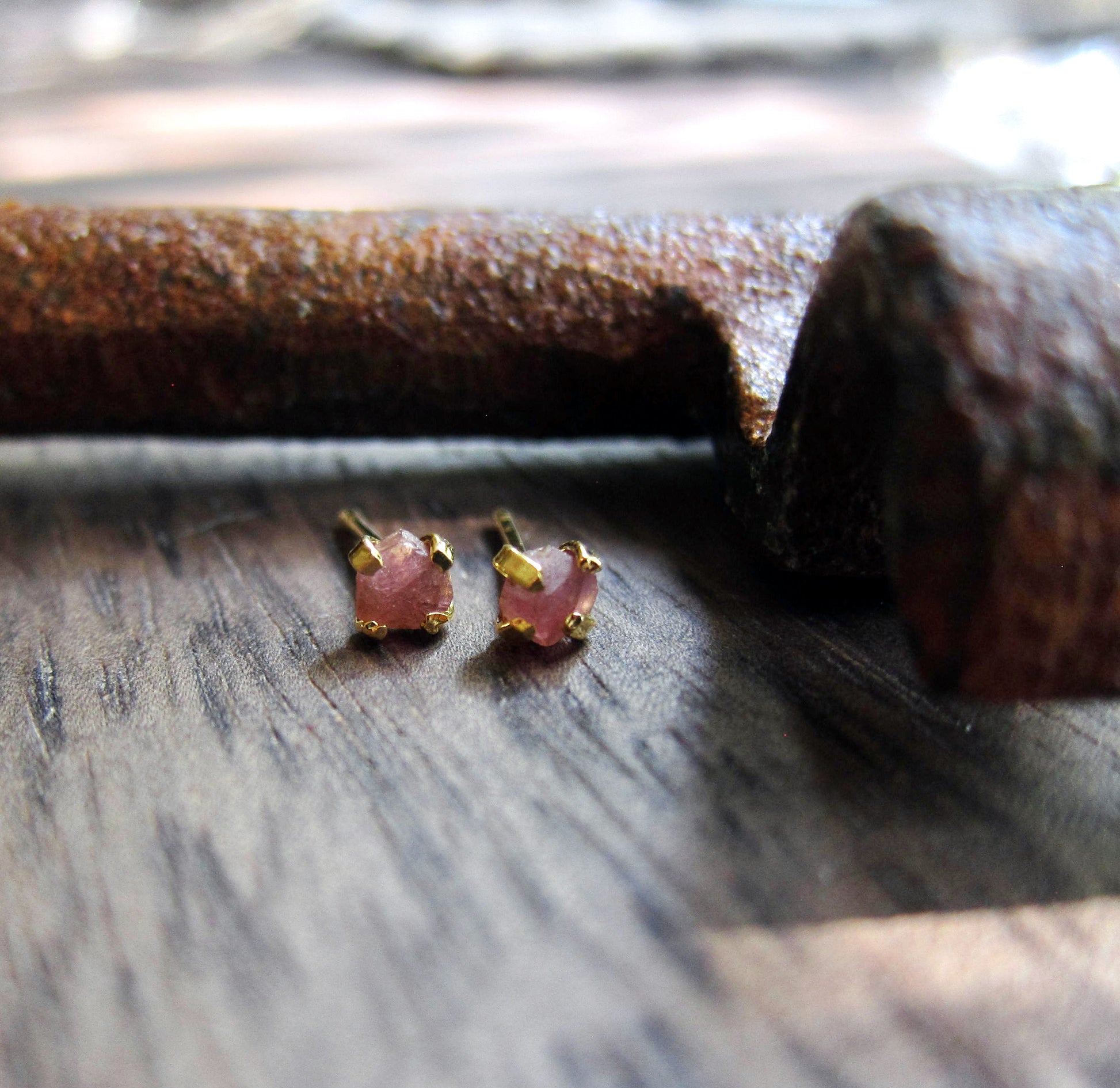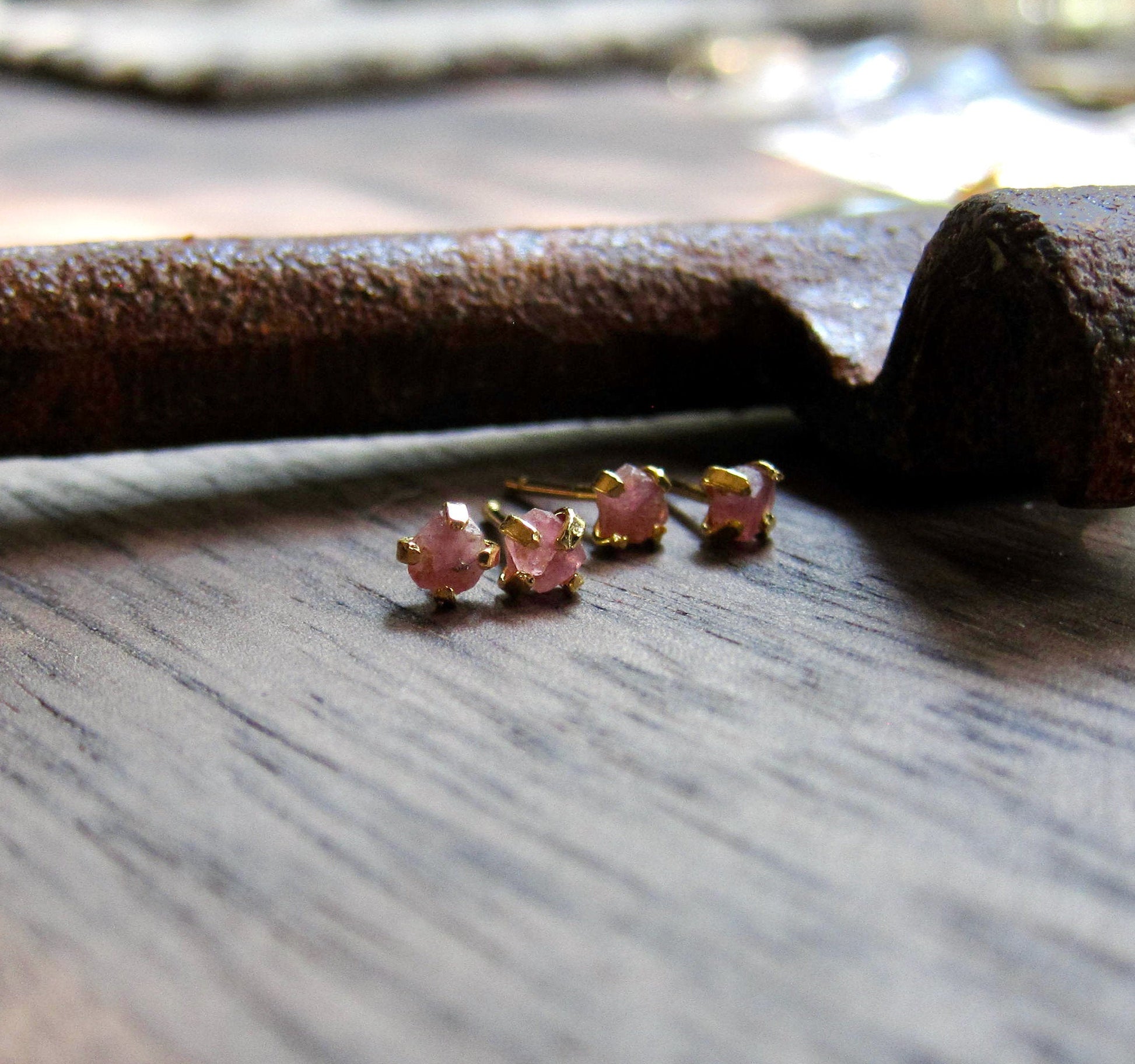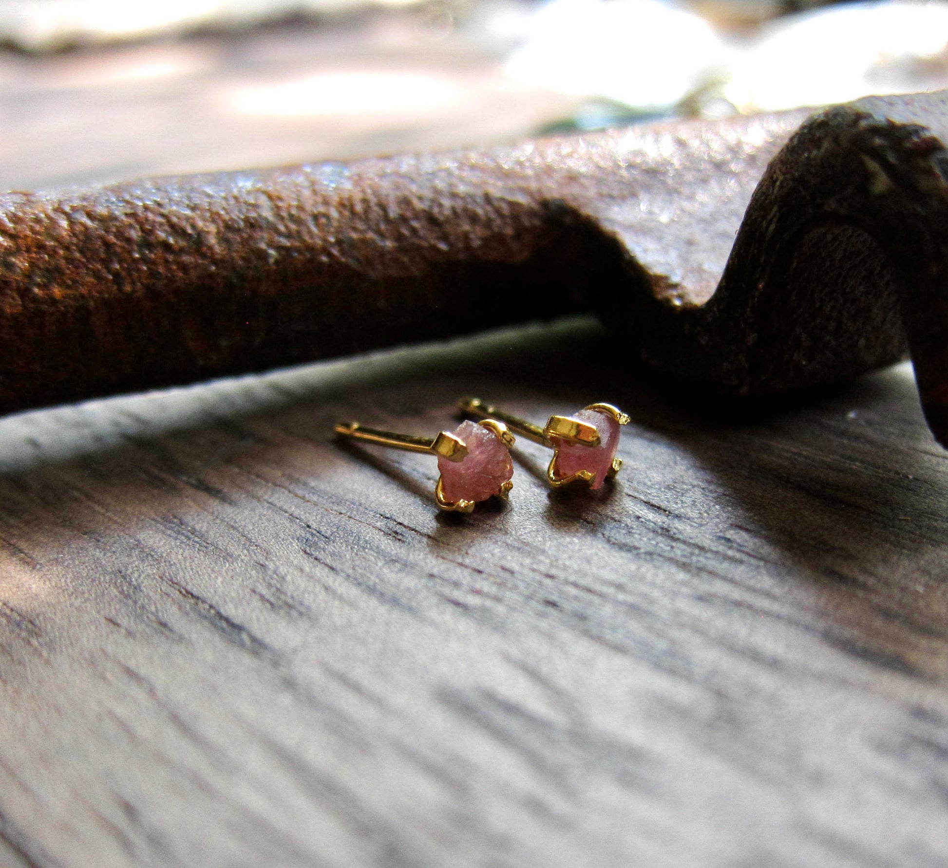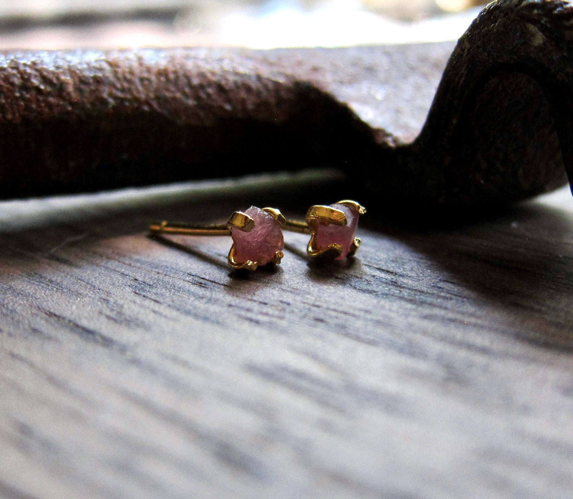 Gorgeous raw pink tourmalines shine set in these 14k gold plated stud earrings. So simple and so perfect for everyday wear. These natural stones are all different but similar to photos and average about 3-4mm.