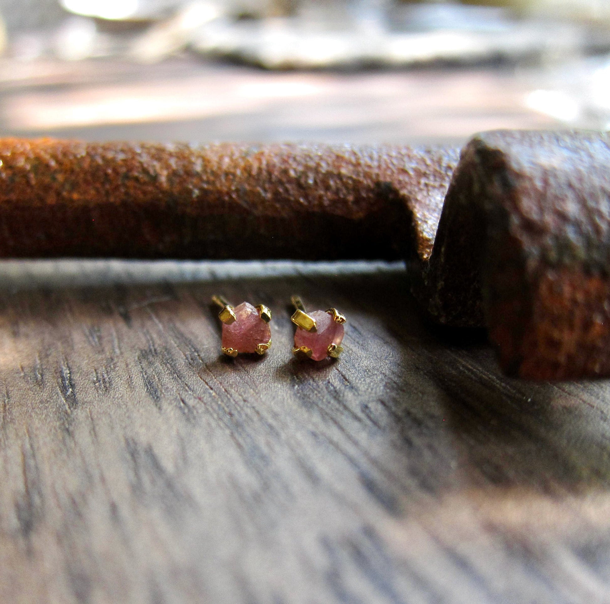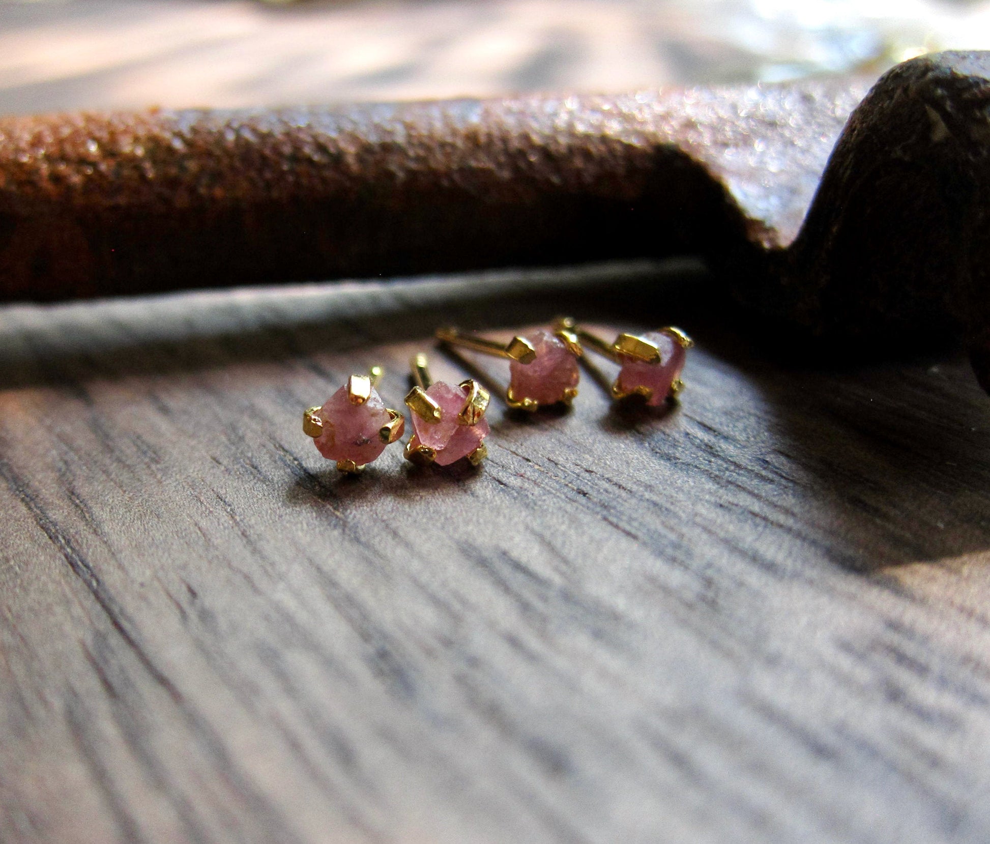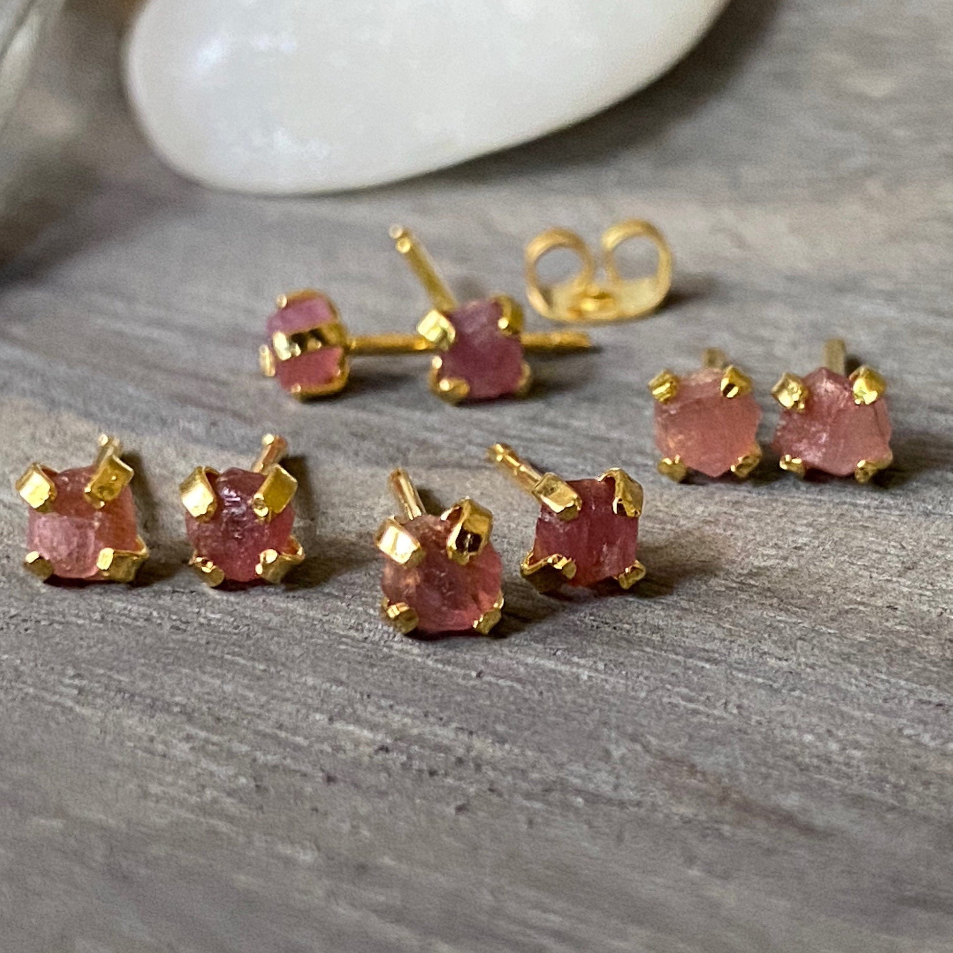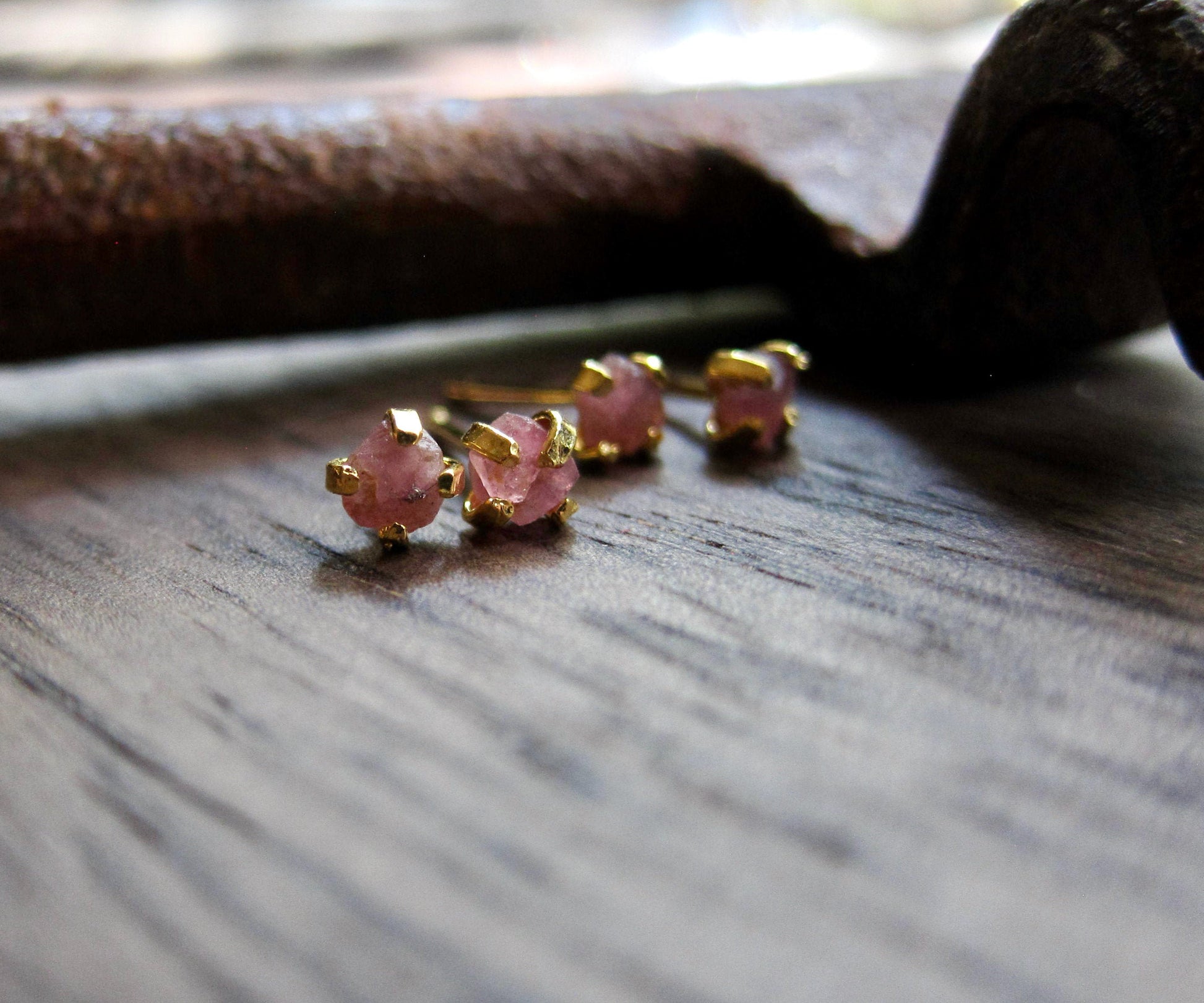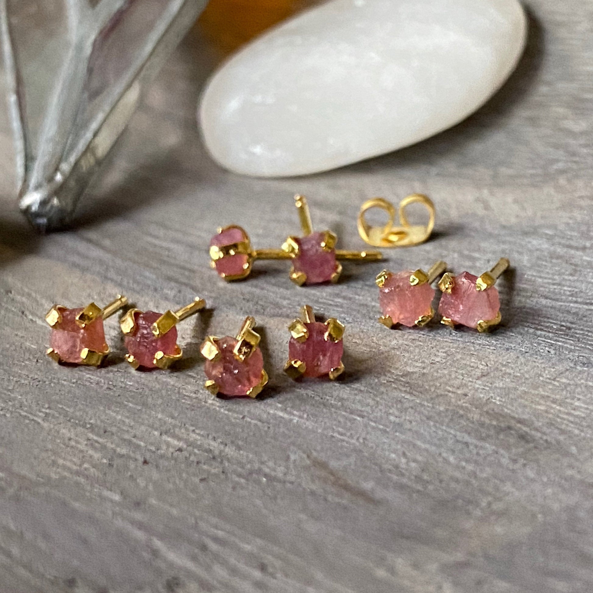 Gorgeous raw pink tourmalines shine set in these 14k gold plated stud earrings. So simple and so perfect for everyday wear. These natural stones are all different but similar to photos and average about 3-4mm.