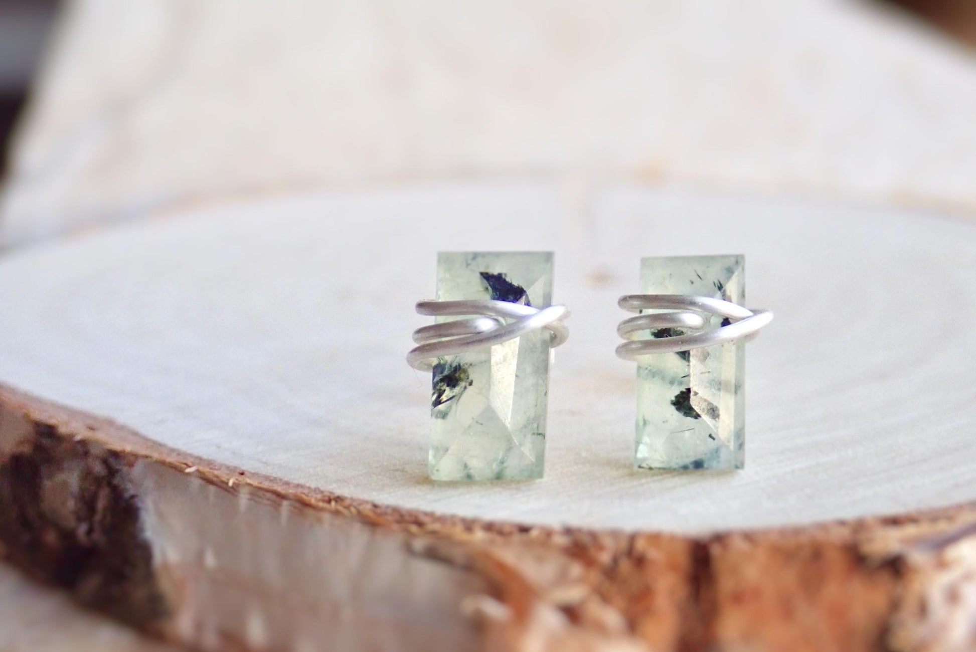 Add a touch of minimalist style to your jewelry collection with these stunning wire-wrapped moss prehnite gemstone stud earrings. Handcrafted with care, these earrings feature faceted rectangular baguette-shaped prehnite gemstones.
