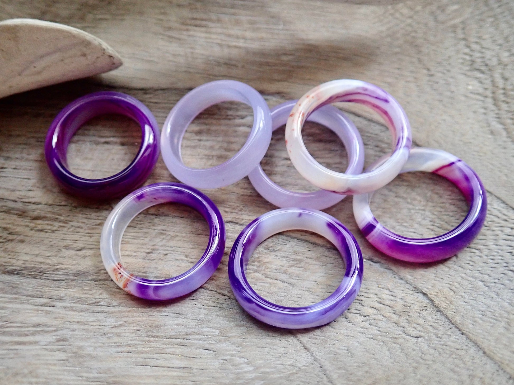 These rings are carved from one piece of purple banded agate. They're polished to a luscious smoothness, and slightly domed on top. Each ring is one-of-a-kind, just like us. These are the exact rings available. Listing is for one ring only.