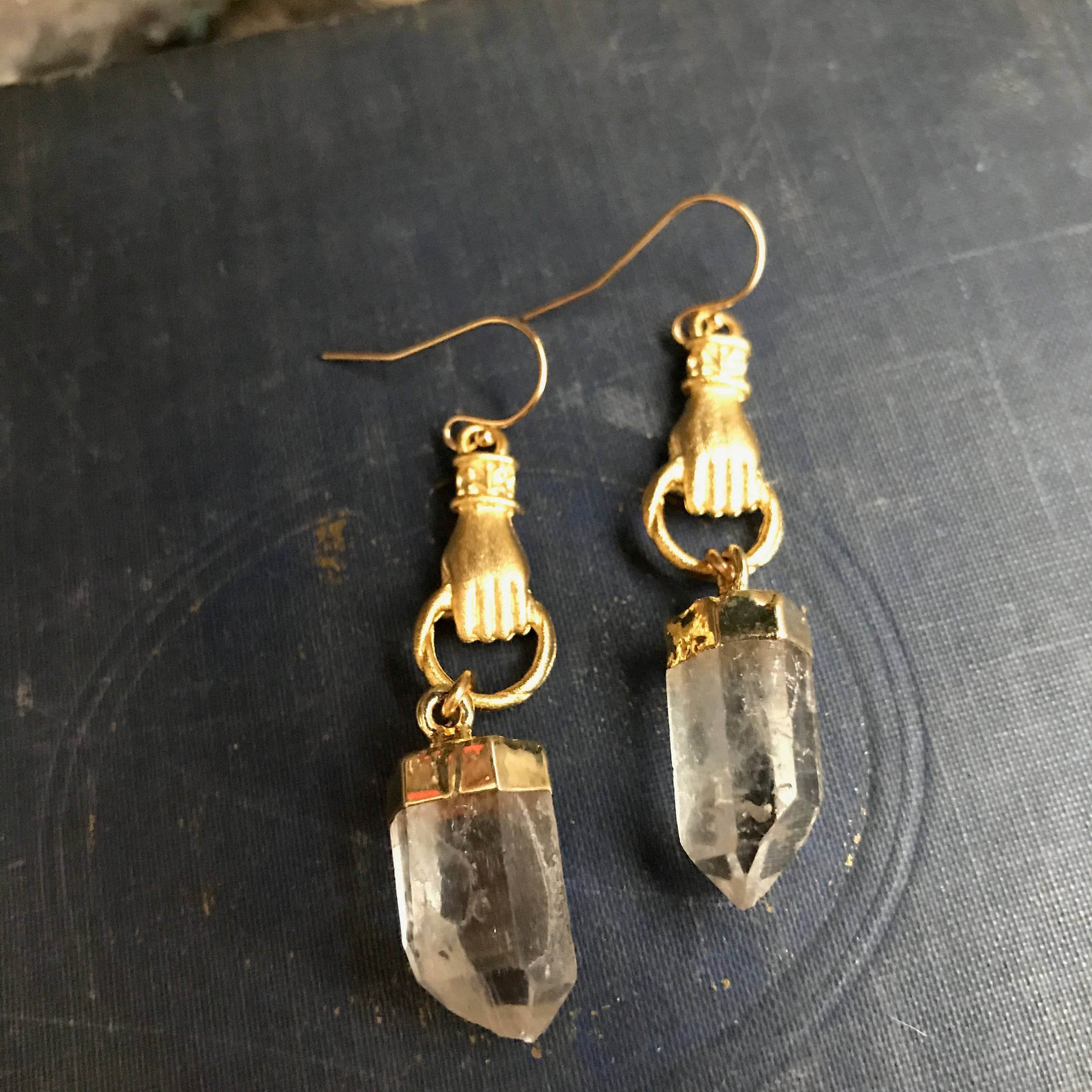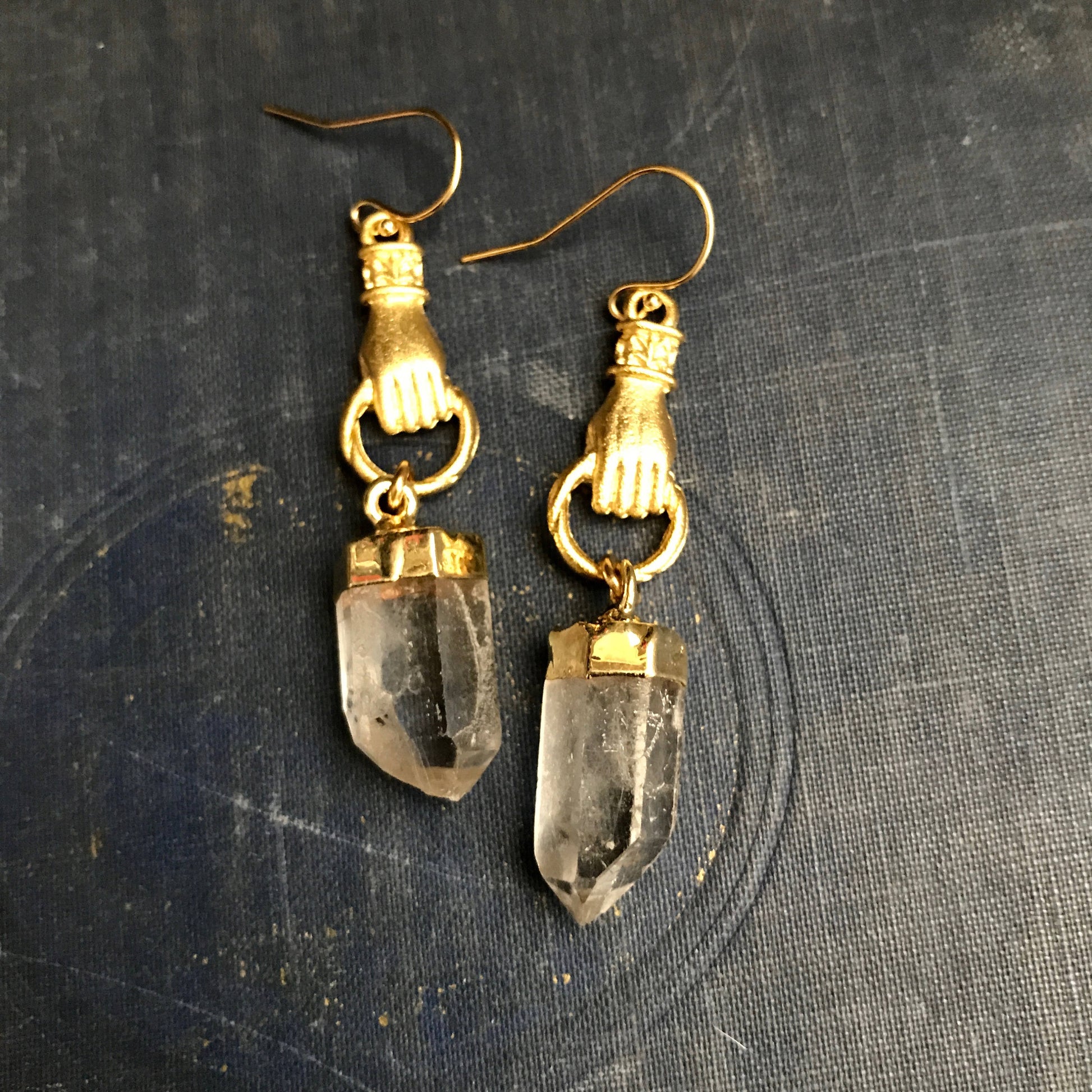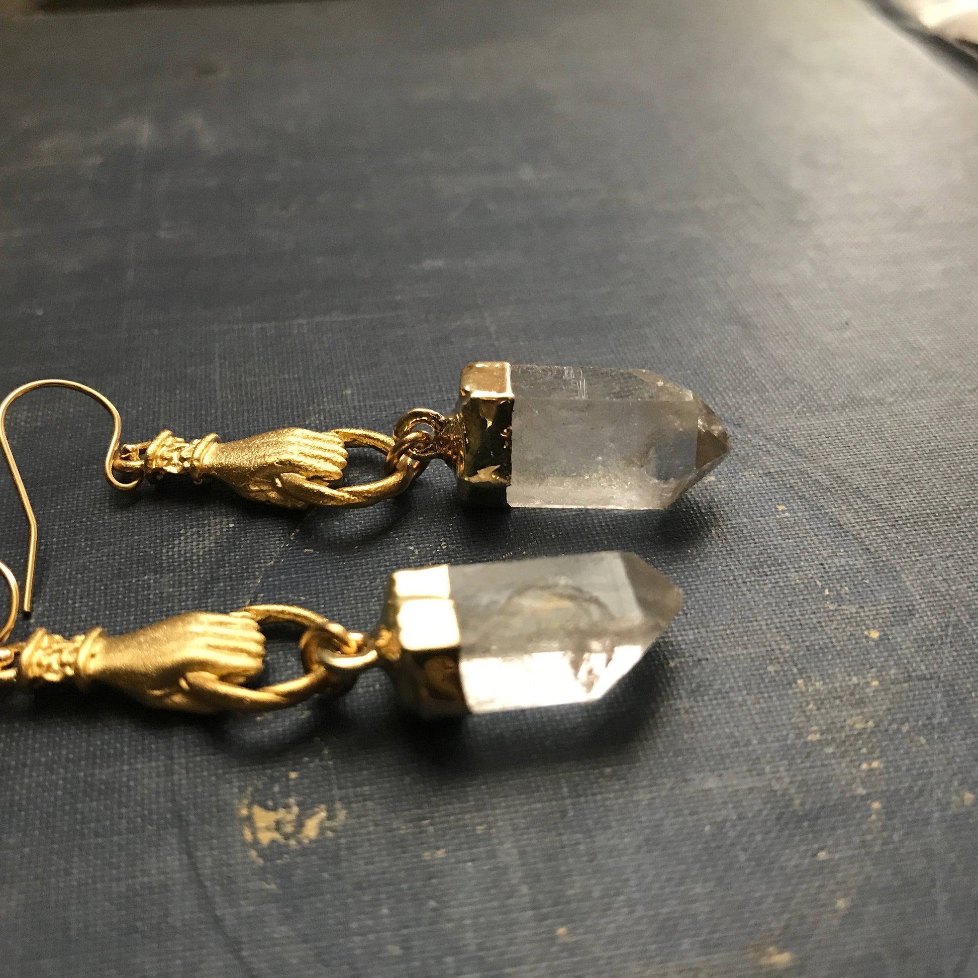 Mano Figa Earrings Inspired by my obsession with Mano Figa's these lovelies are brought to life in gold vermeil. Hands hold a ring and suspend gold dipped quartz points in these fabulous boho earrings.