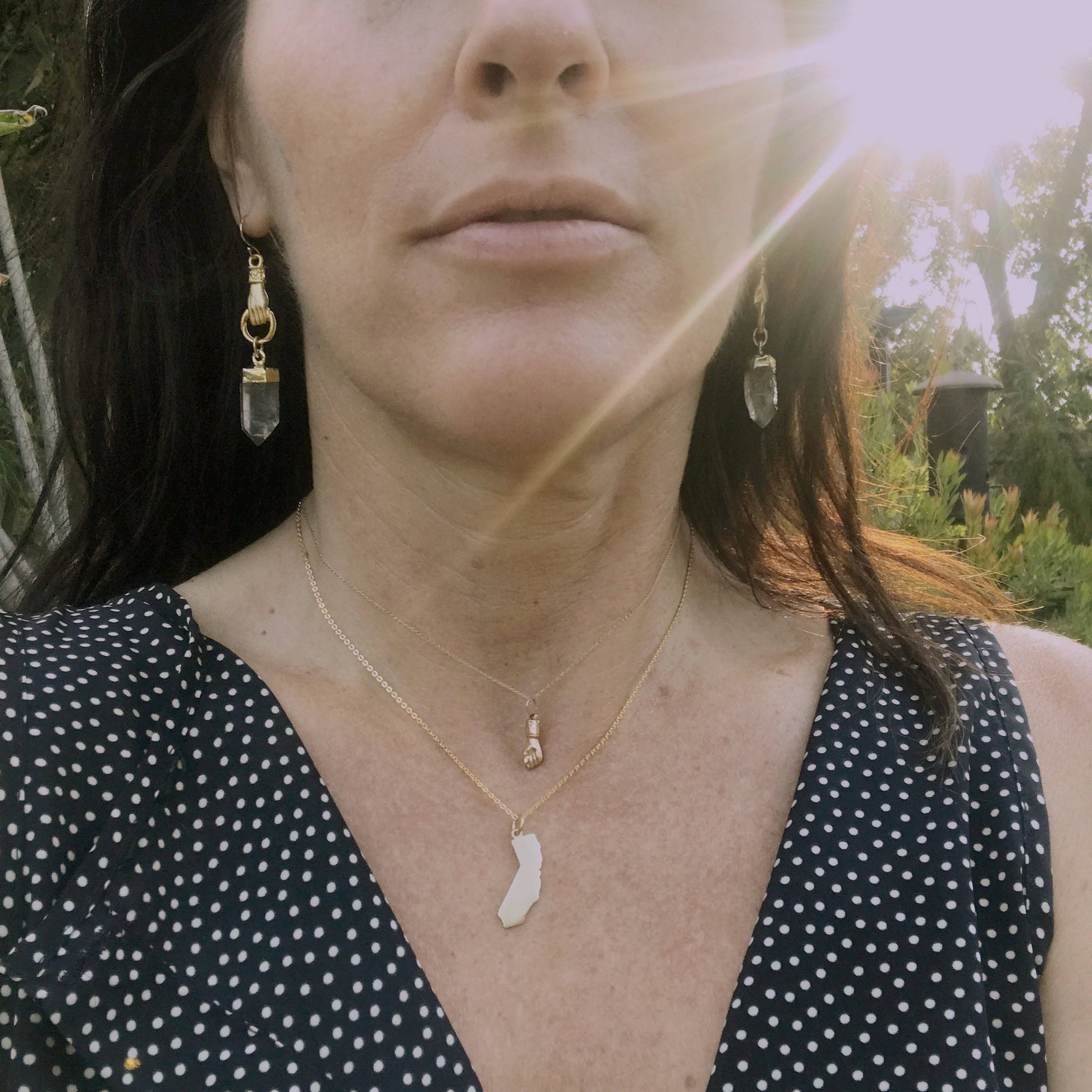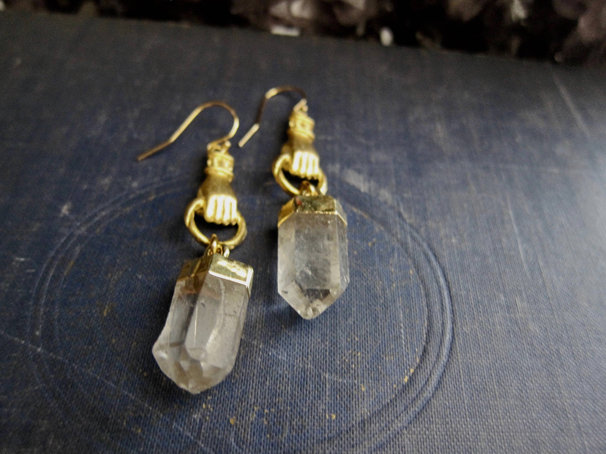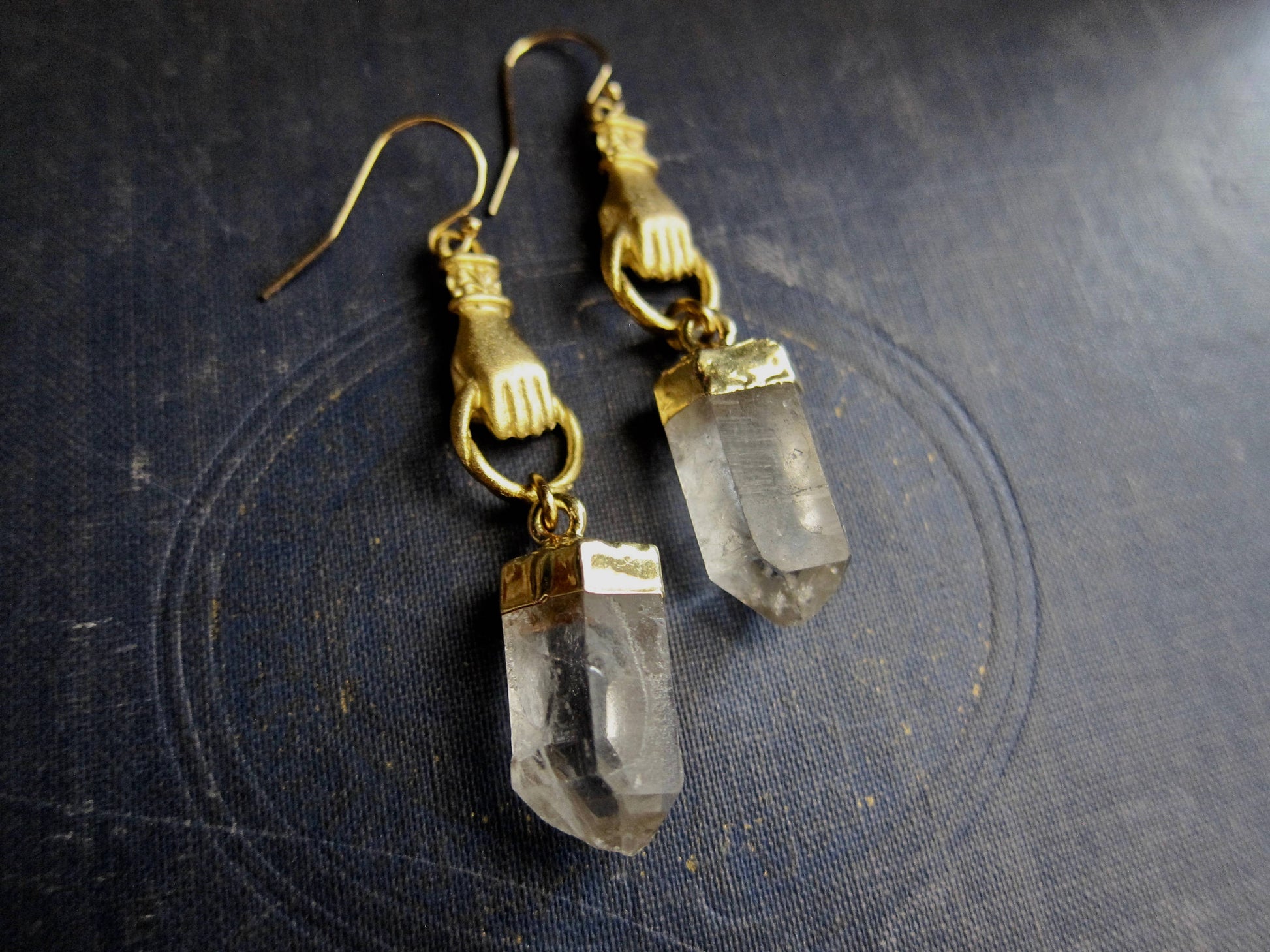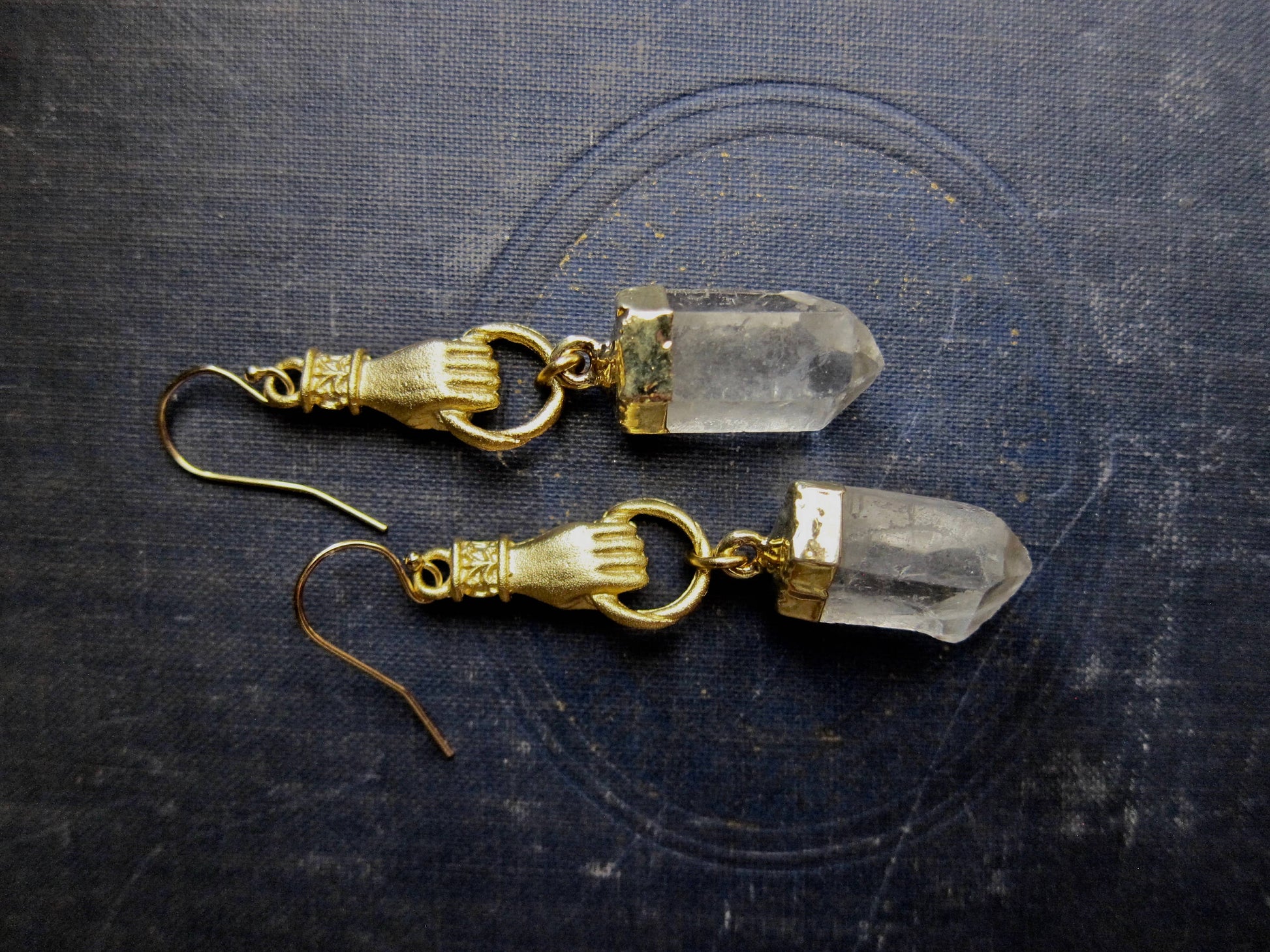 Mano Figa Earrings Inspired by my obsession with Mano Figa's these lovelies are brought to life in gold vermeil. Hands hold a ring and suspend gold dipped quartz points in these fabulous boho earrings.