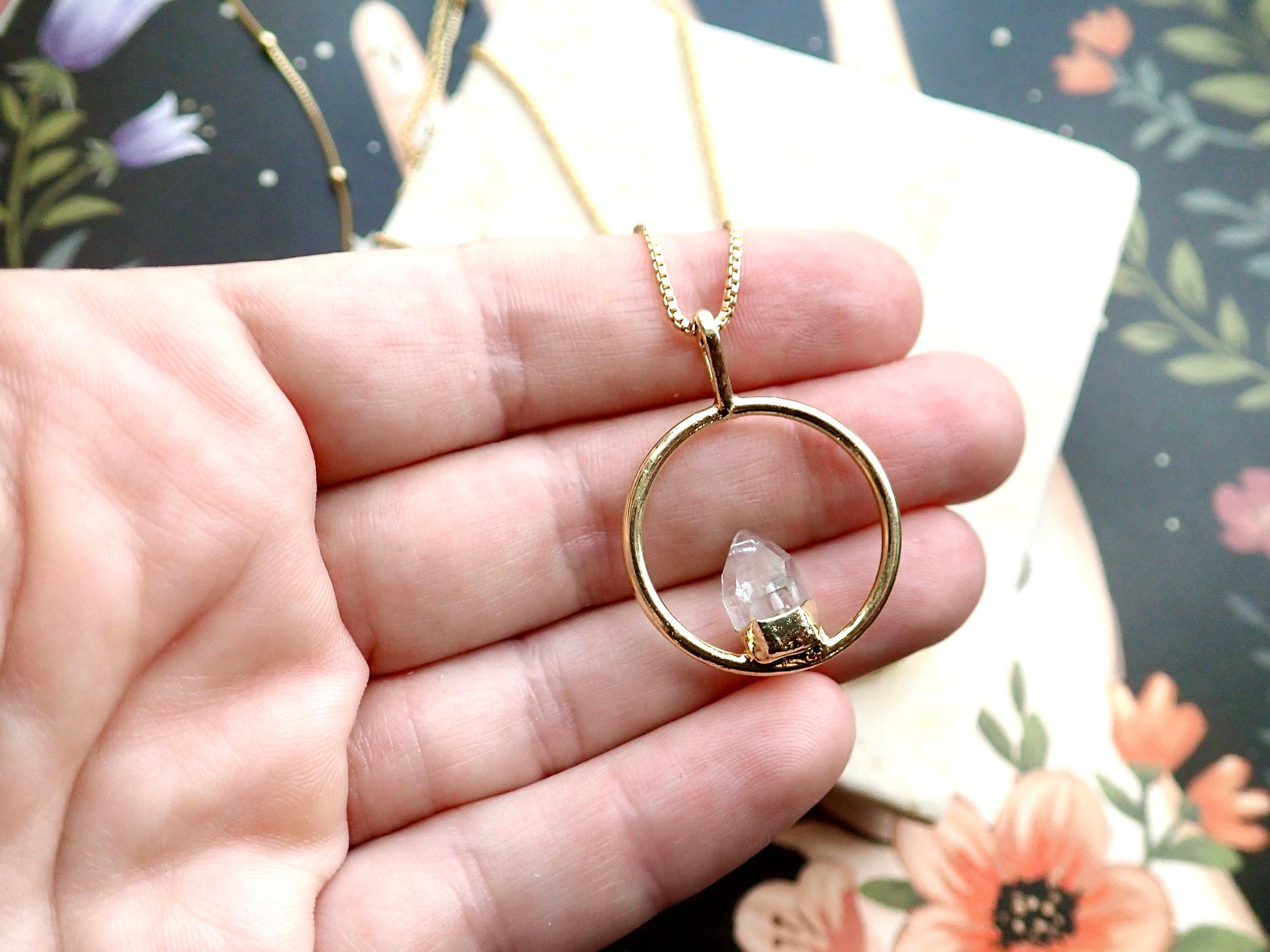 Quartz Crystal Point Necklace – Round Frame Pendant, Boho Style