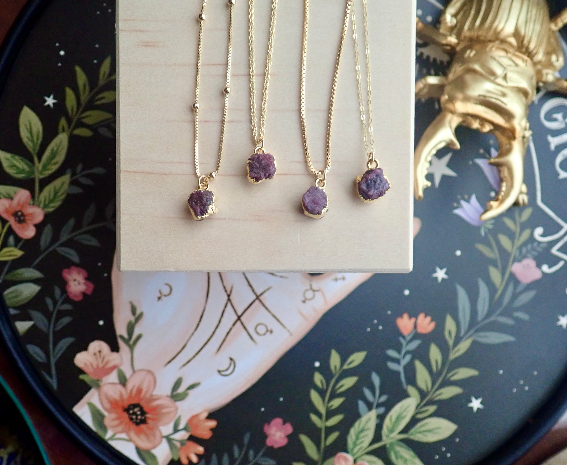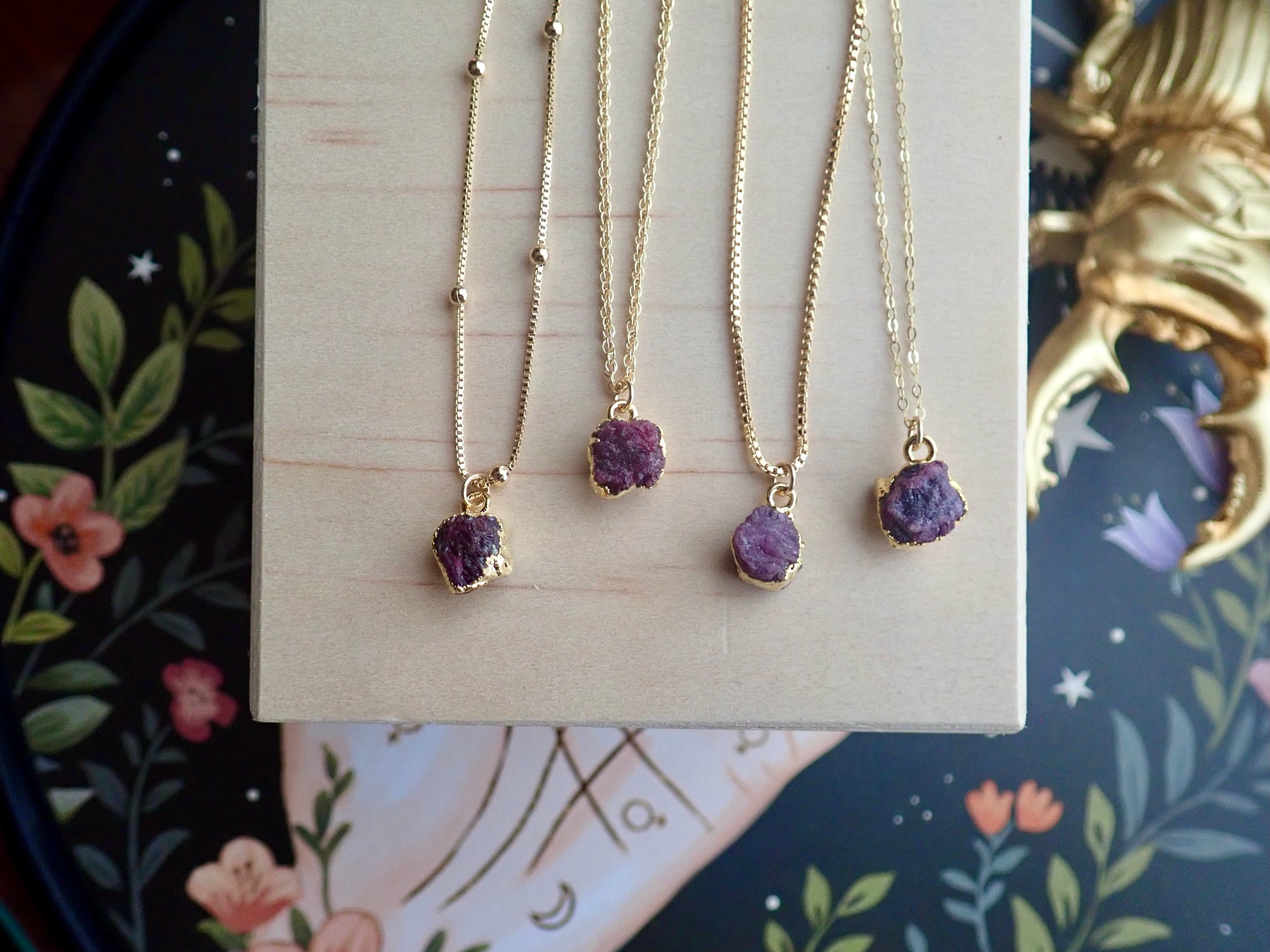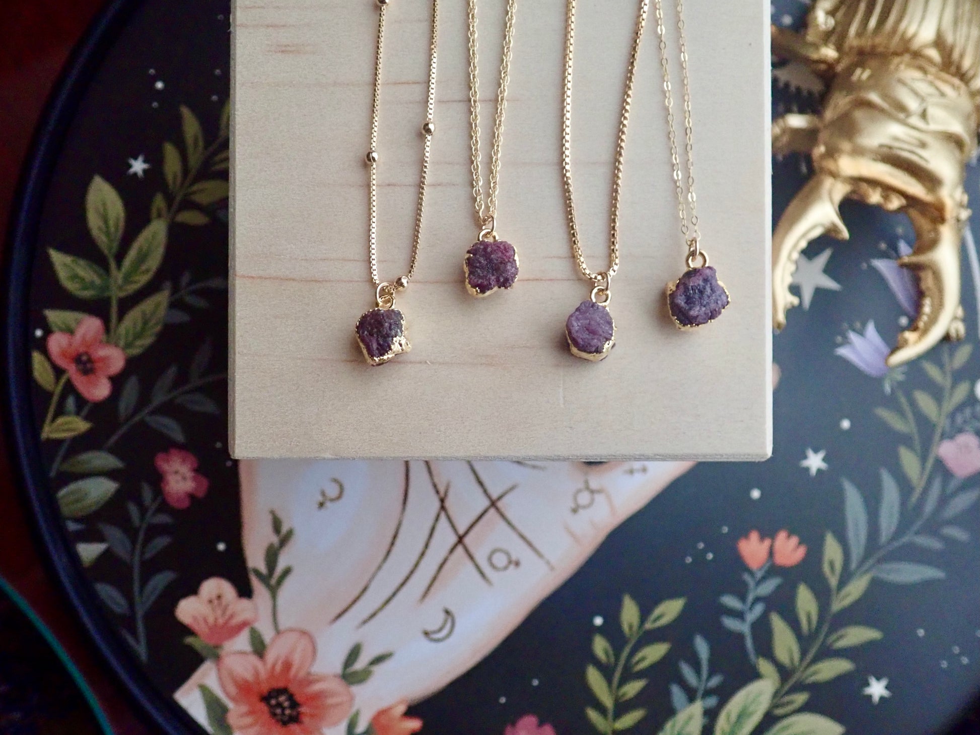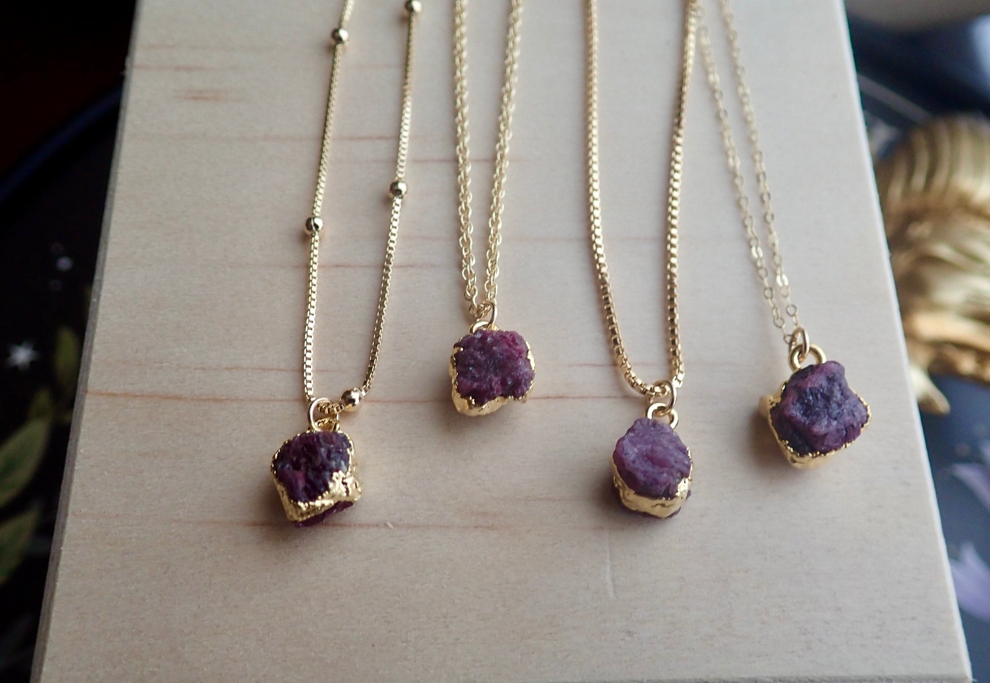 Beautiful raw ruby gemstones electoplated in 14k gold and hung from your choice of high quality gold fill chain.