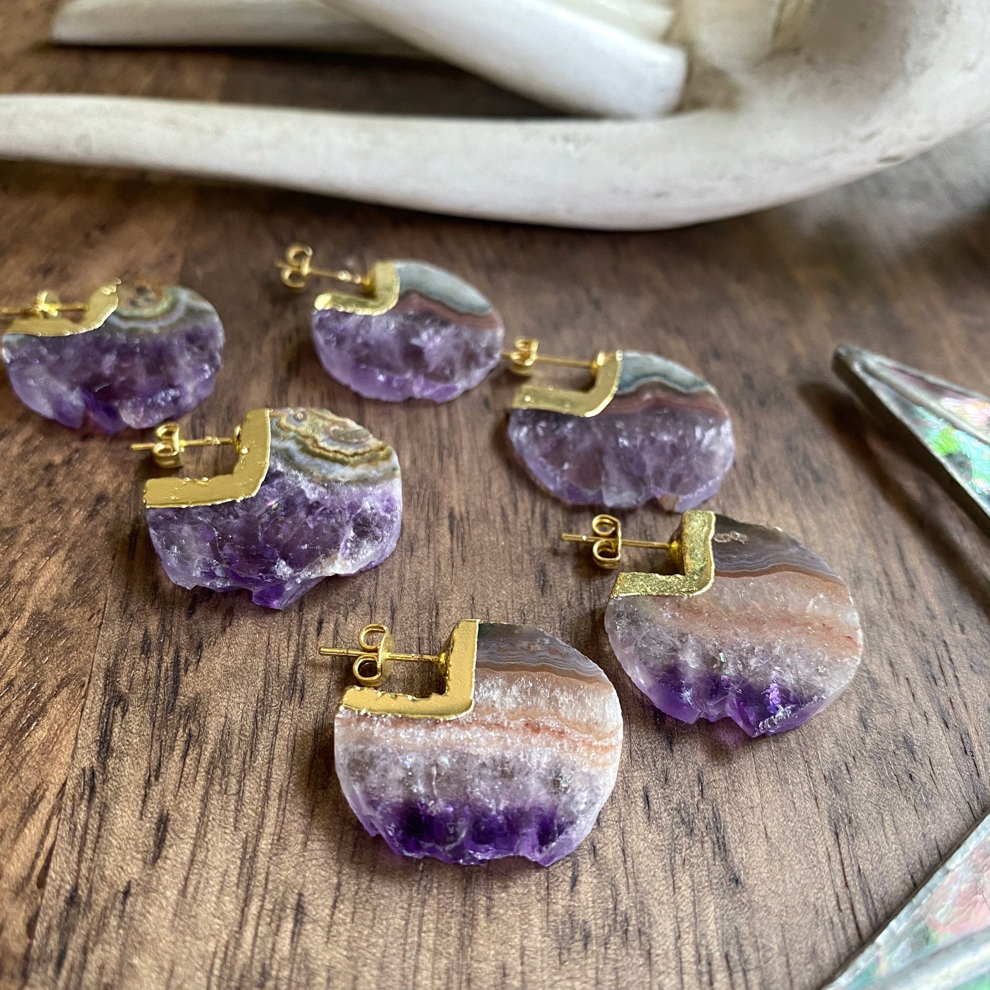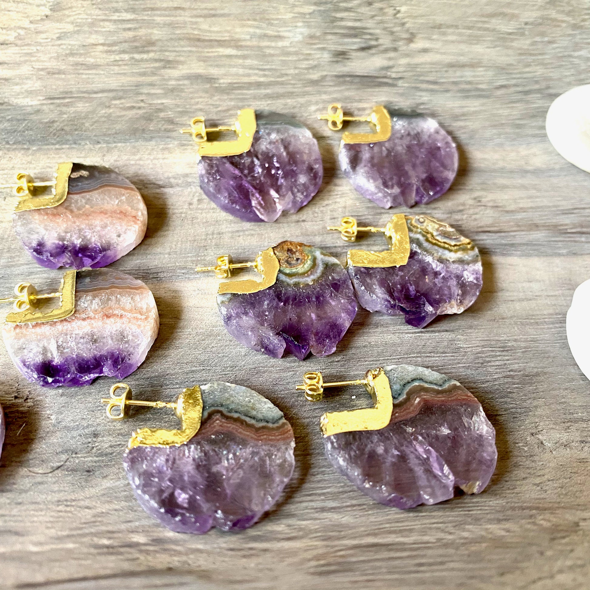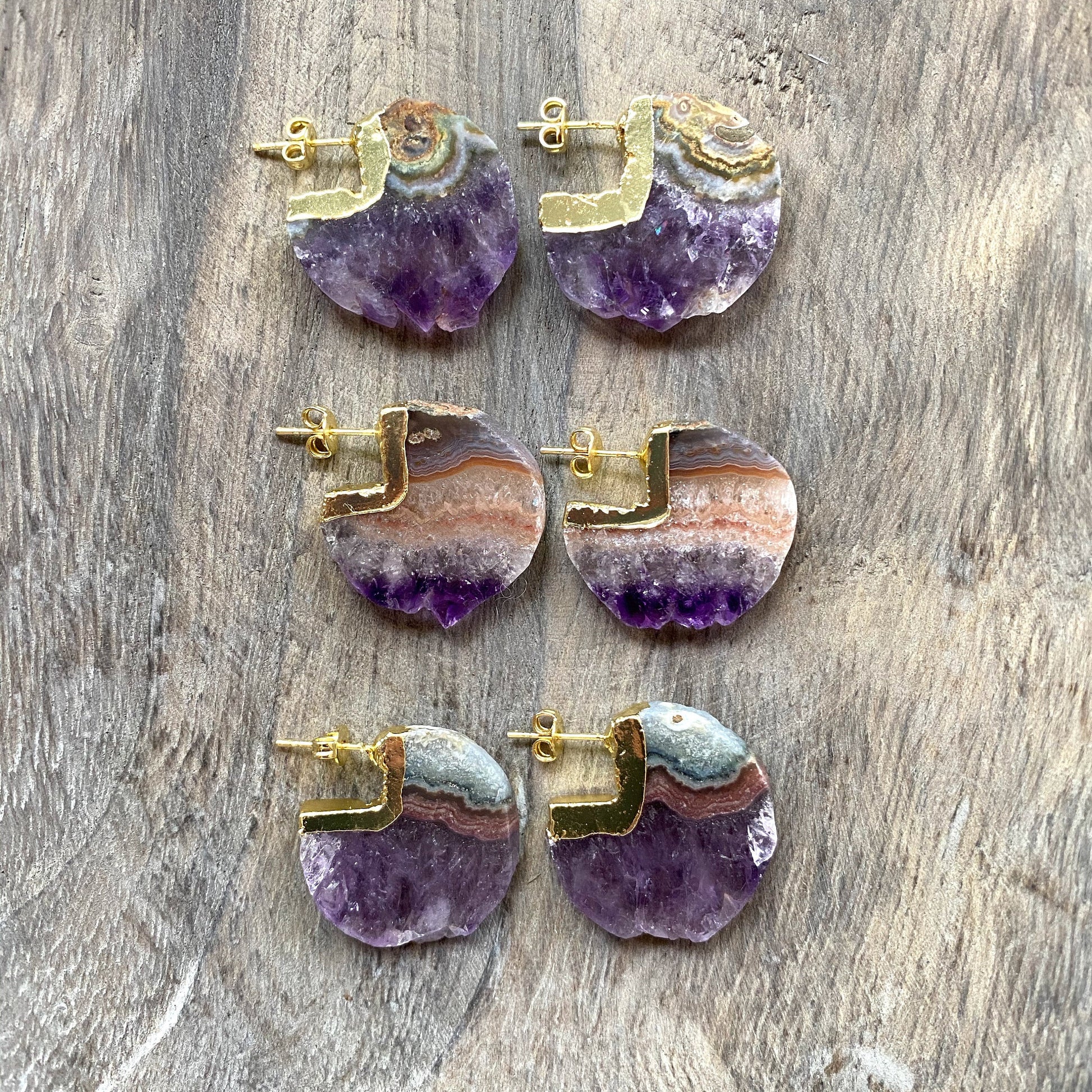 These are rough cut into hoop shaped earrings. They're polished on both sides but have lots of gorgeous raw edges which really bring out the natural beauty of the stones. Each one is one of a kind but I try to match them as best I can with their mate. Think of them as sisters, not twins.