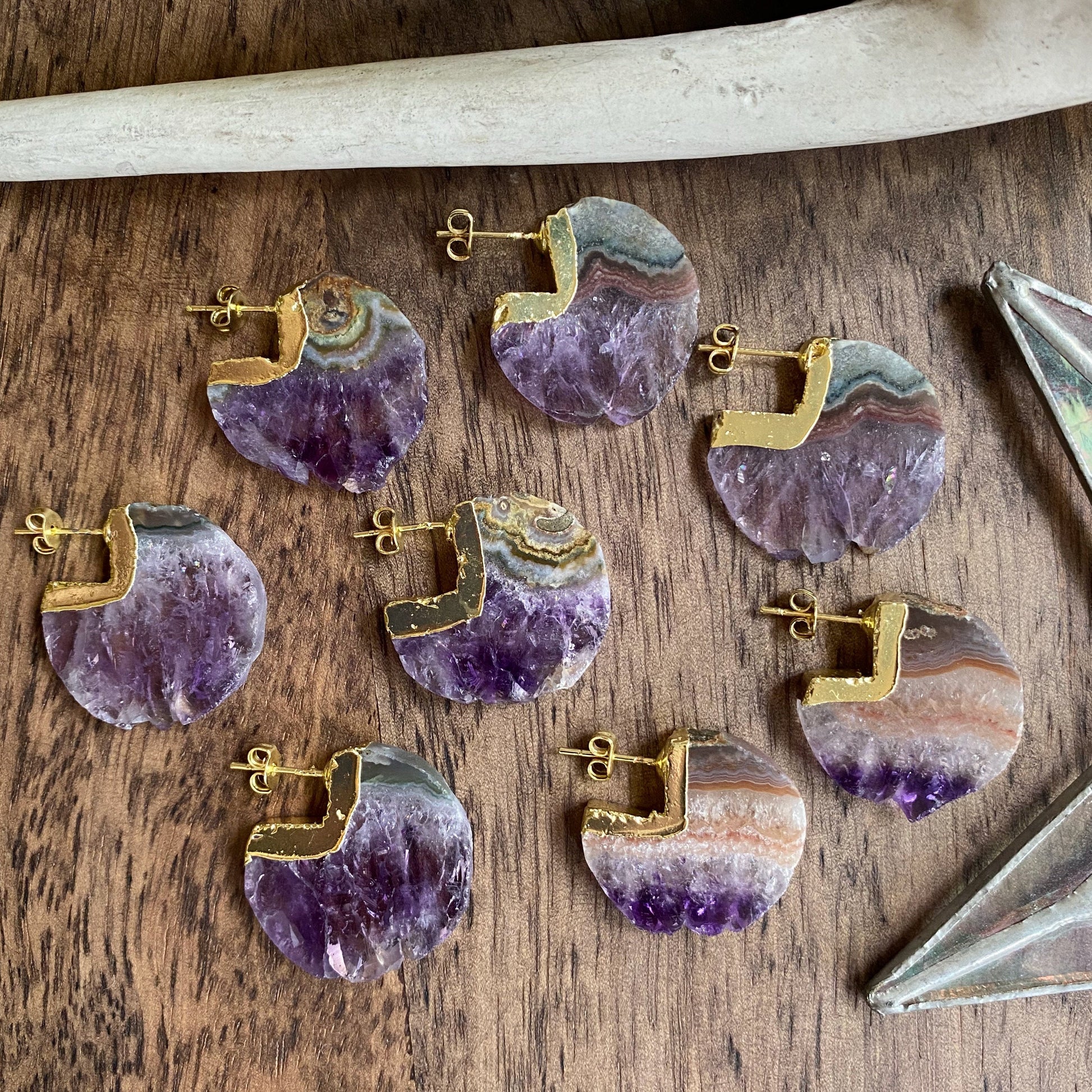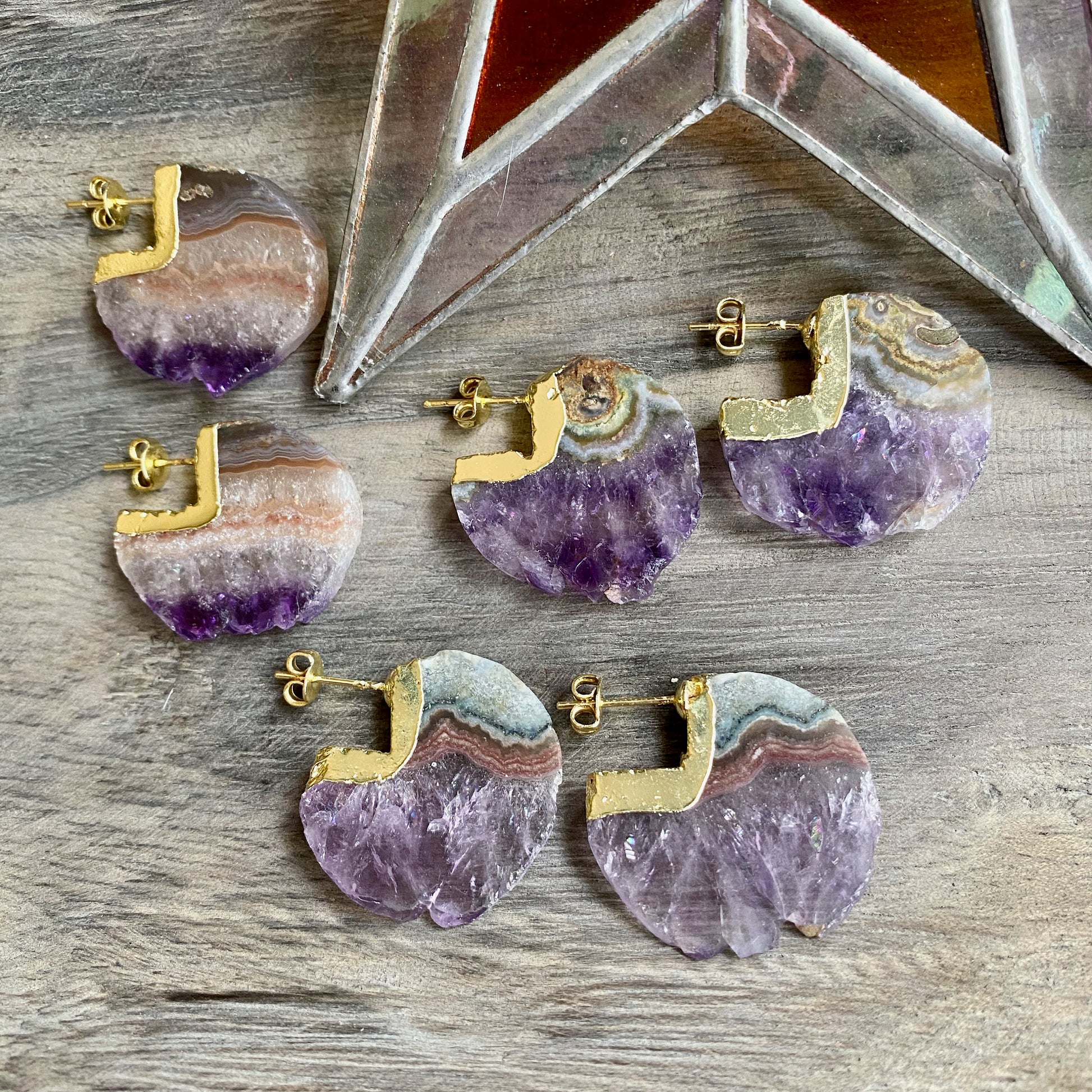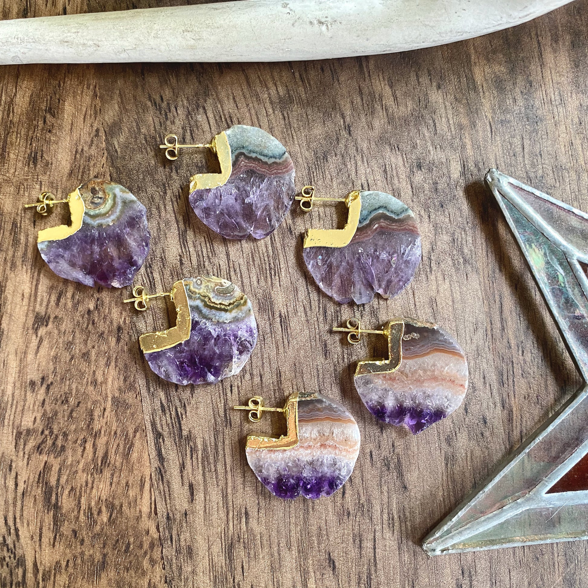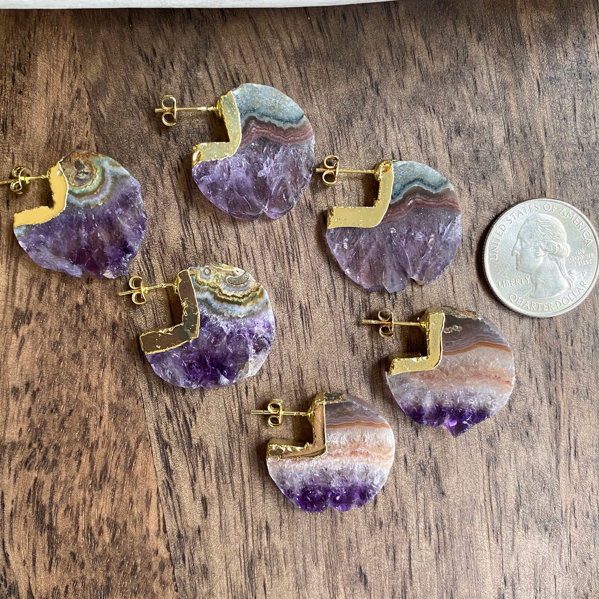 These amethyst crystal slices are buds from a column of amethyst stalactite that took millions of years to develop deep within a cave of mother earth. Stalactite amethyst has amazing layers of colors, ranging from soft white, mossy green, to peachy orange, culminating in captivating purple and lilac amethyst crystals.