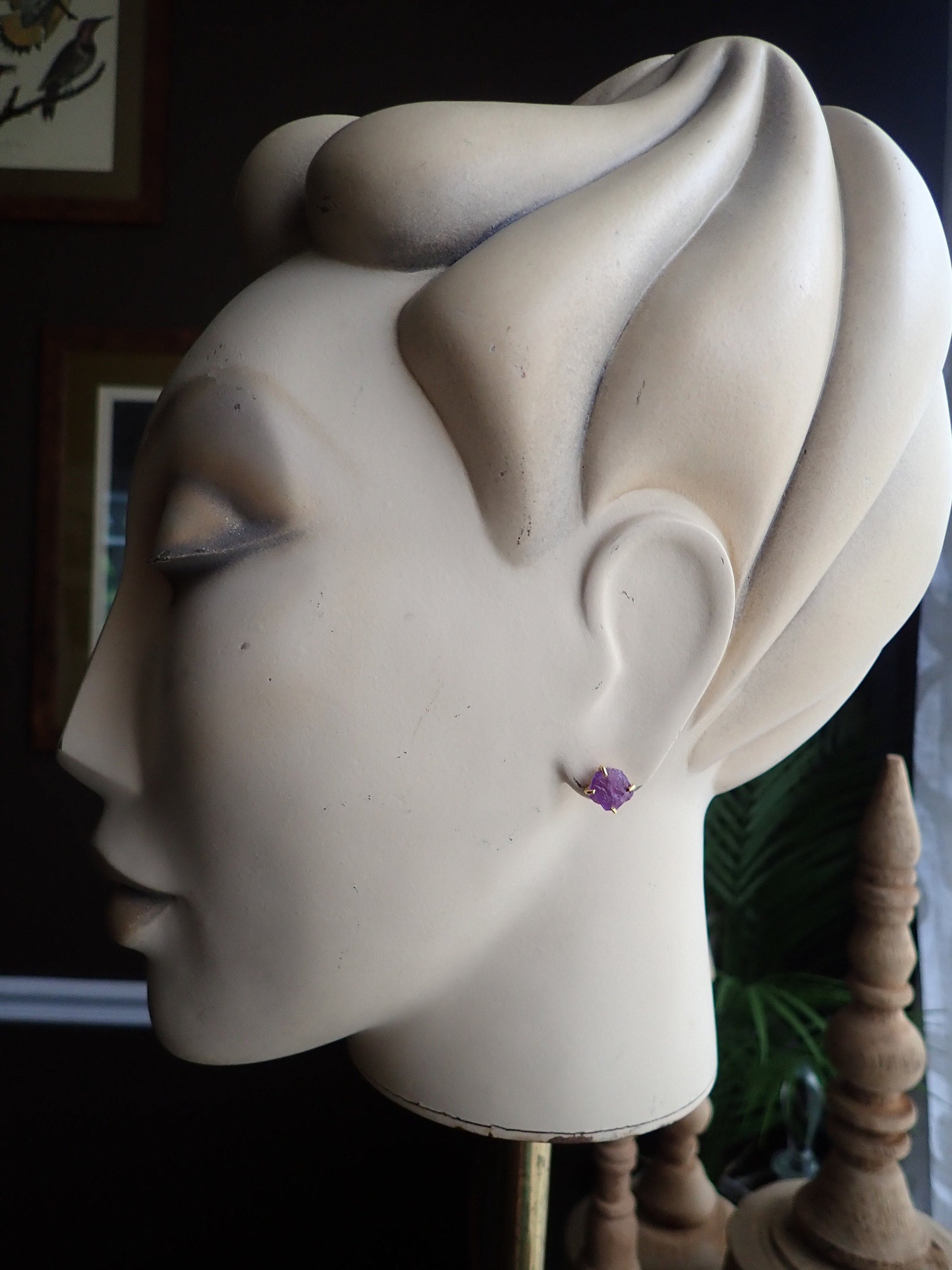 Perfect everyday amethyst stud earrings prong-set in electroplated 14k gold.