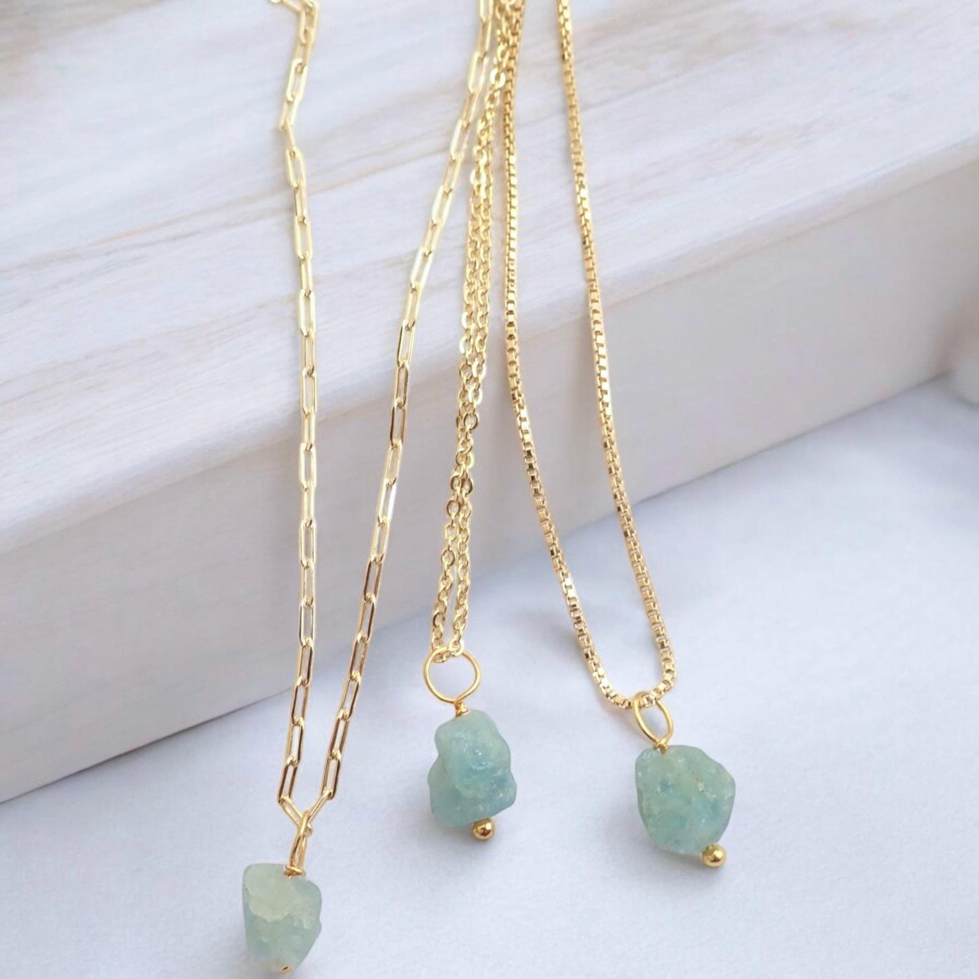 Beautiful and all-natural aquamarine gemstones hung from a dainty and light-catching gold fill chain.