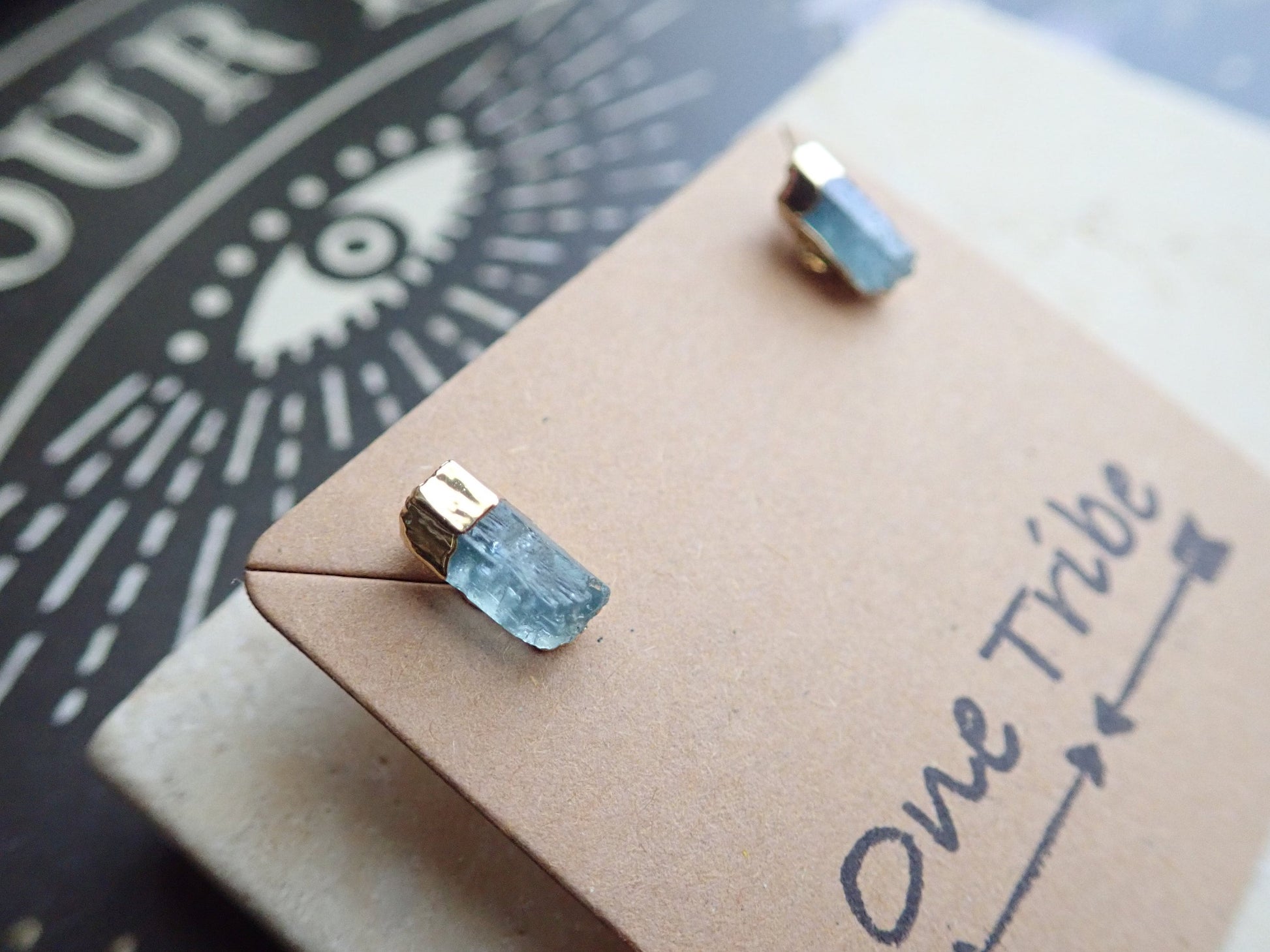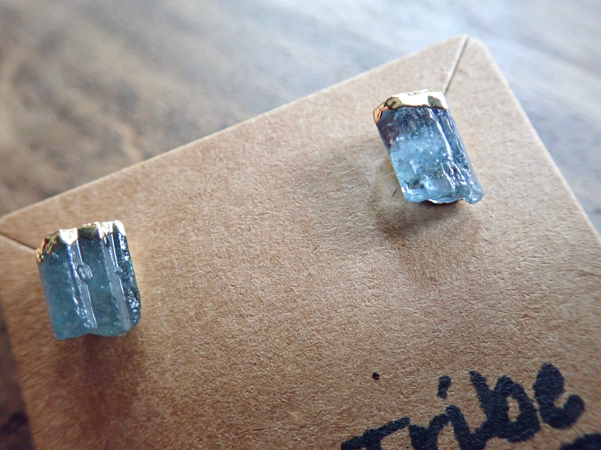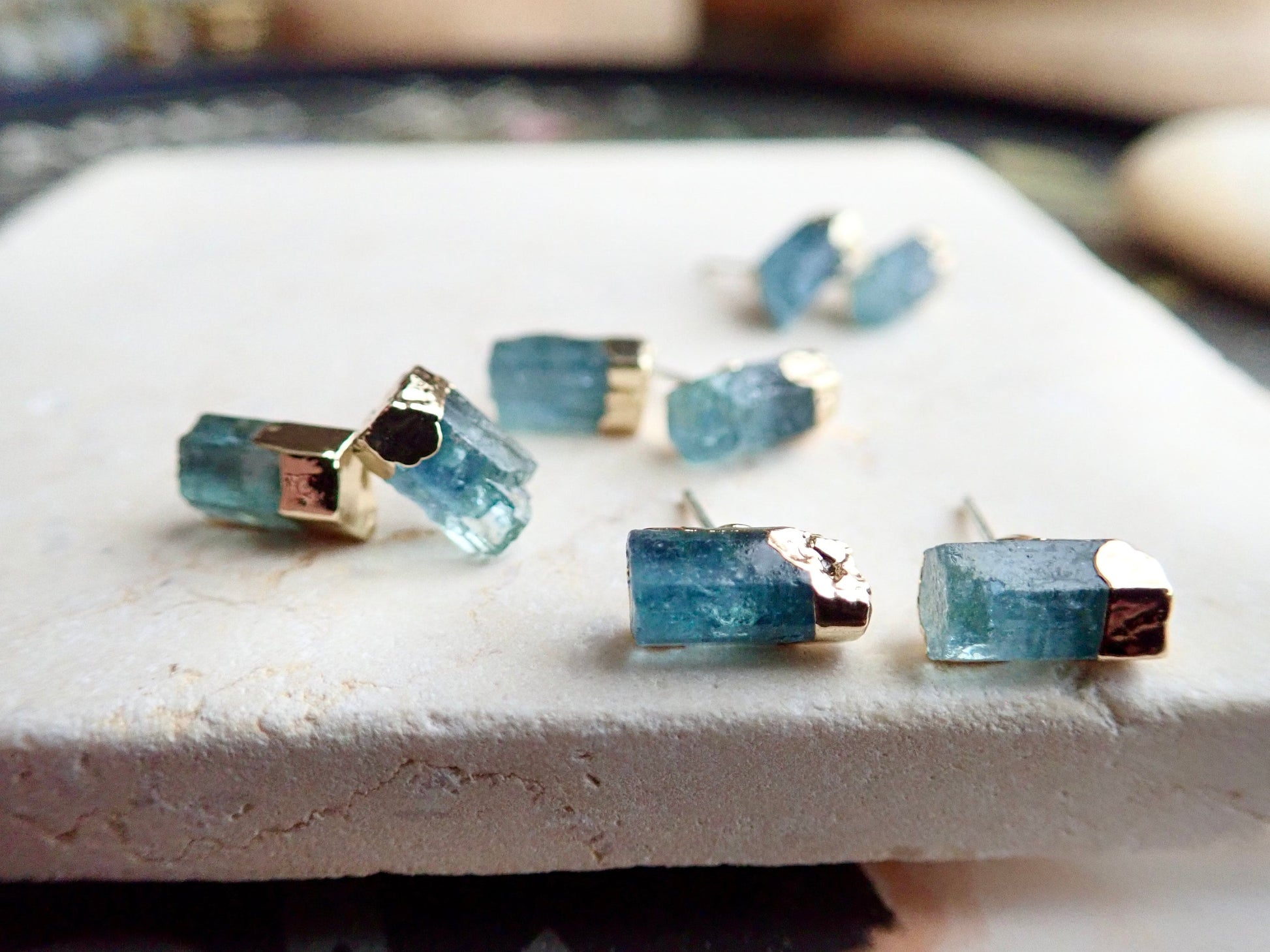 Dainty raw aquamarine crystals are electroplated in genuine 14k gold with hypo-allergenic sterling silver posts.