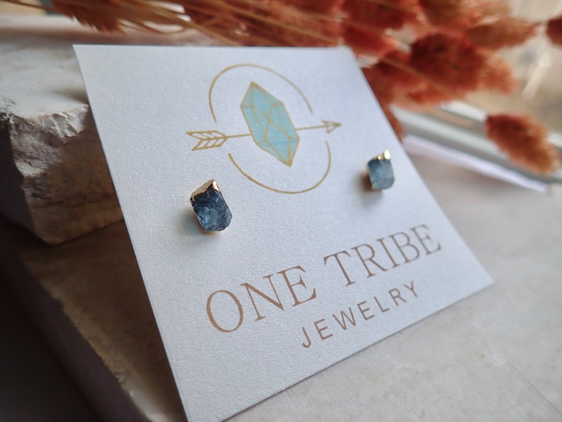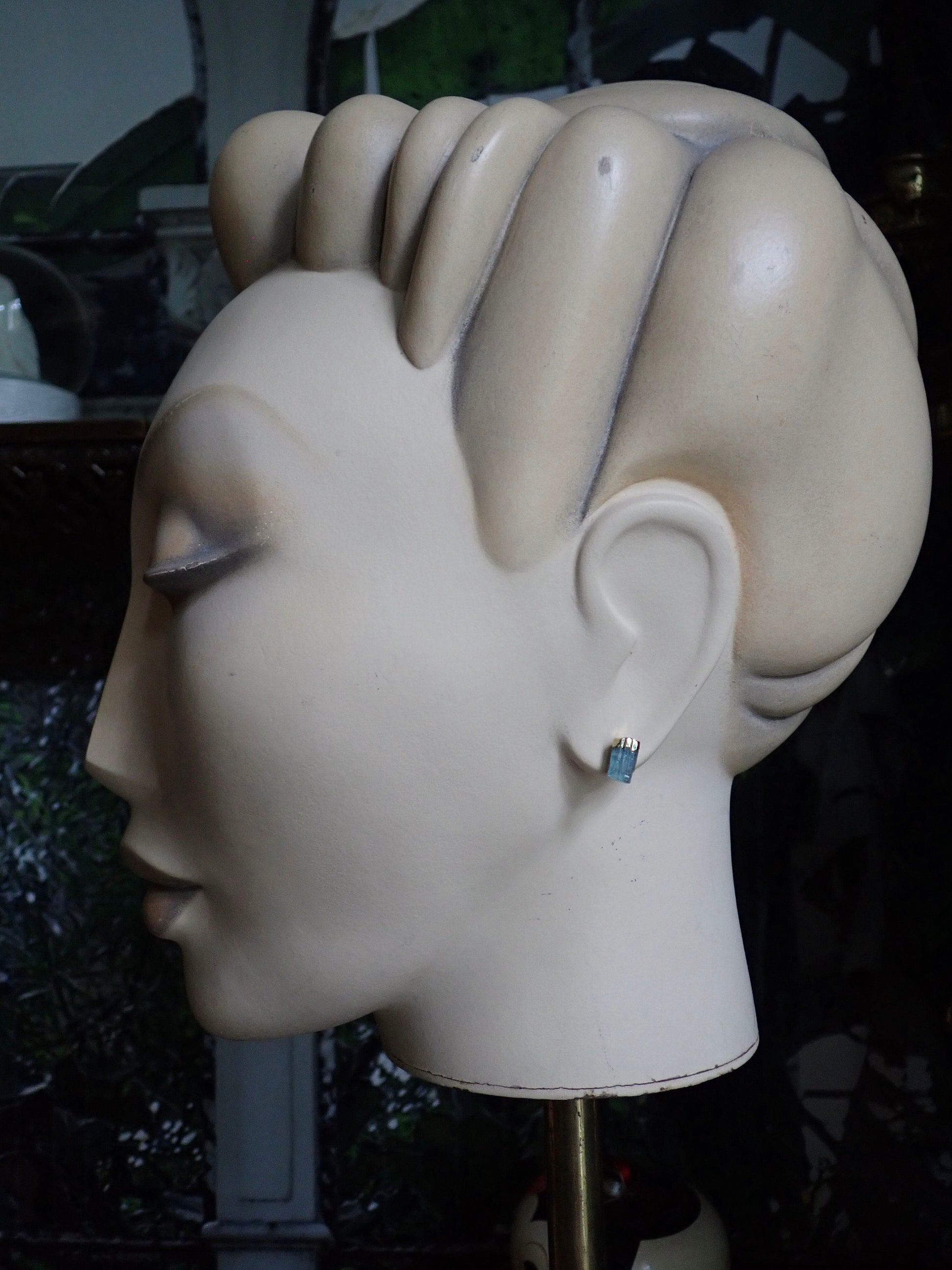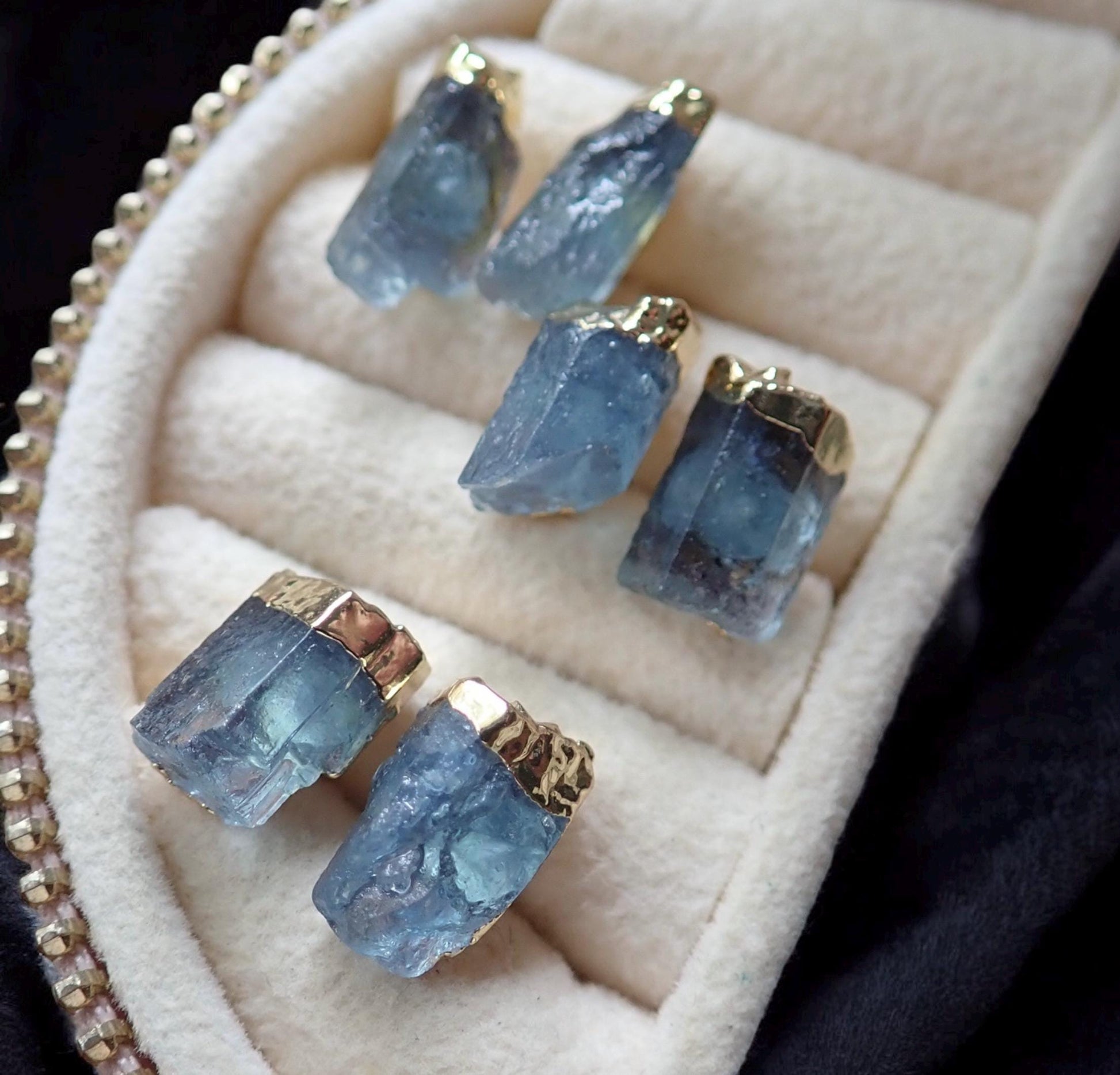 Dainty raw aquamarine crystals are electroplated in genuine 14k gold with hypo-allergenic sterling silver posts.