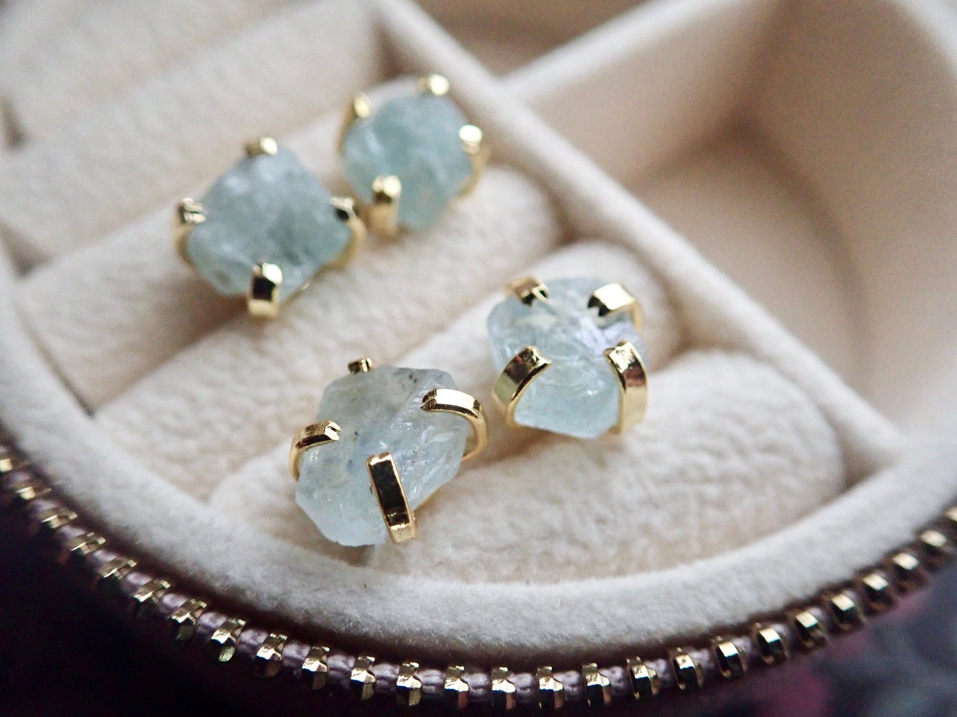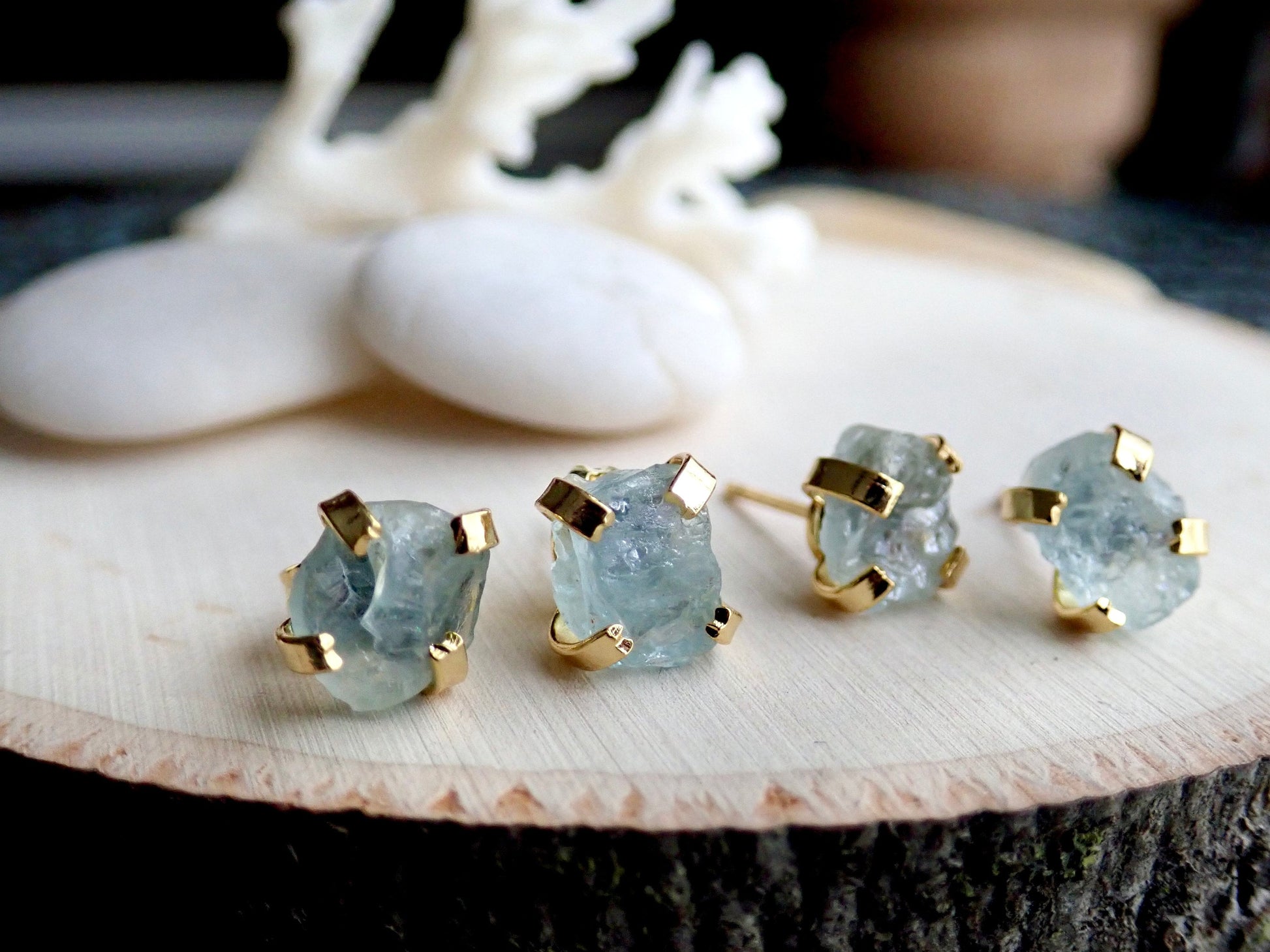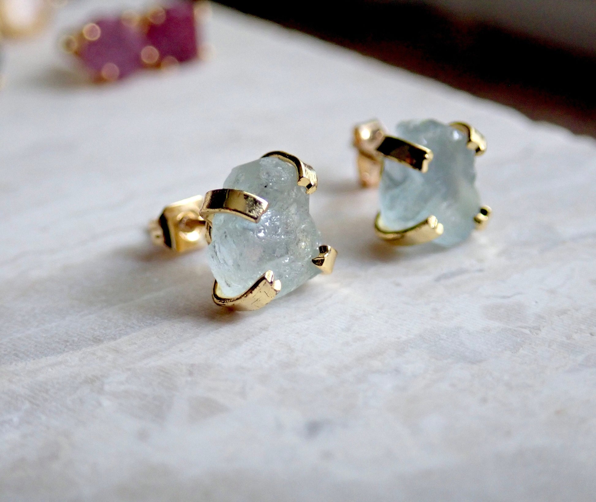 These everyday studs are made with genuine raw aquamarine crystals and prong-set in 14k gold over brass.