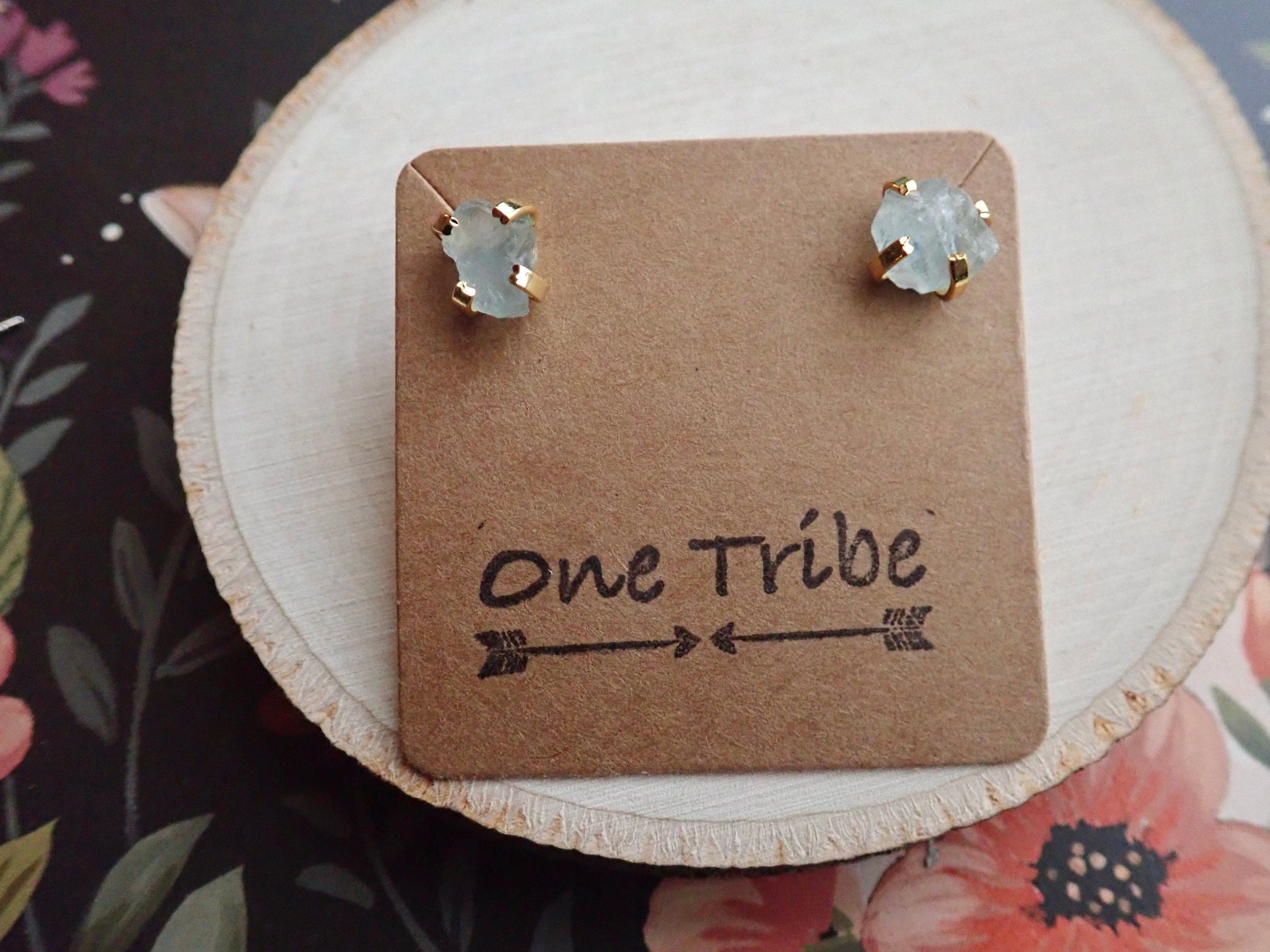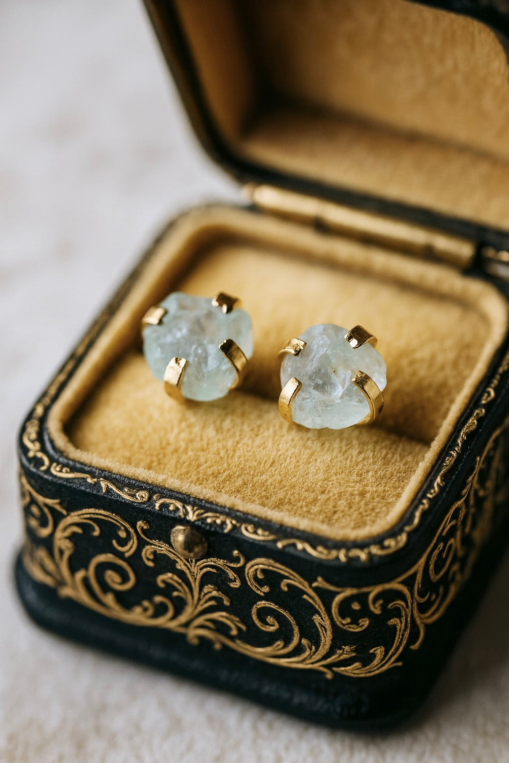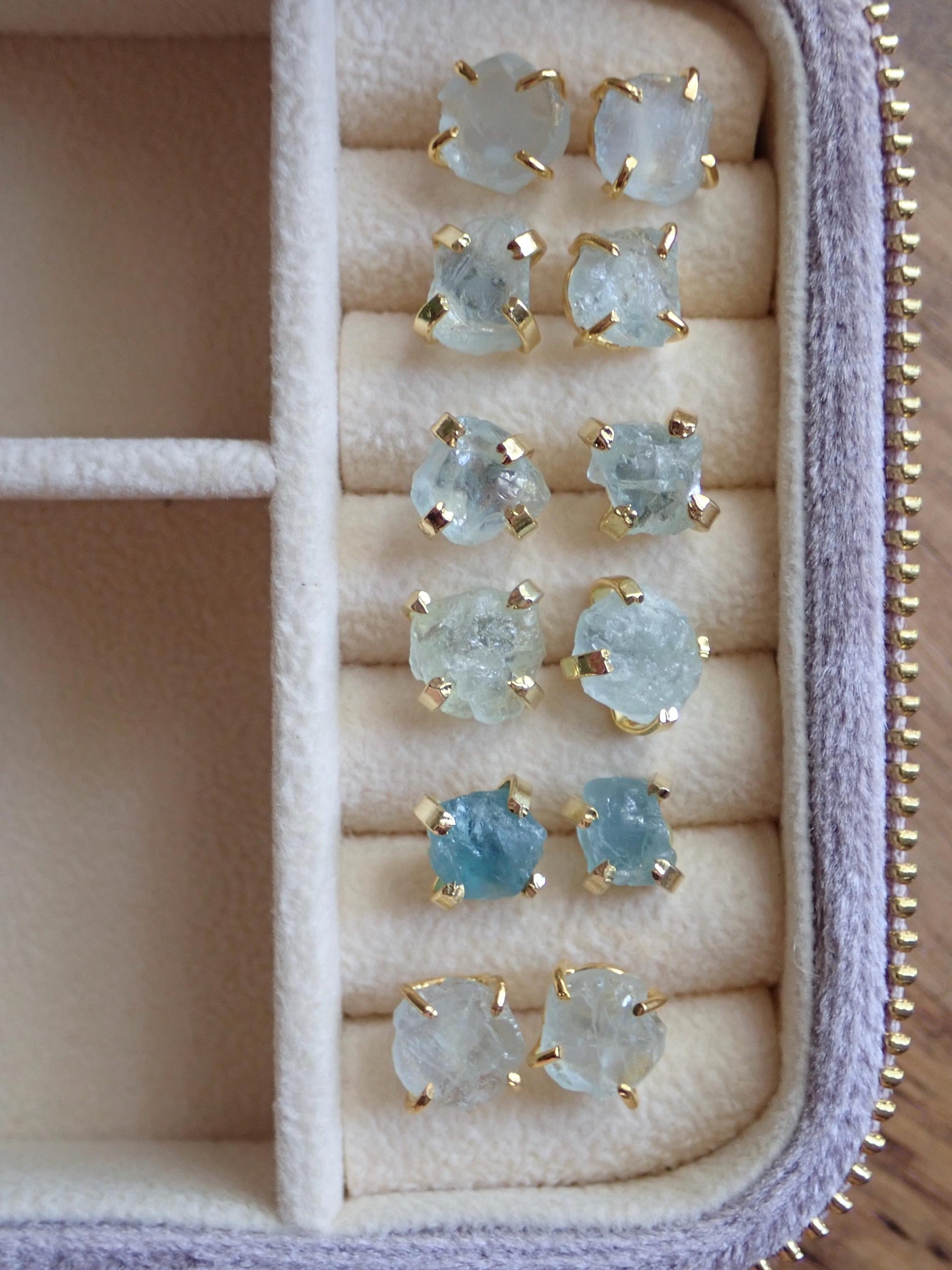 These everyday studs are made with genuine raw aquamarine crystals and prong-set in 14k gold over brass.