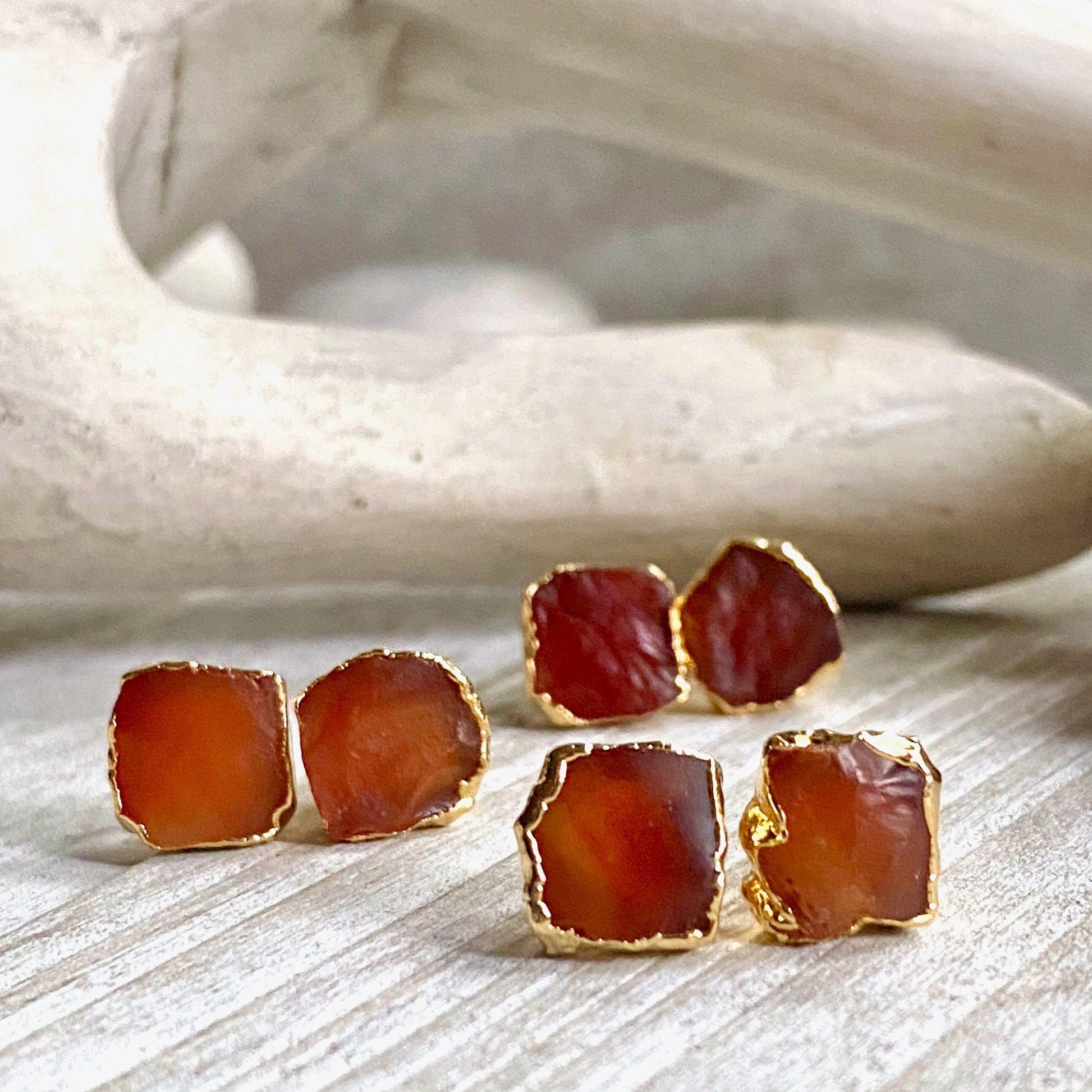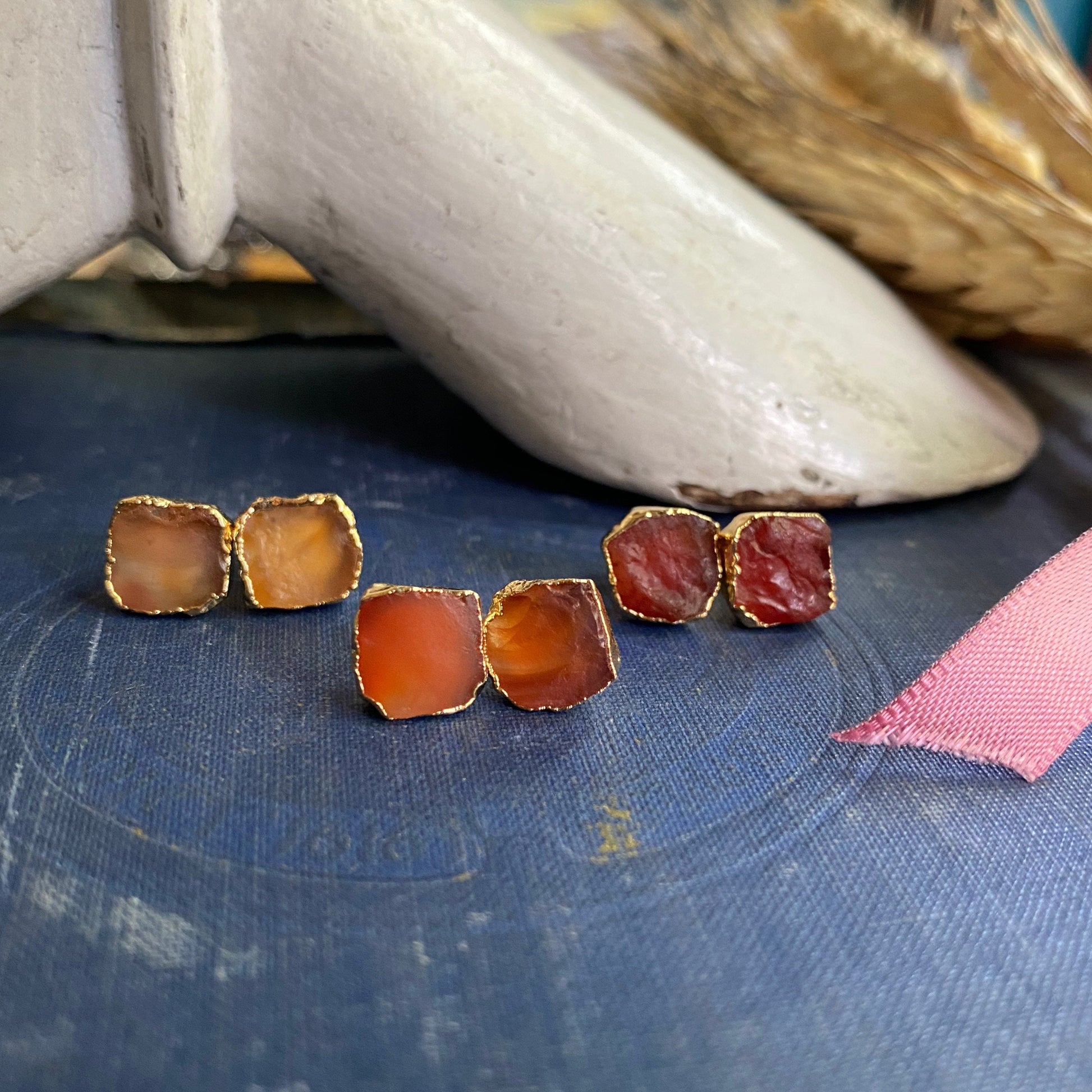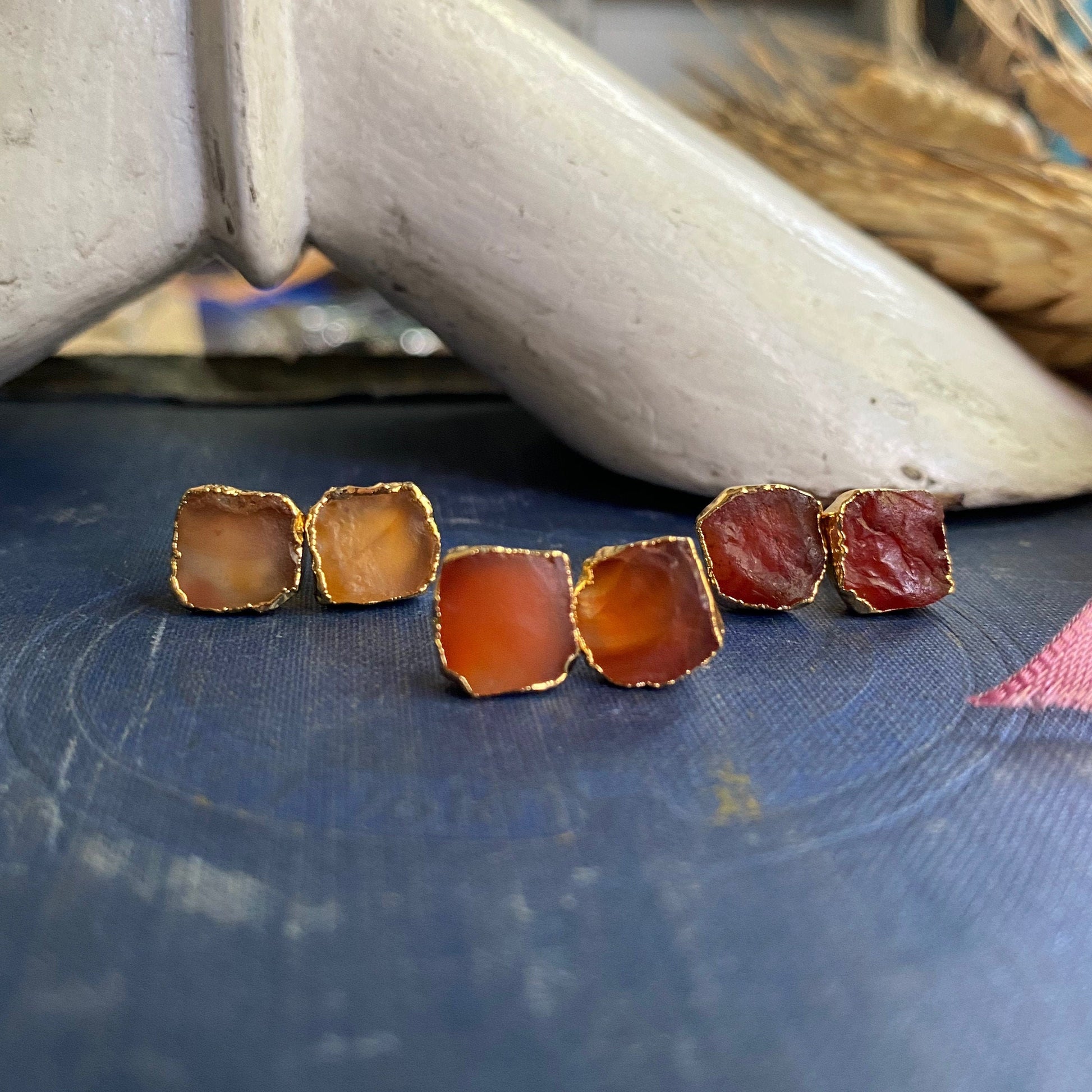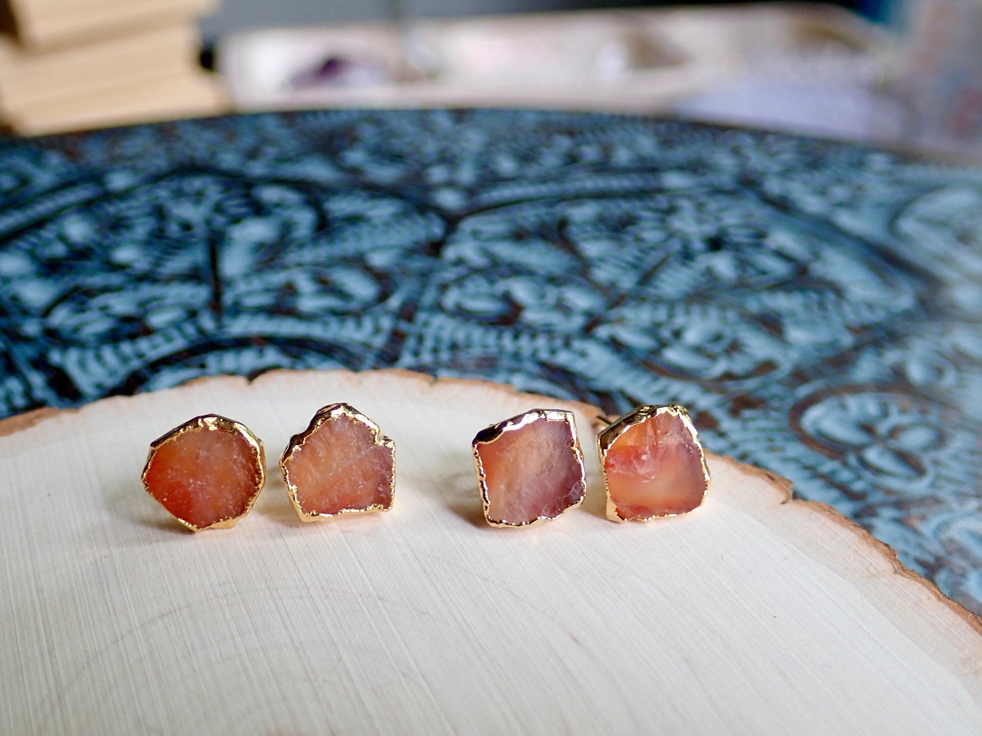 Gorgeous little raw carnelian crystal stud earrings electroplated in 14k gold.