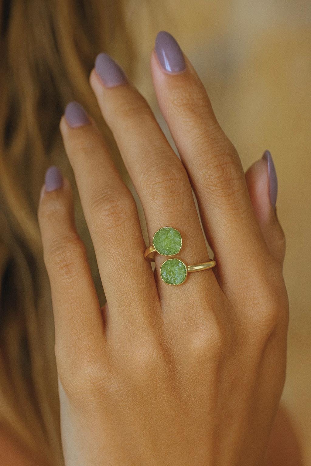 Bold, earthy, and full of character ✨ This raw citrine wrap ring features two natural citrine stones in their untouched, organic form, set in a gold-plated adjustable band. Each stone is unique, with a beautiful golden glow that makes every ring one of a kind.