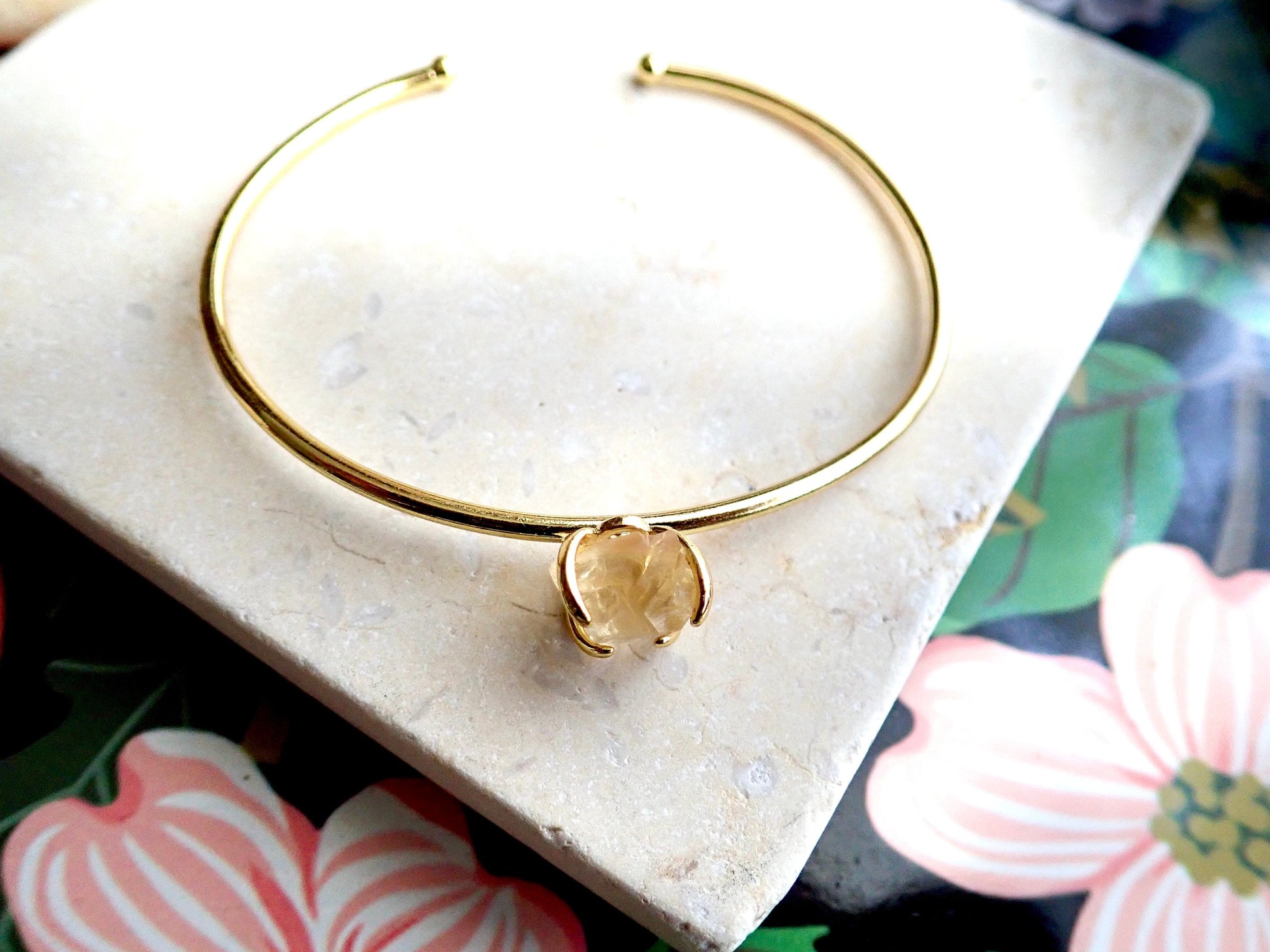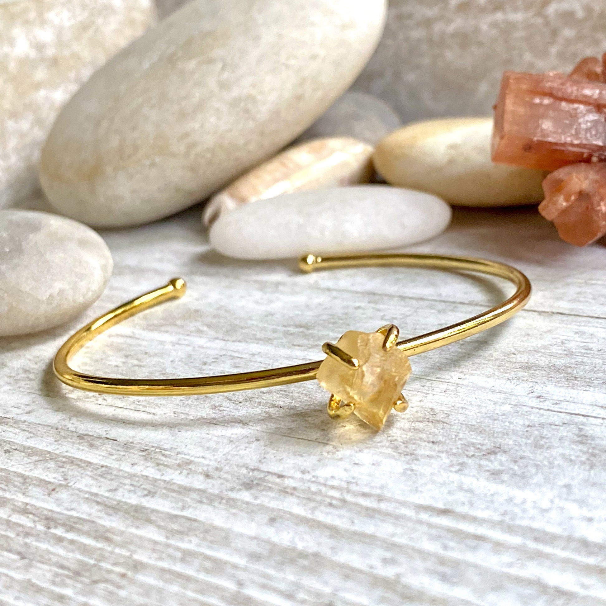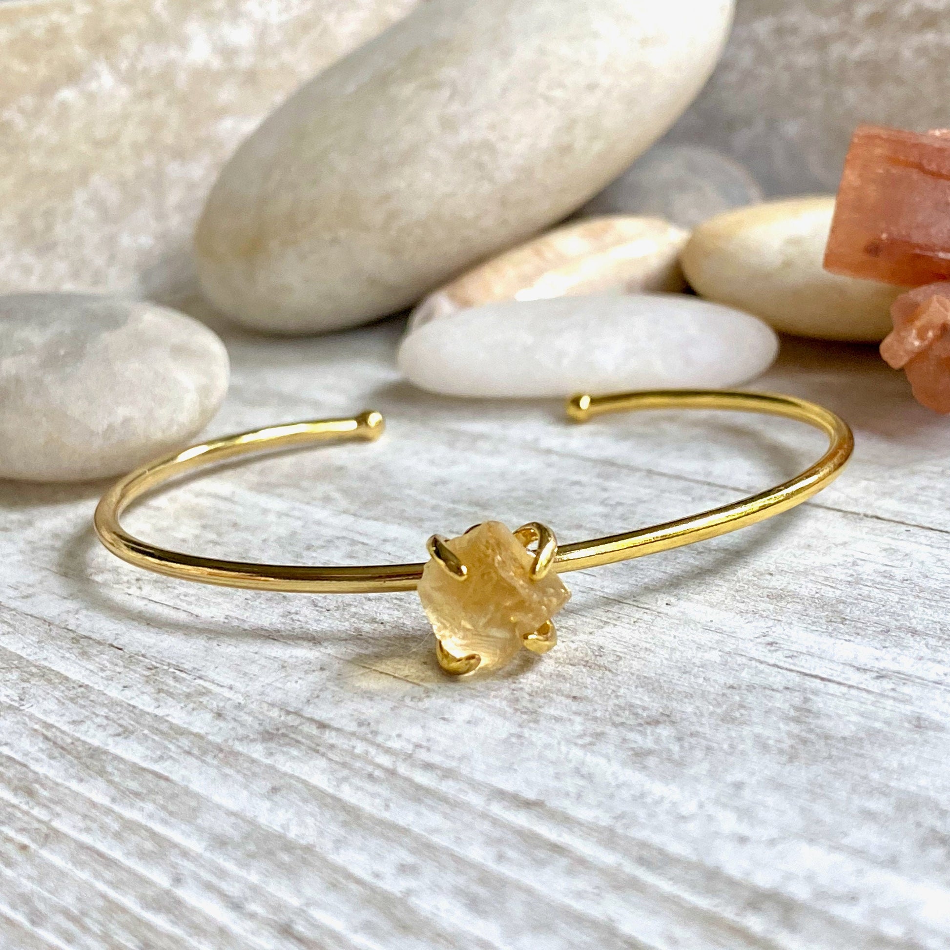 Sweet and simple raw citrine cuff bracelets are perfect for wearing alone or stacking with others. Shiny 14k gold plated cuff bracelet set with one rough citrine crystal. Stones are about 12mm round but they vary in size so please expect differences. Last photo shows other available stones, this listing is for one citrine bracelet only.