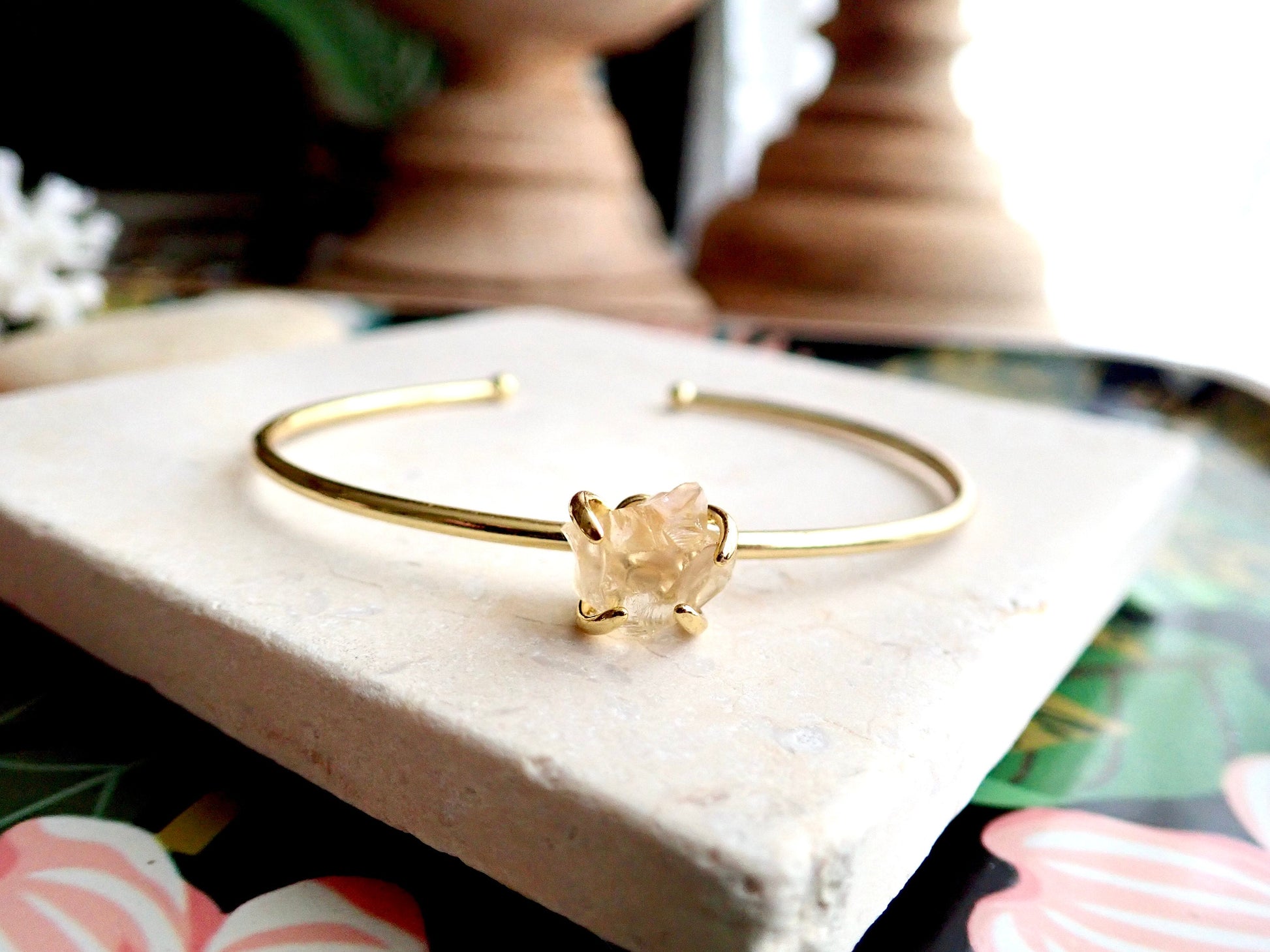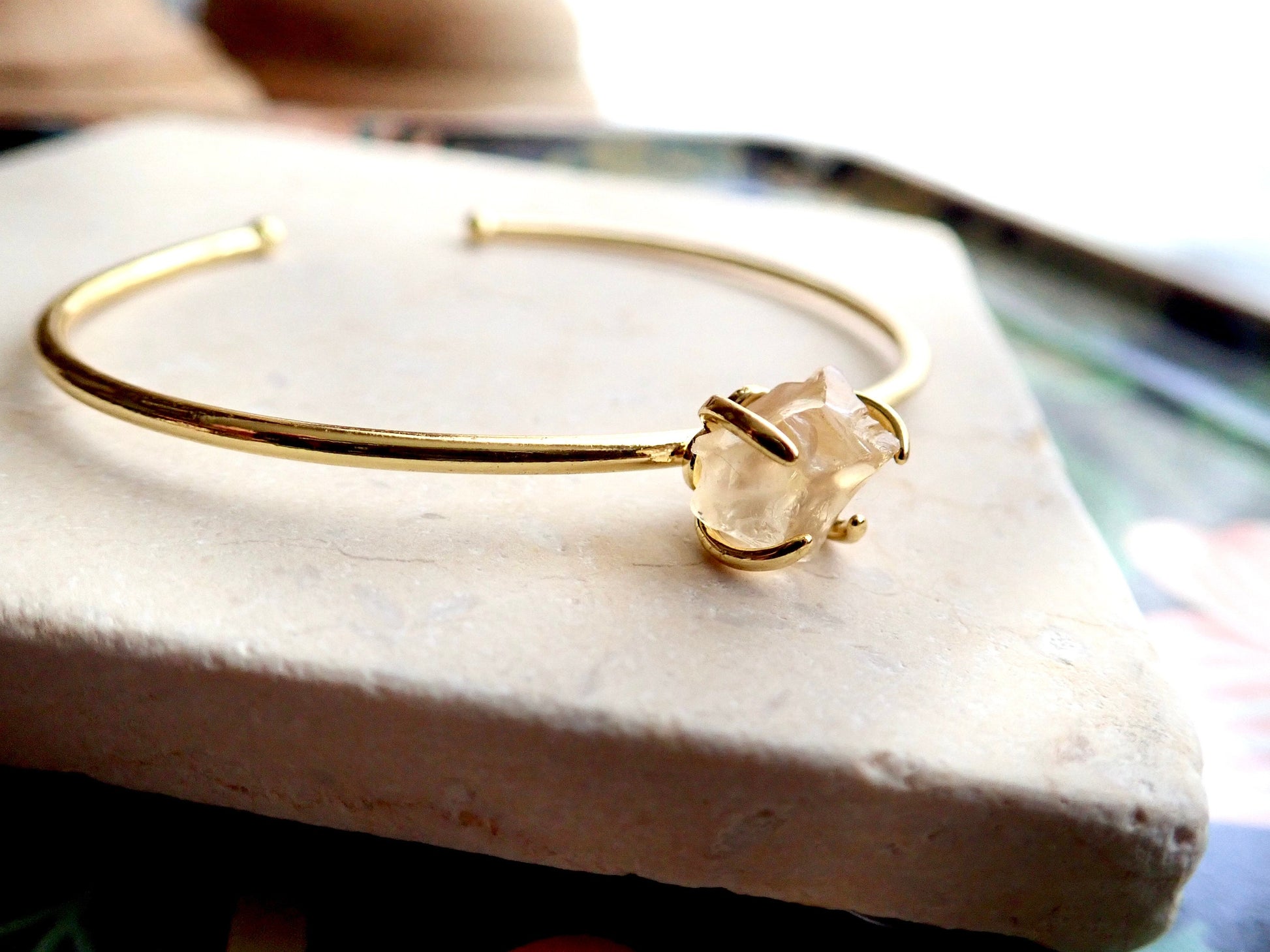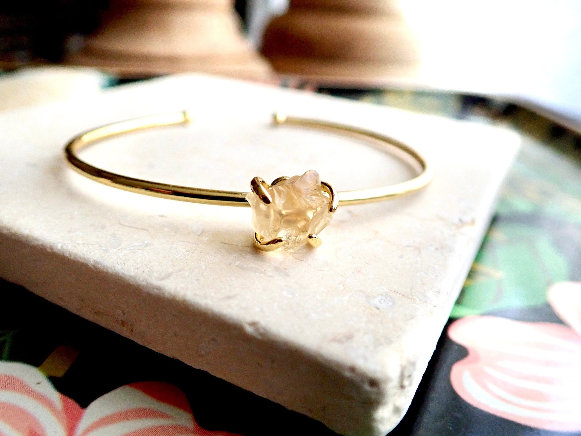 Sweet and simple raw citrine cuff bracelets are perfect for wearing alone or stacking with others. Shiny 14k gold plated cuff bracelet set with one rough citrine crystal. Stones are about 12mm round but they vary in size so please expect differences. Last photo shows other available stones, this listing is for one citrine bracelet only.
