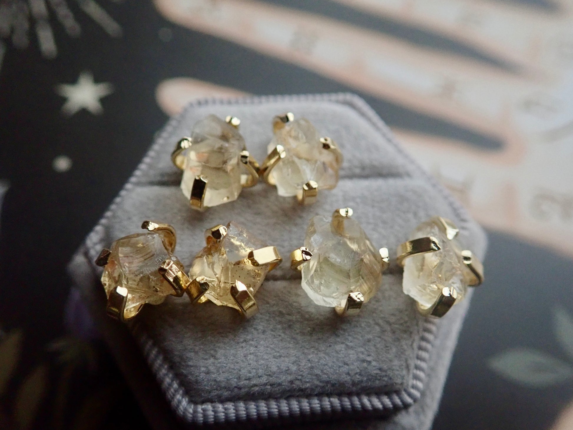 Super sweet rough crystal stud earrings in genuine raw citrine. The handmade prong setting is 14k gold electroplated over brass and is the perfect tableau to show off the warm, sunny color of the rough gems. I use all natural gemstones in my jewelry and love the unique nature of each stone.