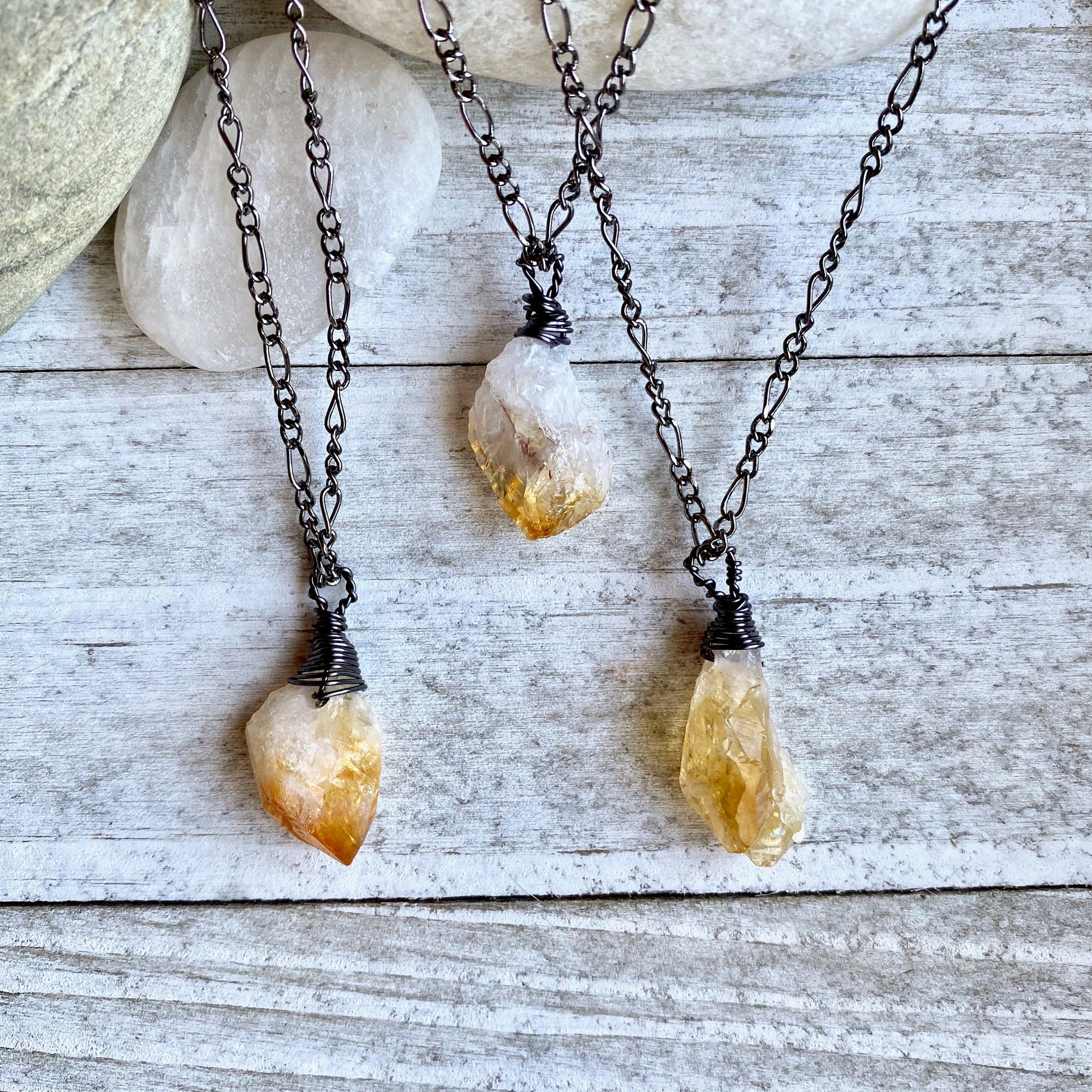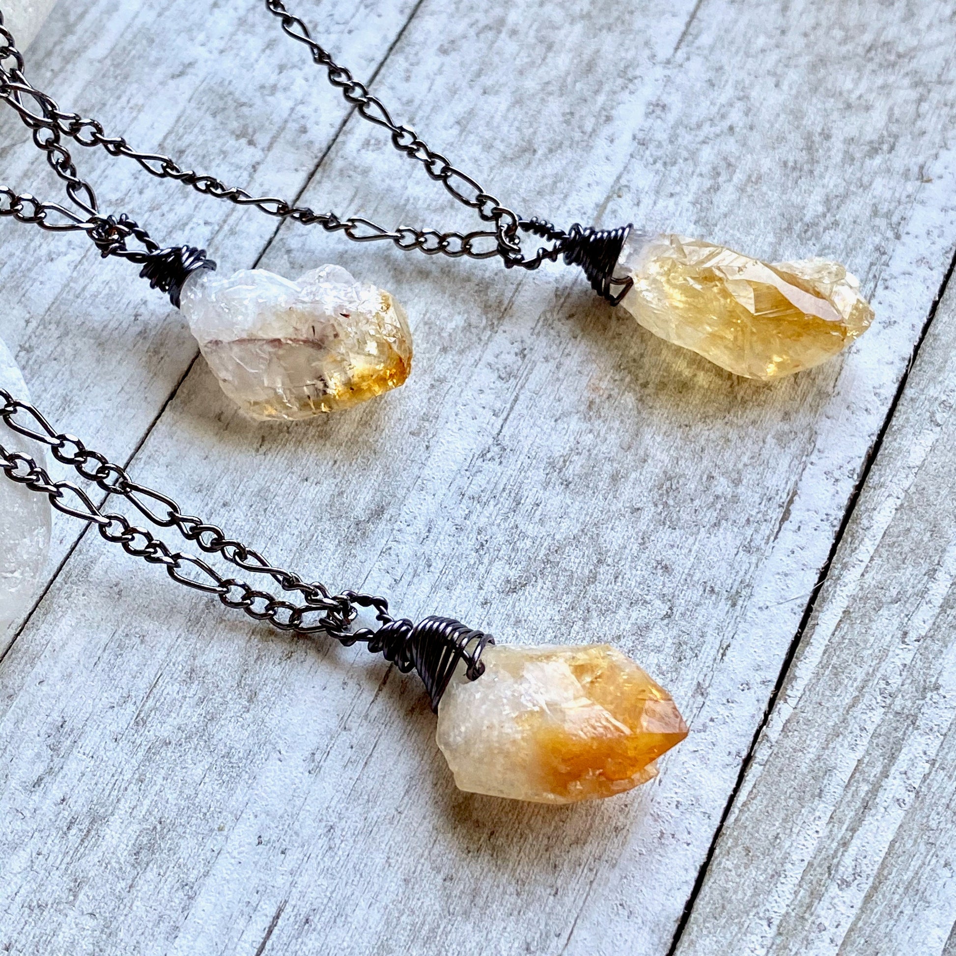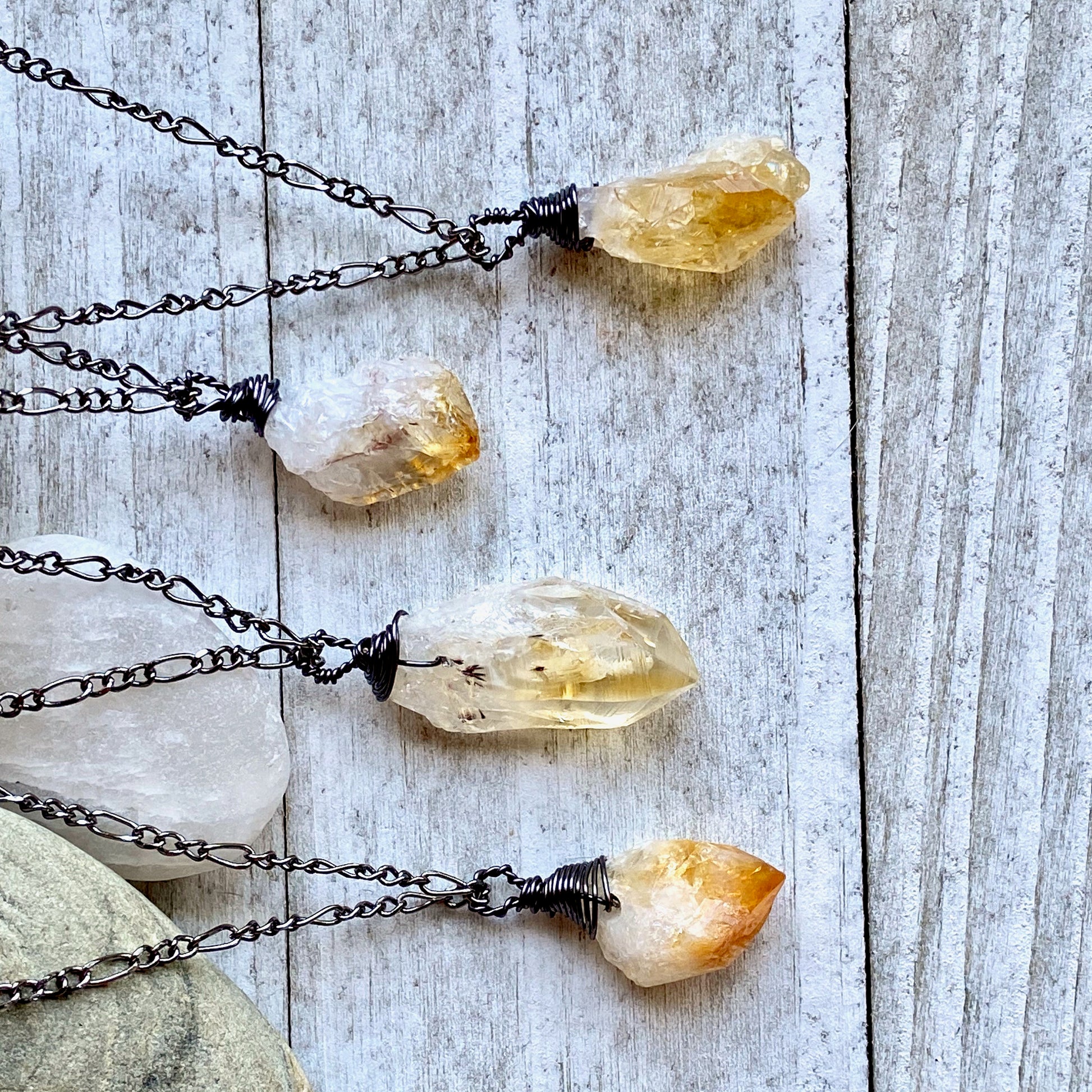 Beautiful and rustic citrine crystals wire-wrapped by hand in oxidized copper. Great for layering or sport it alone, a true boho staple.