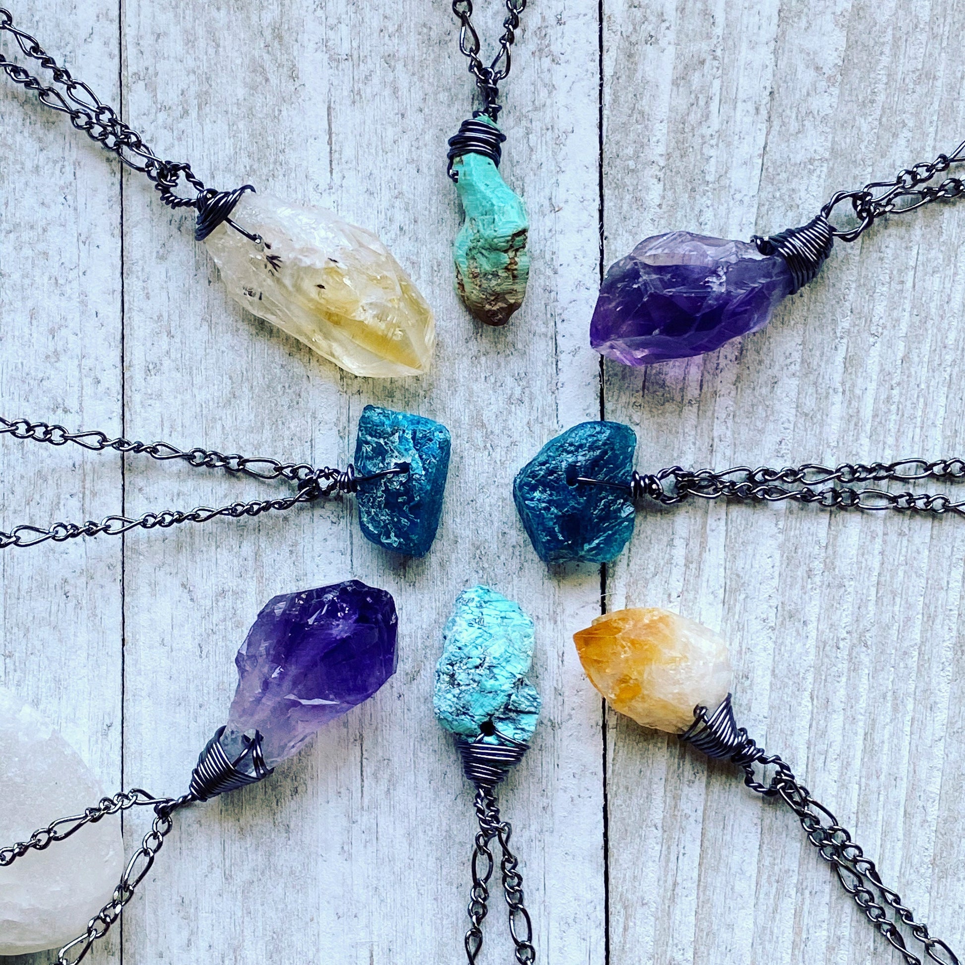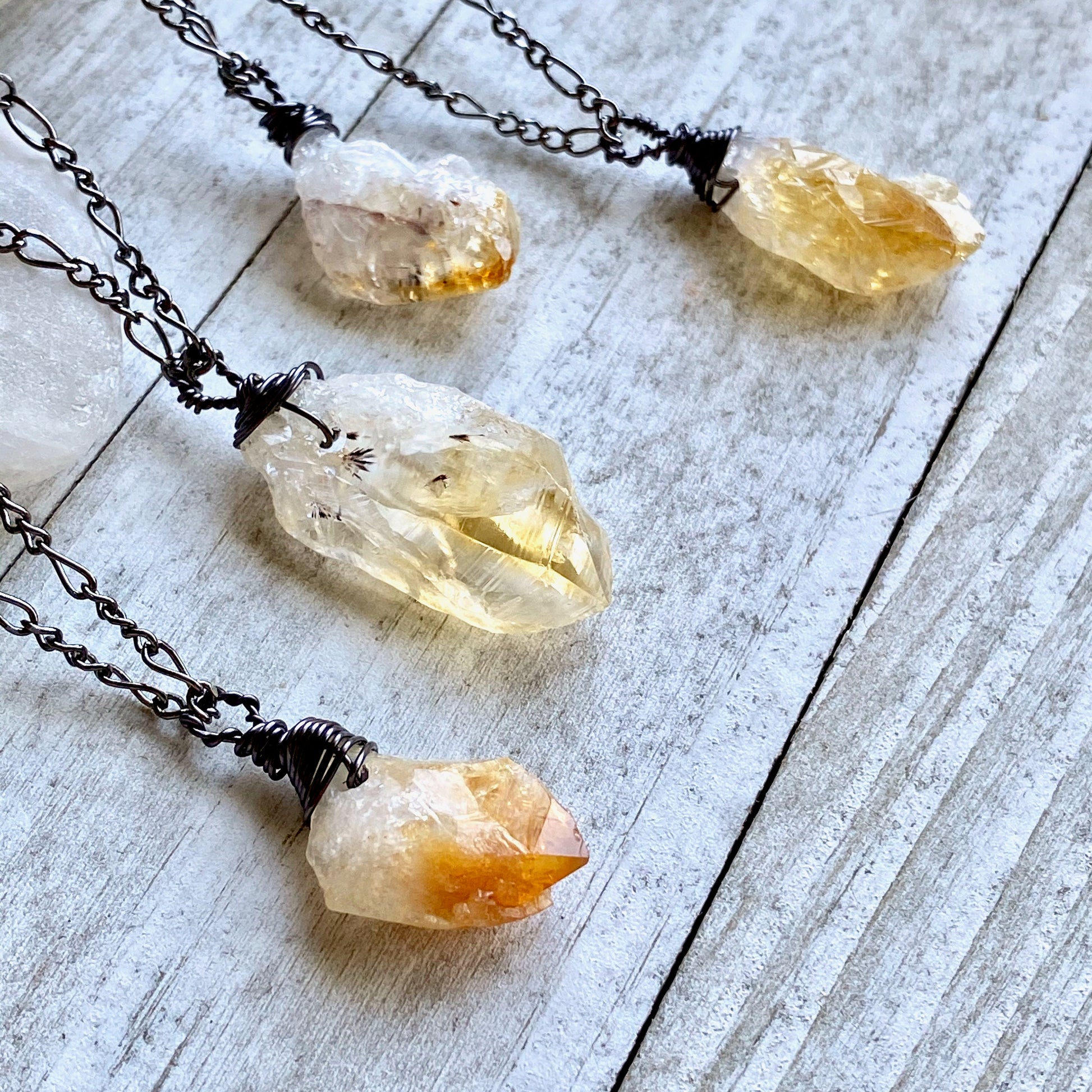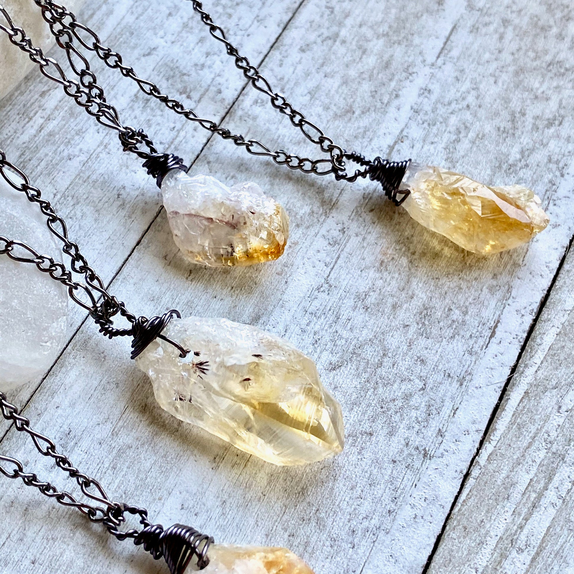 Beautiful and rustic citrine crystals wire-wrapped by hand in oxidized copper. Great for layering or sport it alone, a true boho staple.