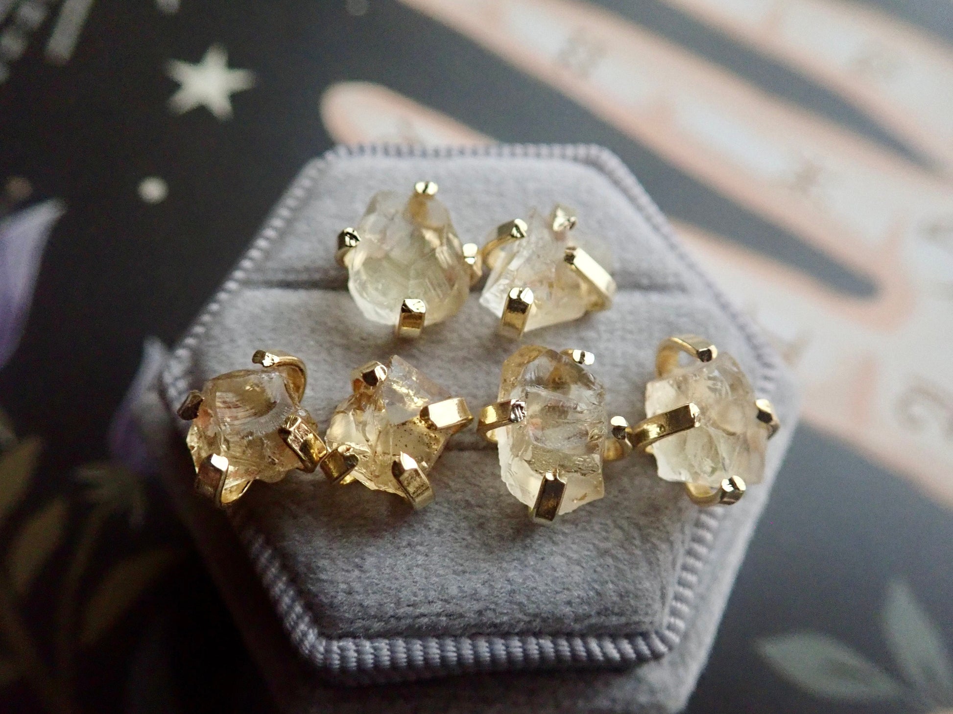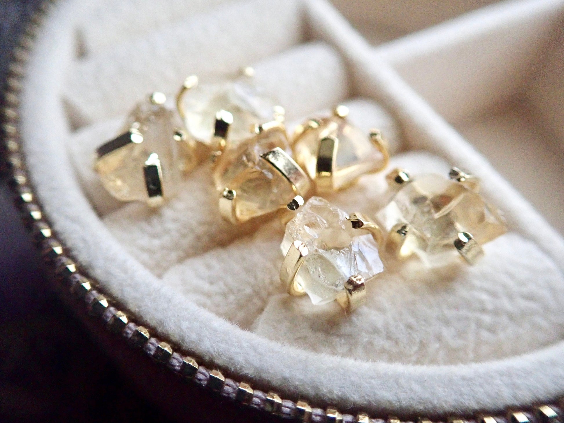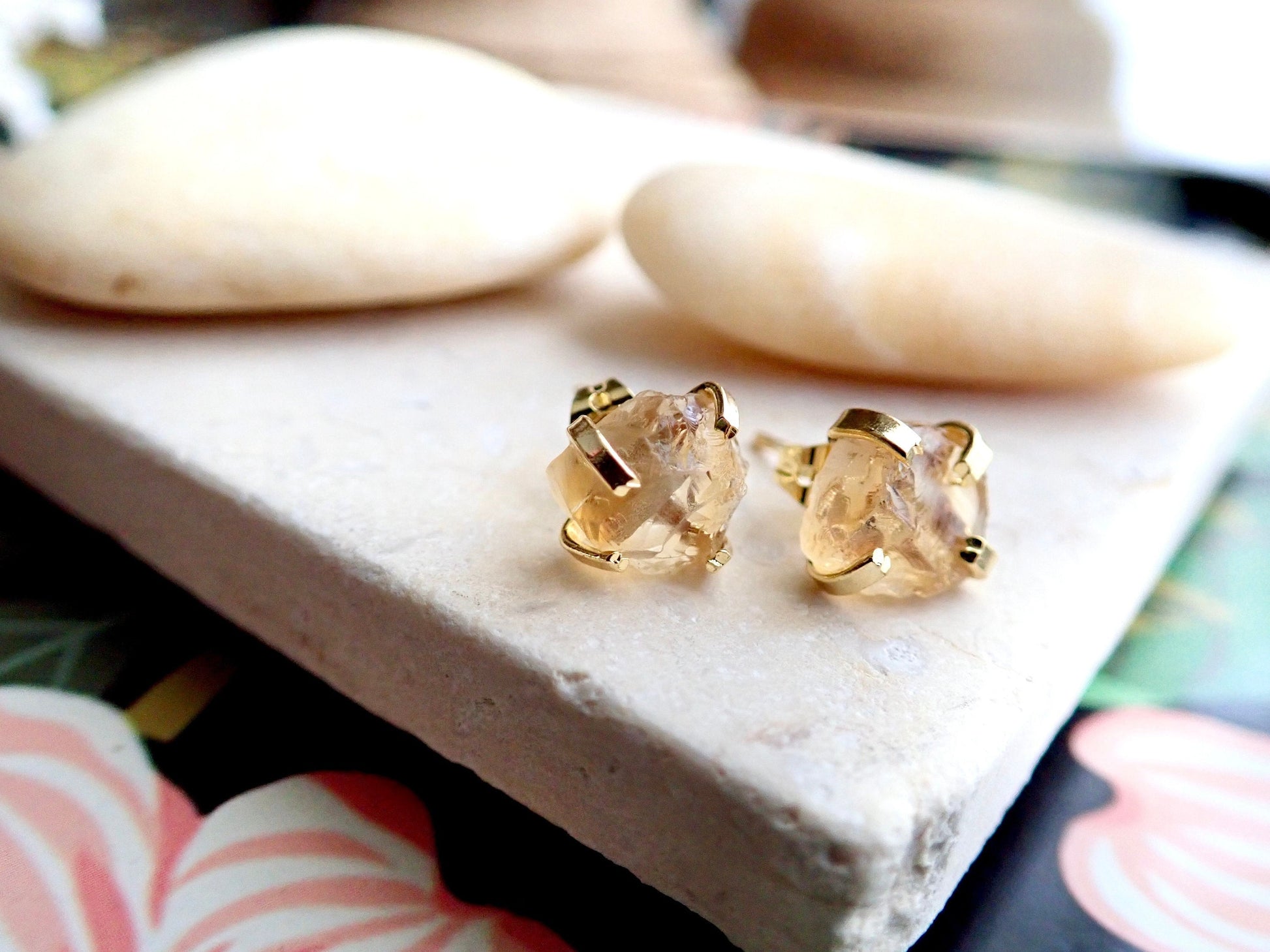 Super sweet rough crystal stud earrings in genuine raw citrine. The handmade prong setting is 14k gold electroplated over brass and is the perfect tableau to show off the warm, sunny color of the rough gems. I use all natural gemstones in my jewelry and love the unique nature of each stone.