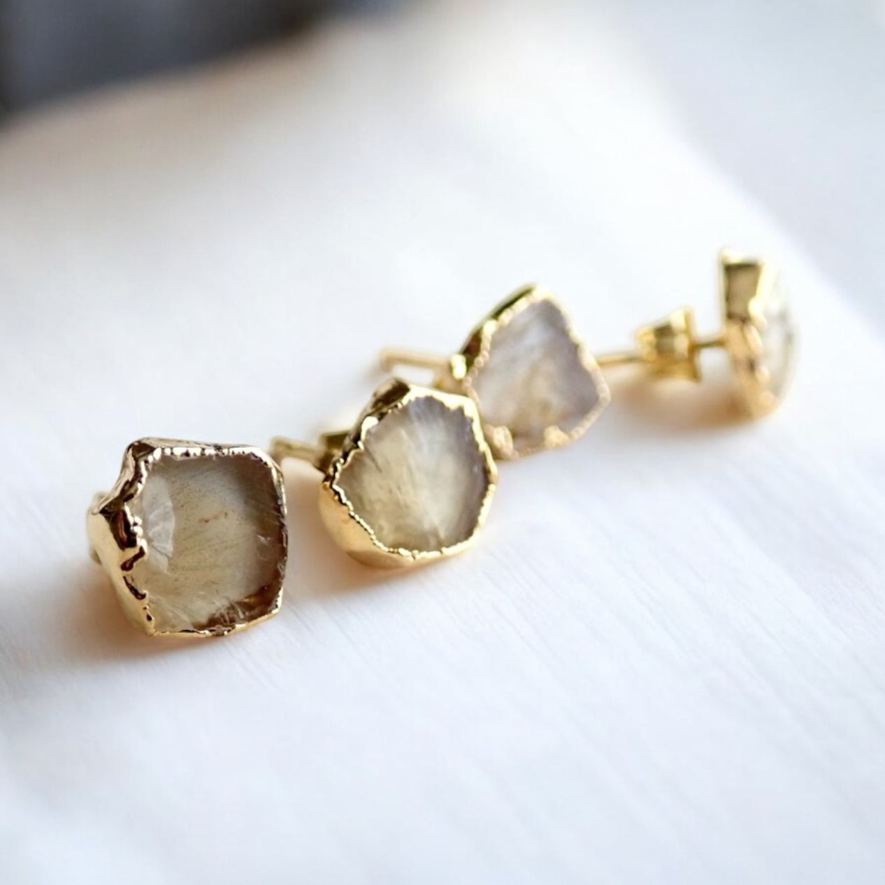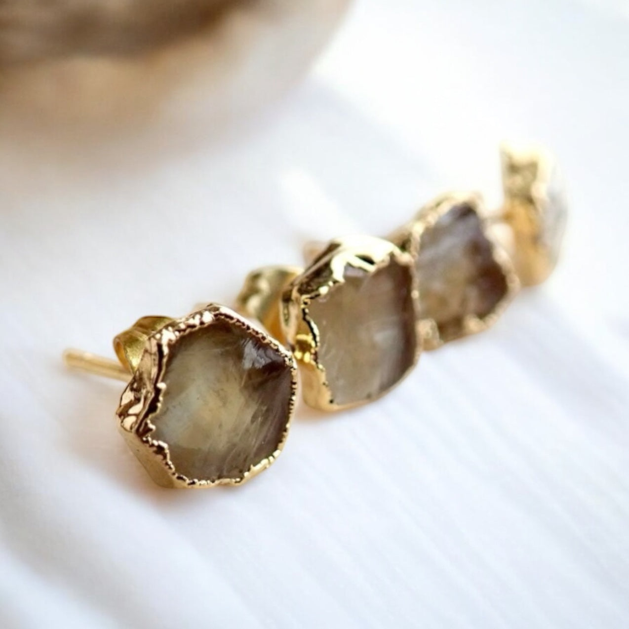Each of the stones we use to create these special earrings were formed by nature over millions of years. Each one is unique and beautiful just like nature itself. They will vary one to another, just like Mother Nature intended. We don't treat our stones in any way and accept their rough and "imperfect" beauty and try to highlight their uniqueness in our plating process. We don't polish away "flaws" in the stones but rather leave them in their natural state. The pair you receive will be what nature intended that stone to be and may be lighter or darker, clear or more opaque, smooth or rough, rounded or angular. Just like people, each stone has special characteristics unique to itself and in that lies the beauty.