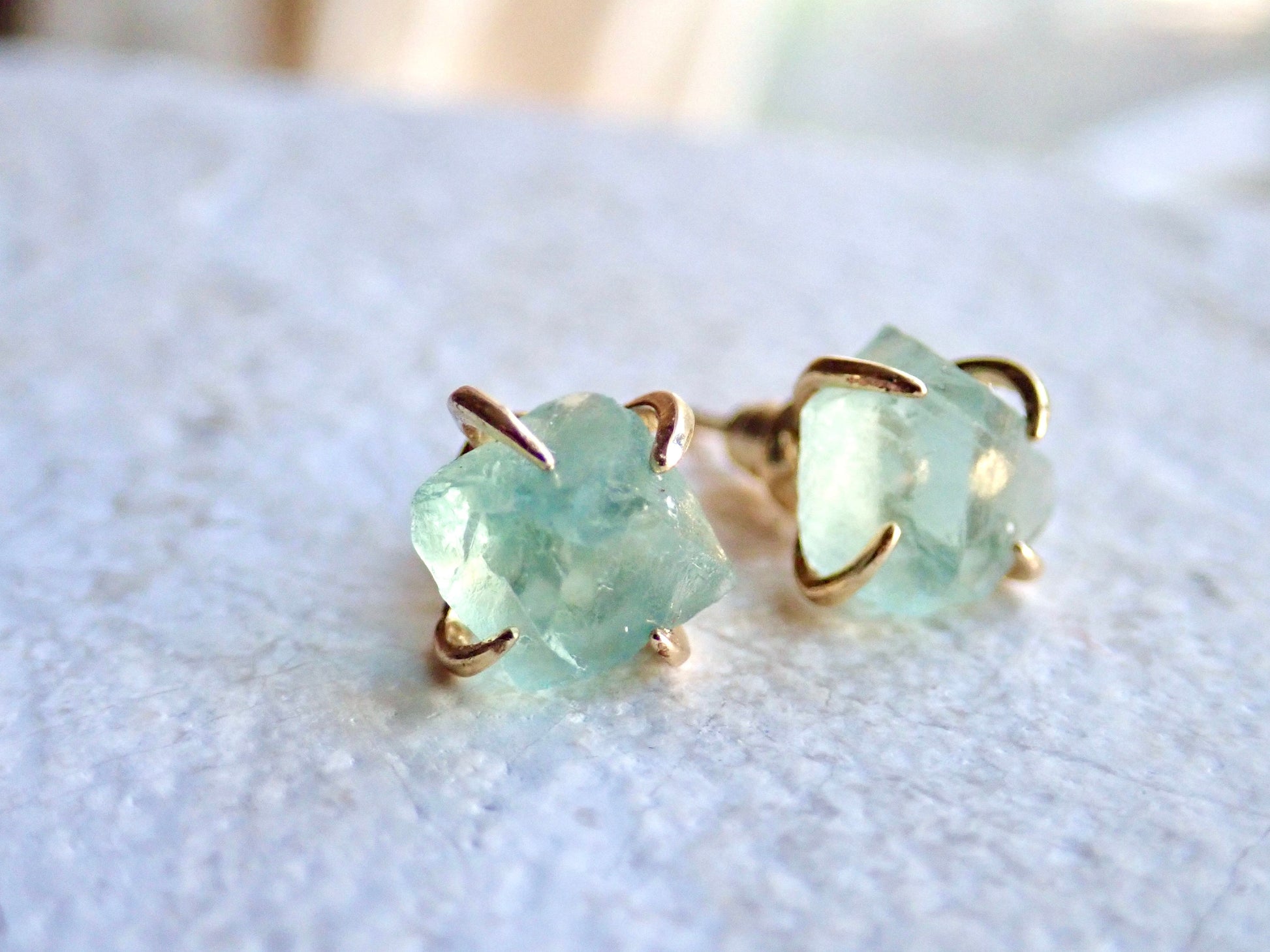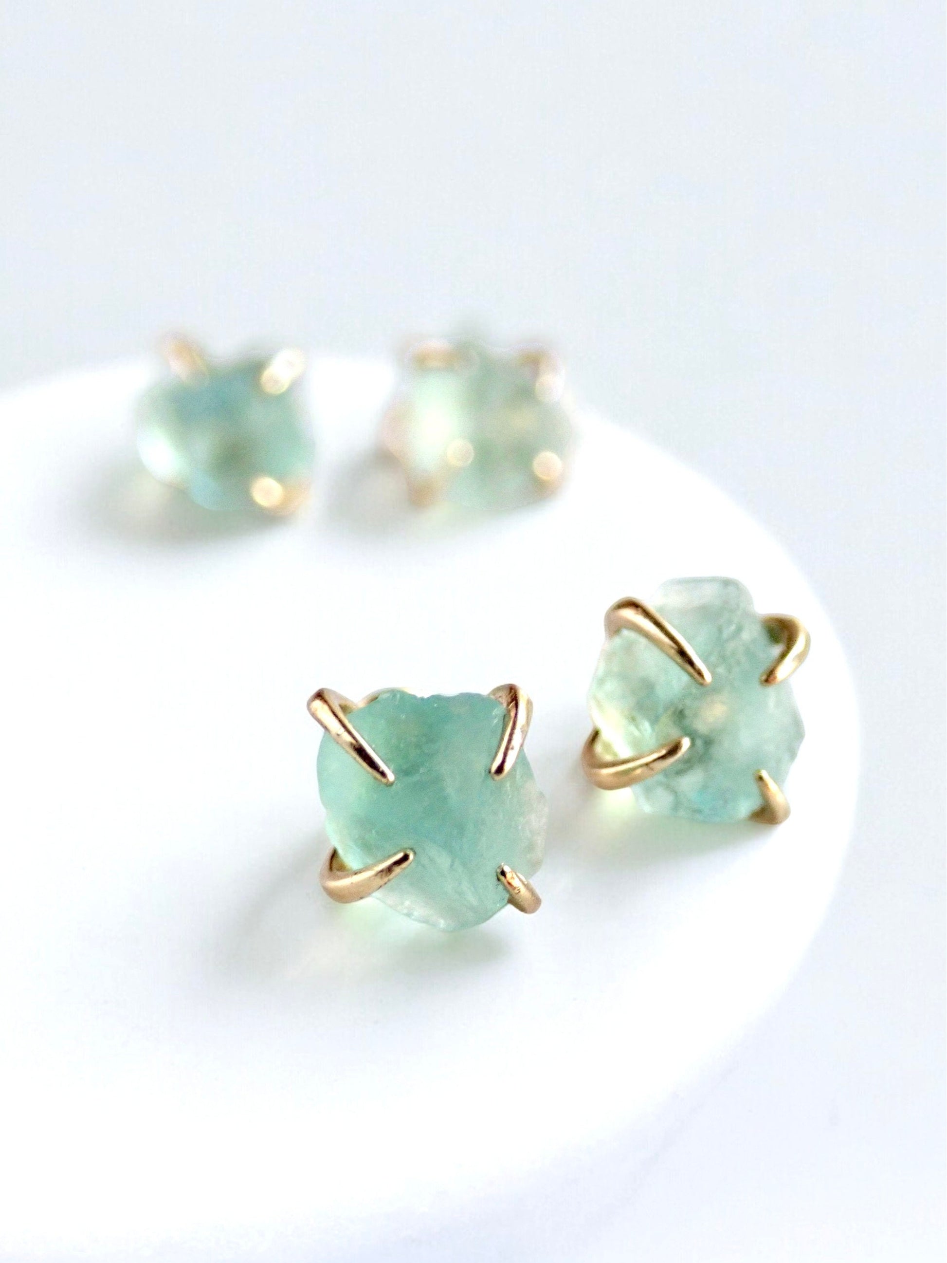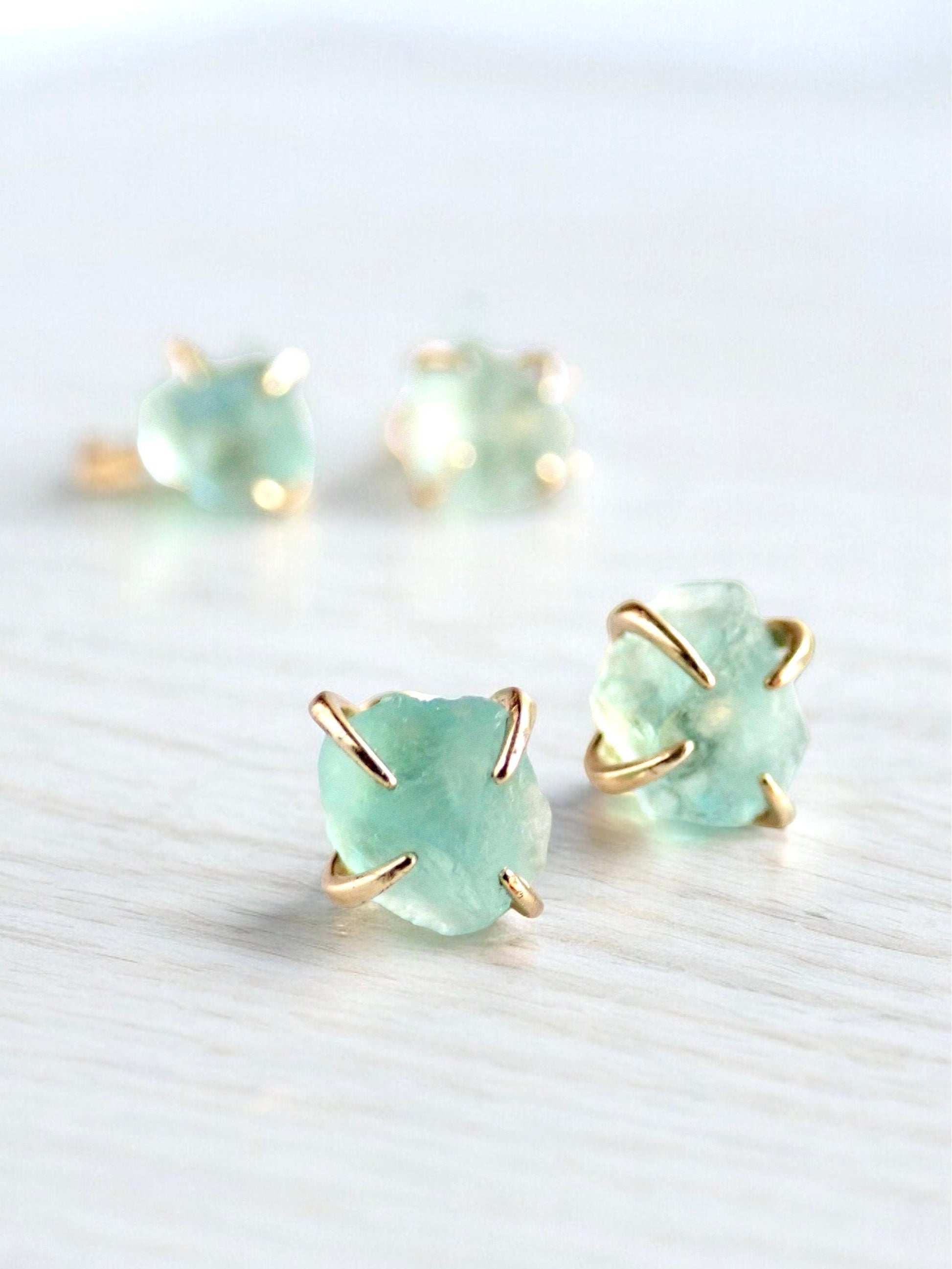 Super sweet gold stud earrings in genuine raw green fluorite prong-set in 14k gold plated posts. These rough crystal studs are perfect for everyday and make fantastic gifts.