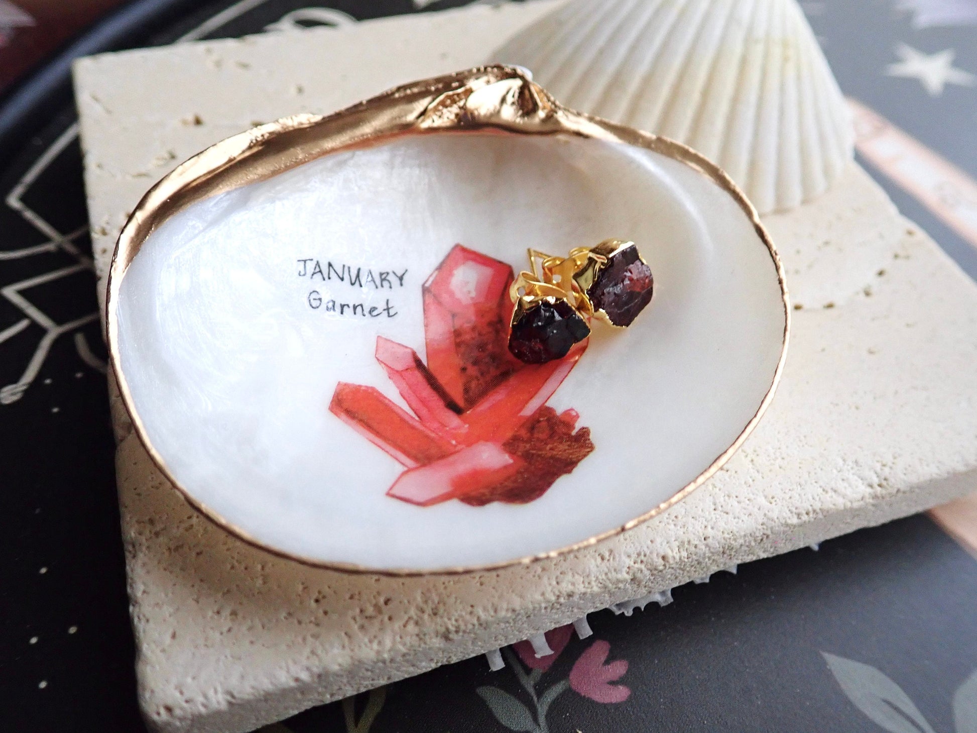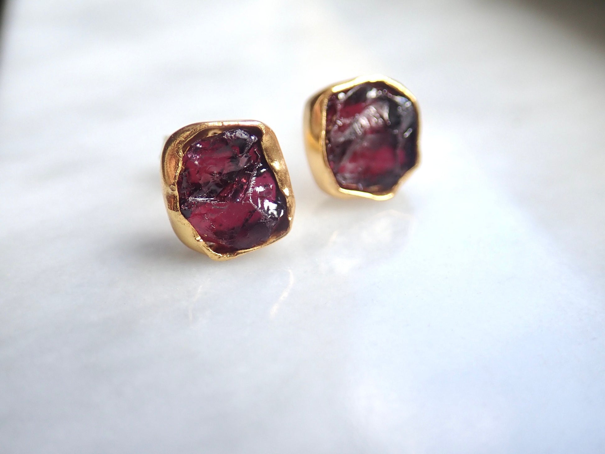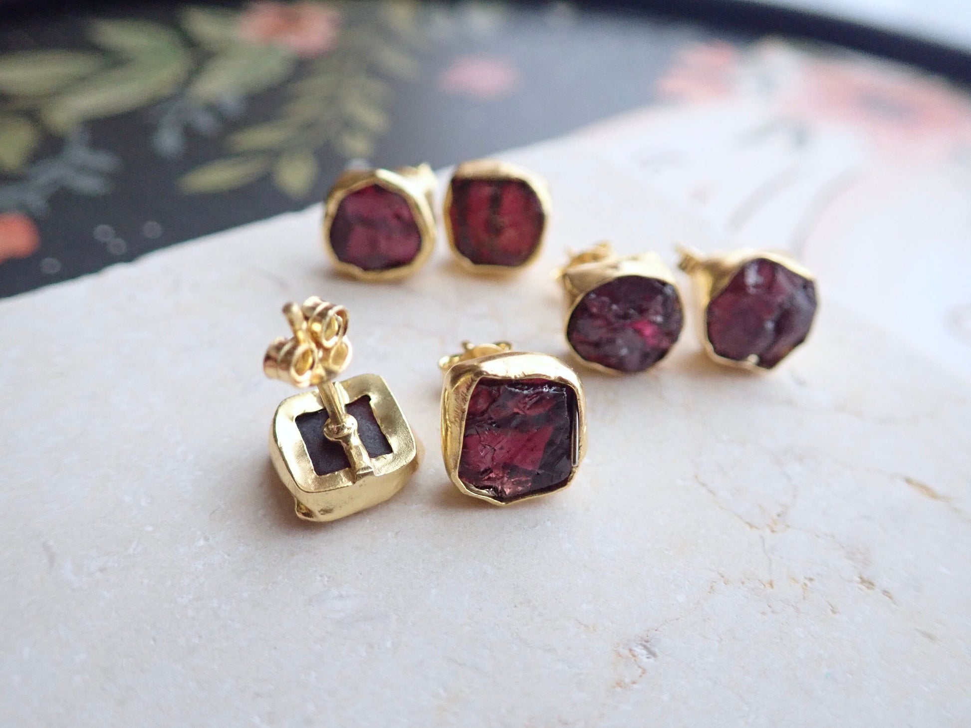 Beautifully redesign of our most popular raw garnet stud earrings. This new design features an open-back bezel setting and is 100% hypo-allergenic sterling silver plated with 14k gold. Natural and raw garnets are tightly set into and surrounded by the bezel setting.