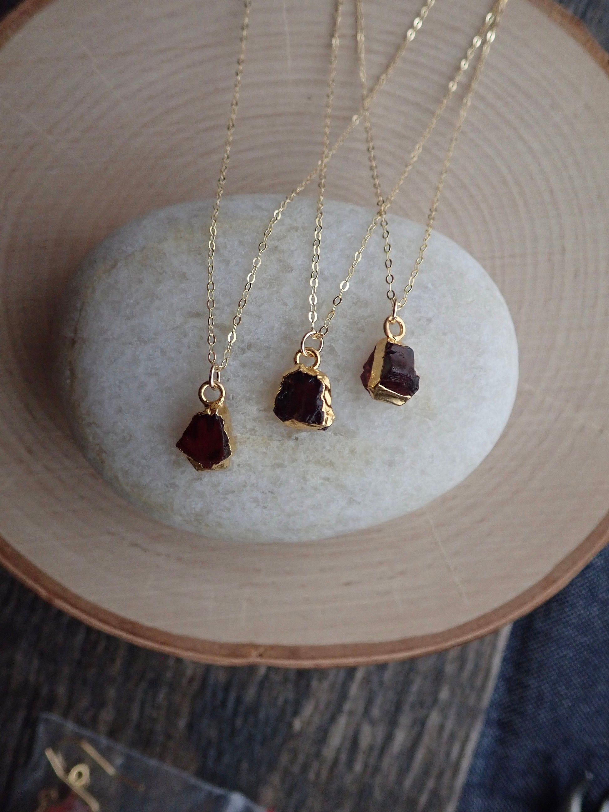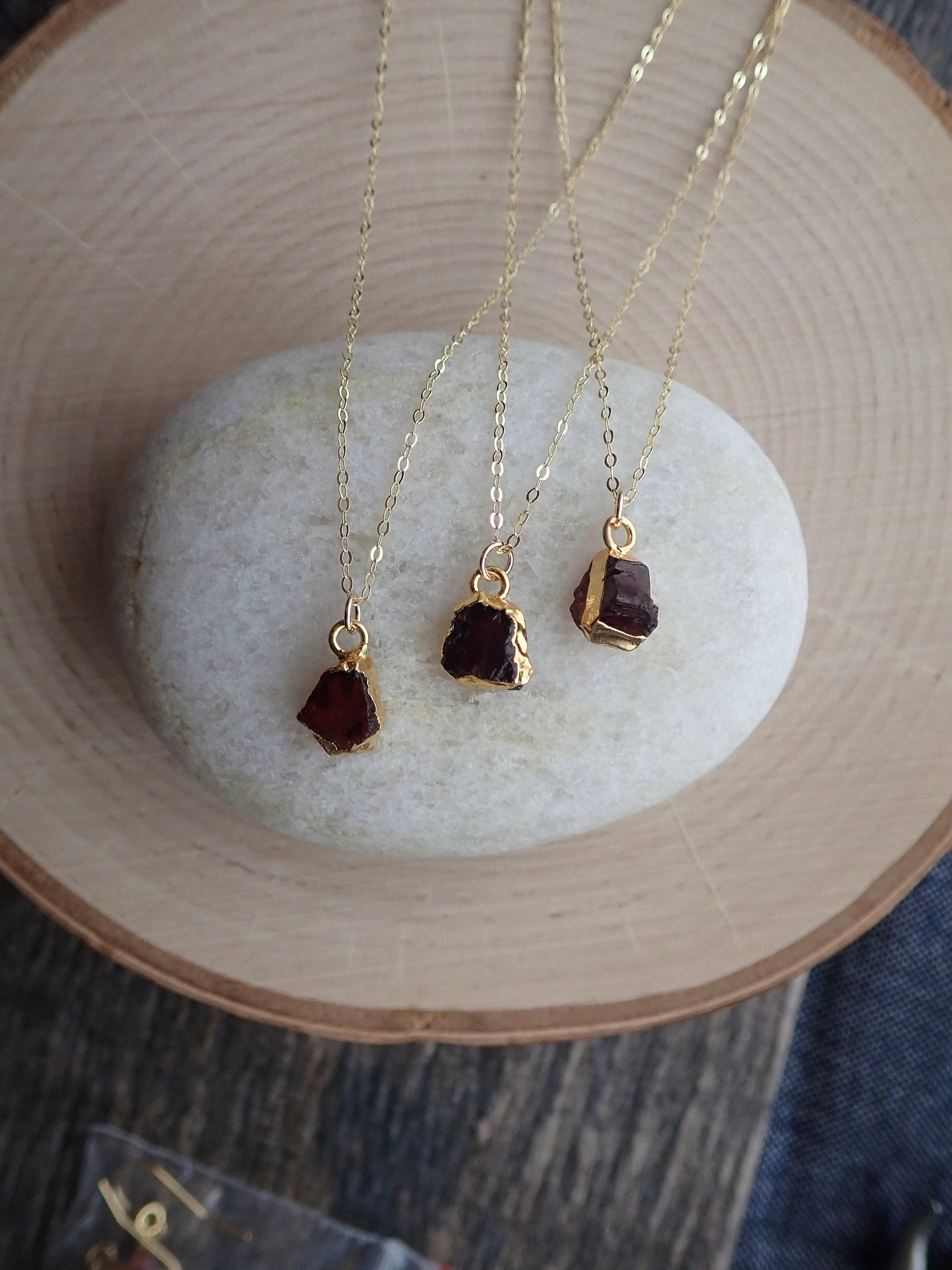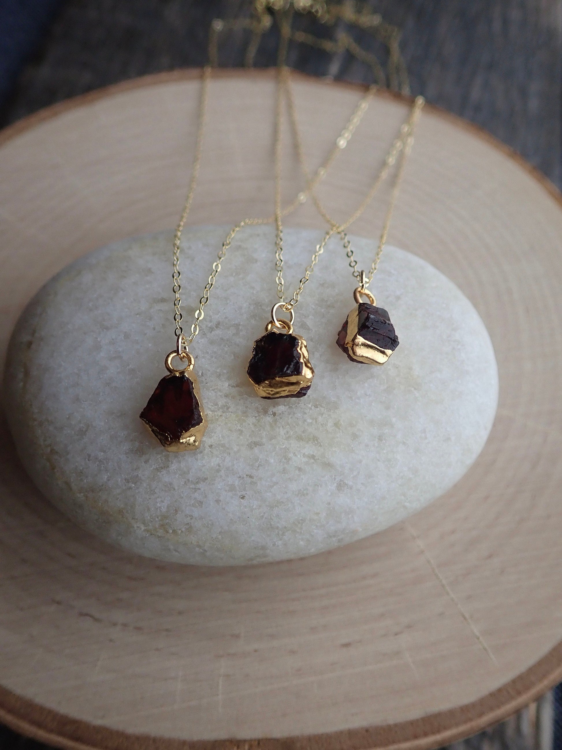 Beautiful and all-natural garnet gemstones electoplated in 14k gold and hung from a dainty an light-catching gold fill chain. Super sweet everyday necklace in genuine and alluring Garnet. This January Birthstone has been used by civilizations for eons who cherished it for it's deep red color and inner glow. A stone of love and friendship it is also the traditional gift given for 2nd year wedding anniversaries. In earlier times, garnets were exchanged as gifts between friends to demonstrate their affection for each other and to insure that they meet again. ✧ Hand-picked stones electroplated in 14k gold.