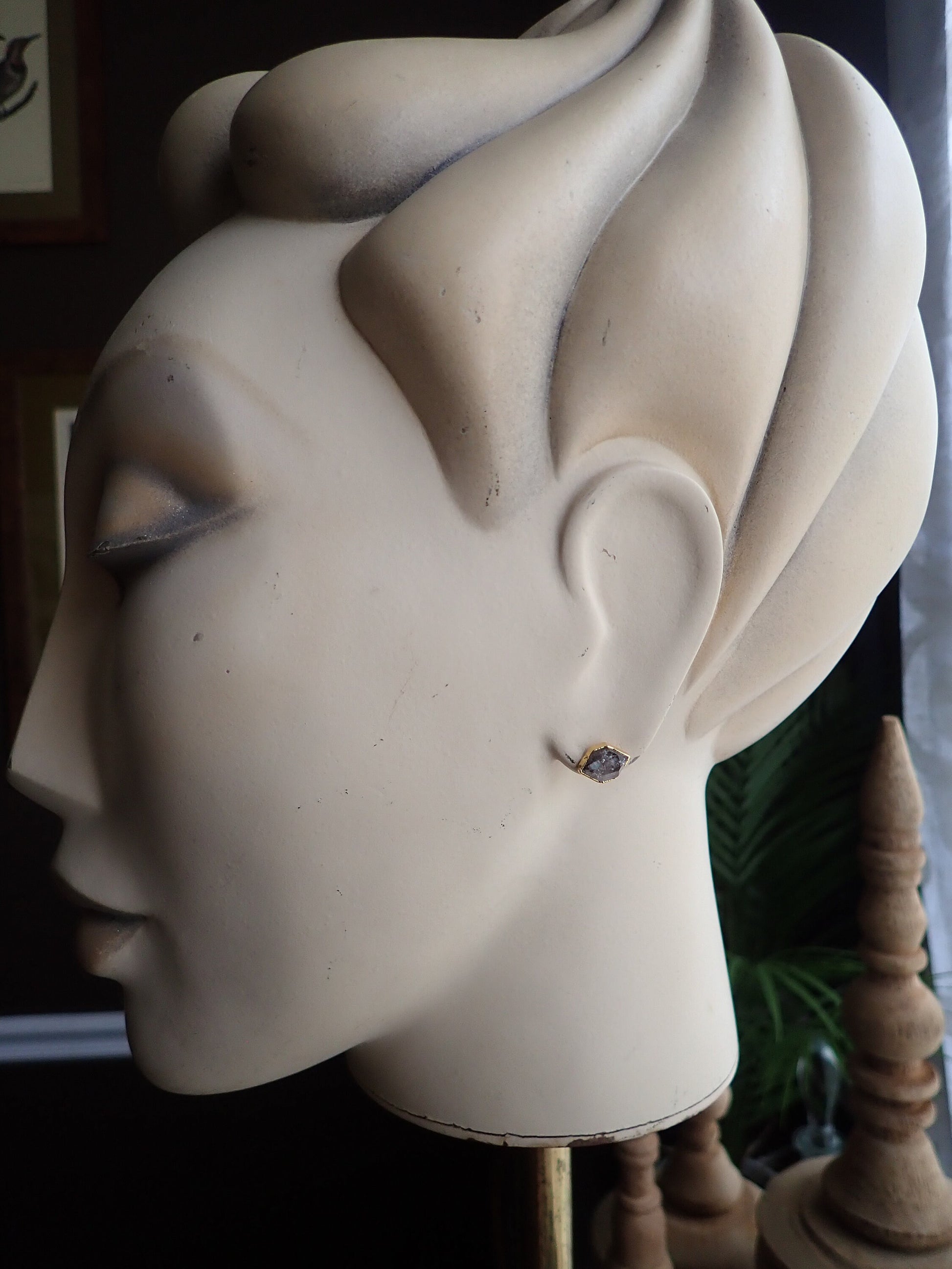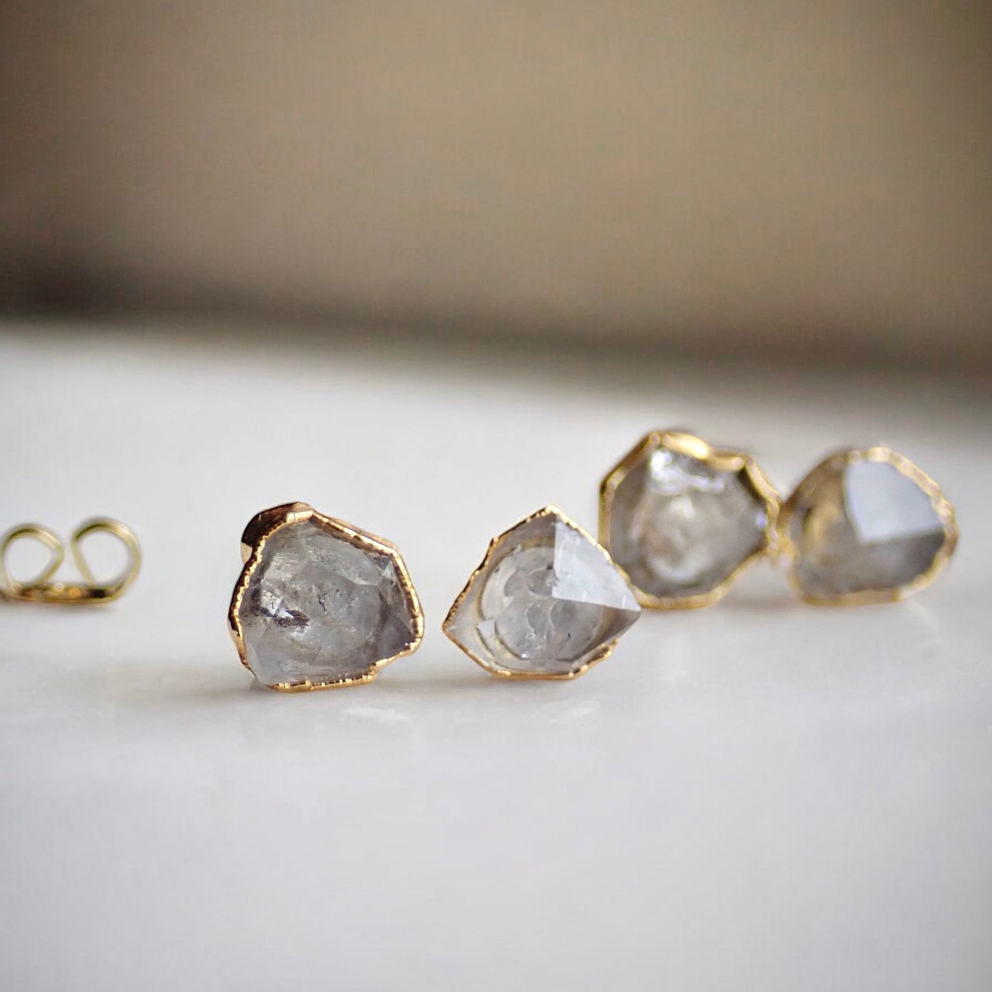 Elevate your everyday sparkle with these stunning raw Herkimer diamond stud earrings, electroplated in luxurious 14k gold. Each earring features a natural Herkimer quartz crystal. Please see all photos- these can range from clear to salt & pepper to dark. No two stones are exactly alike, making each pair uniquely yours.