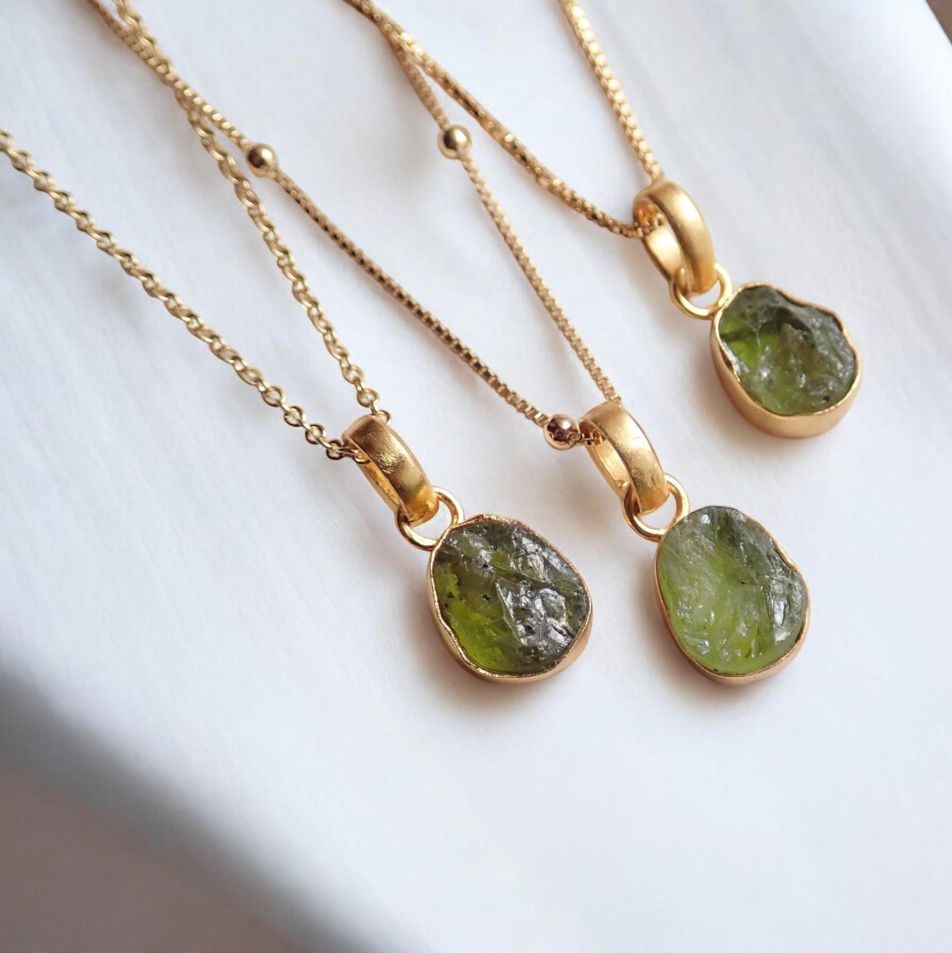 Raw Peridot Pendant Necklace | Genuine Peridot in 14K Gold Vermeil Collet Setting | Custom 18K Gold Filled Chain Options