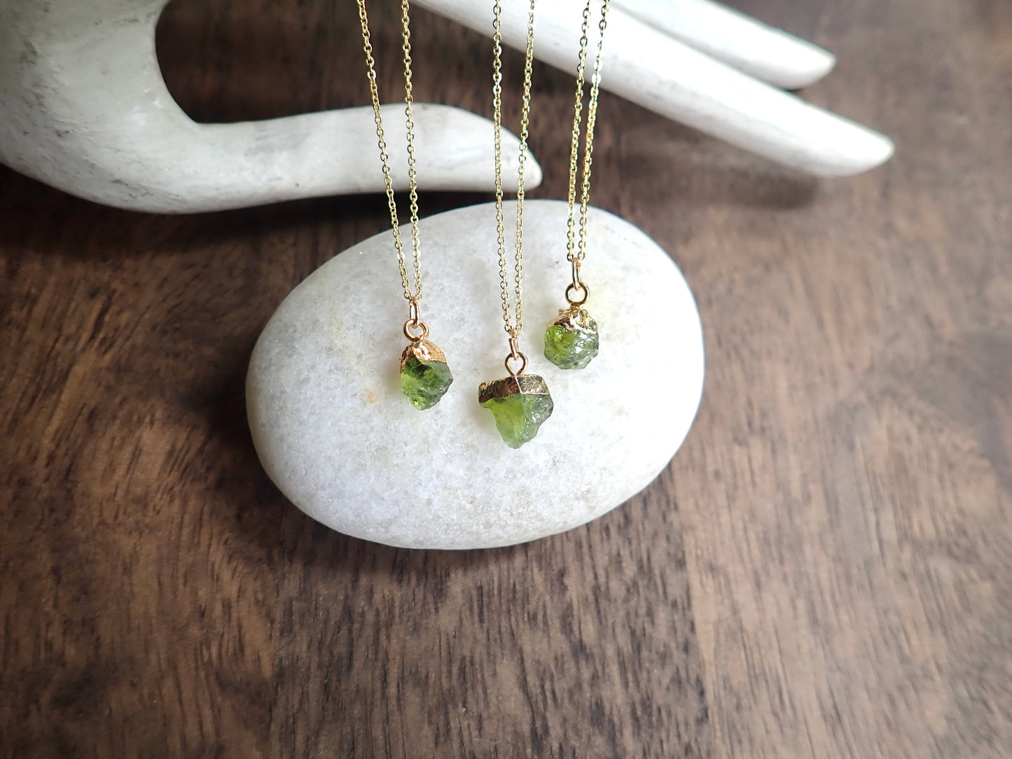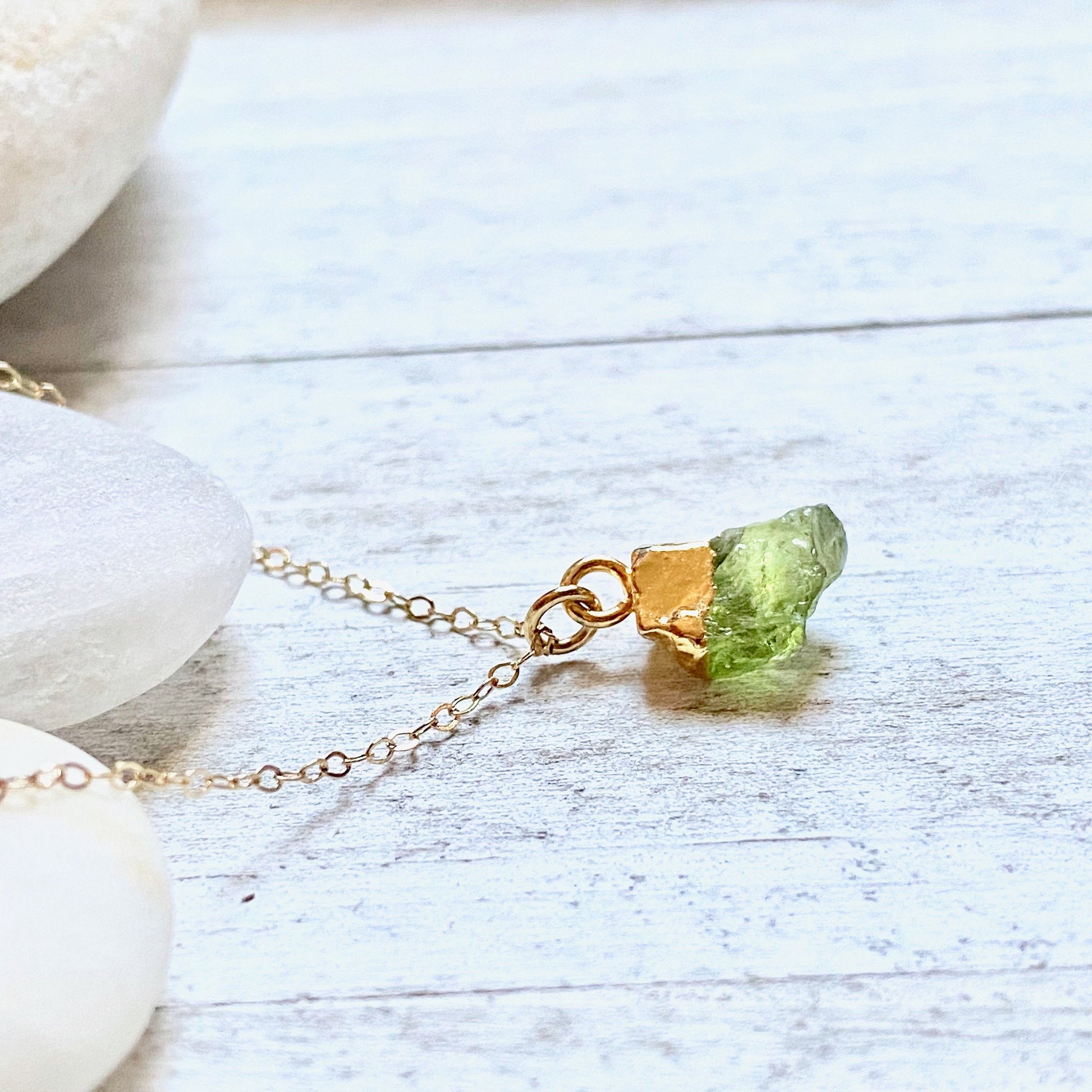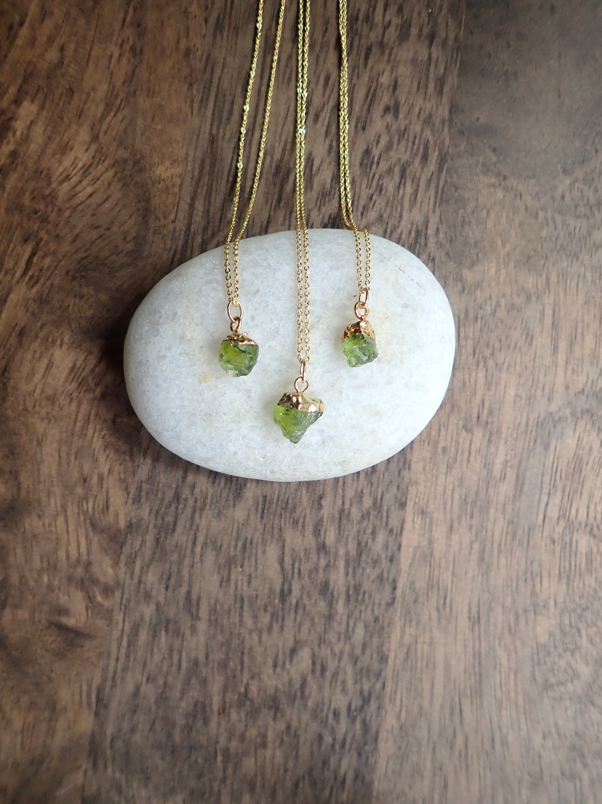 Beautiful and all-natural peridot gemstones electoplated in 14k gold and hung from a dainty an light-catching gold fill chain.
