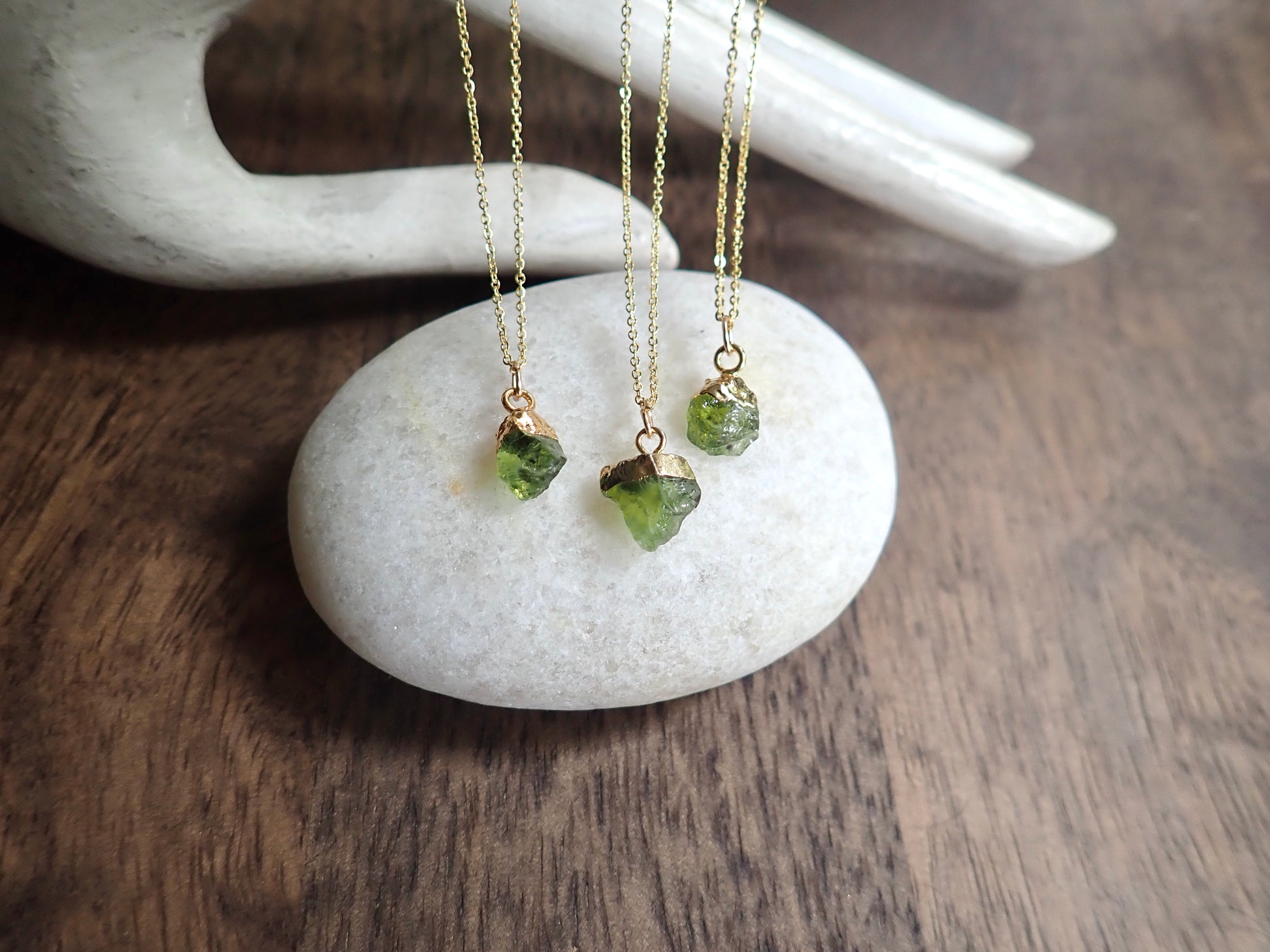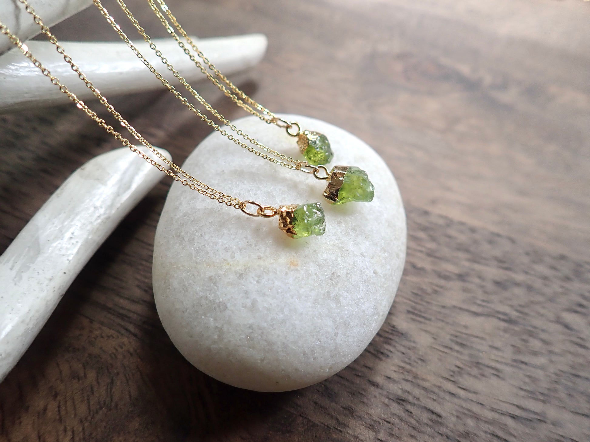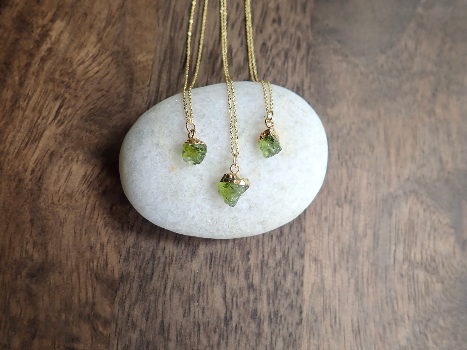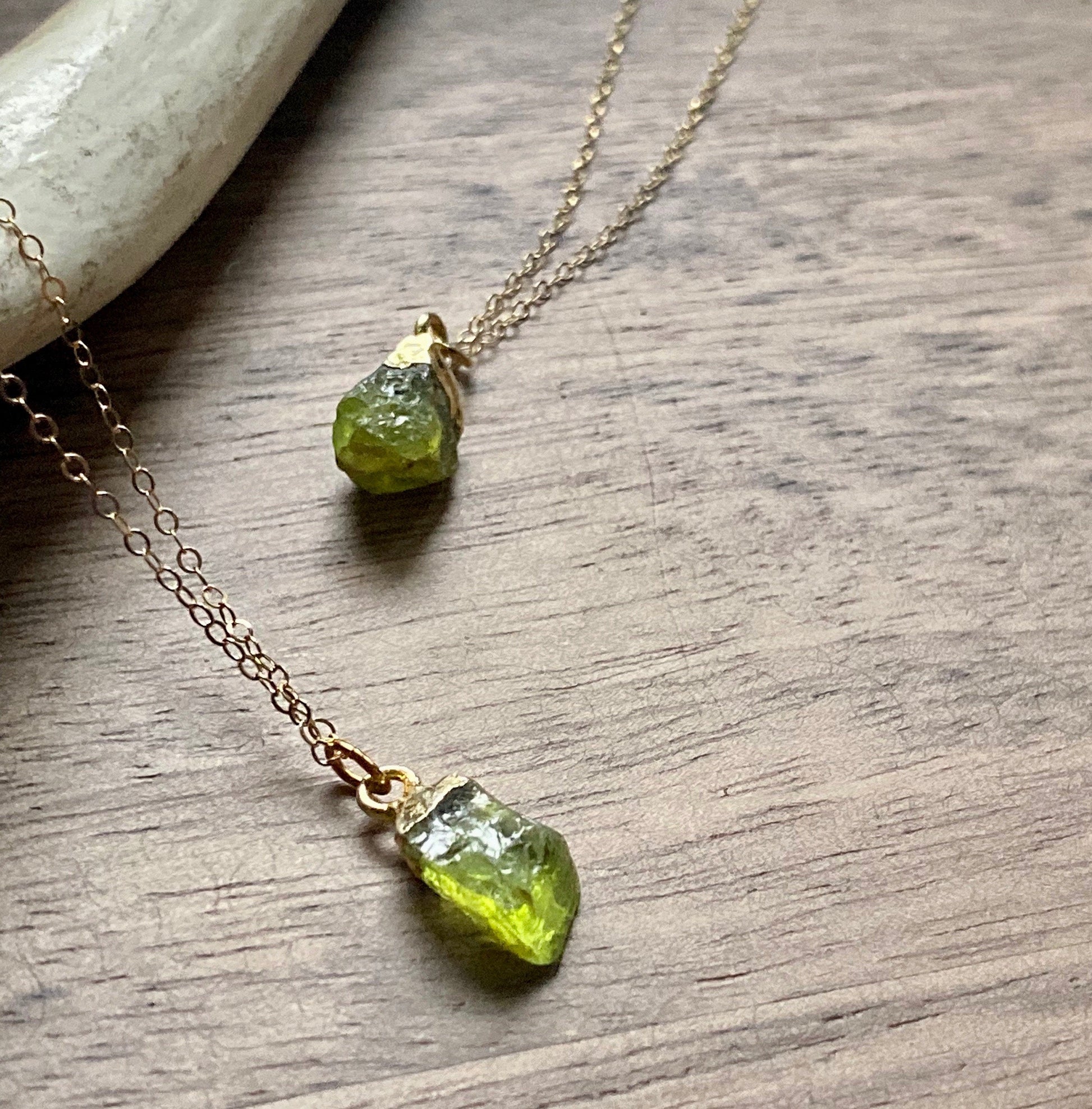 Beautiful and all-natural peridot gemstones electoplated in 14k gold and hung from a dainty an light-catching gold fill chain.
