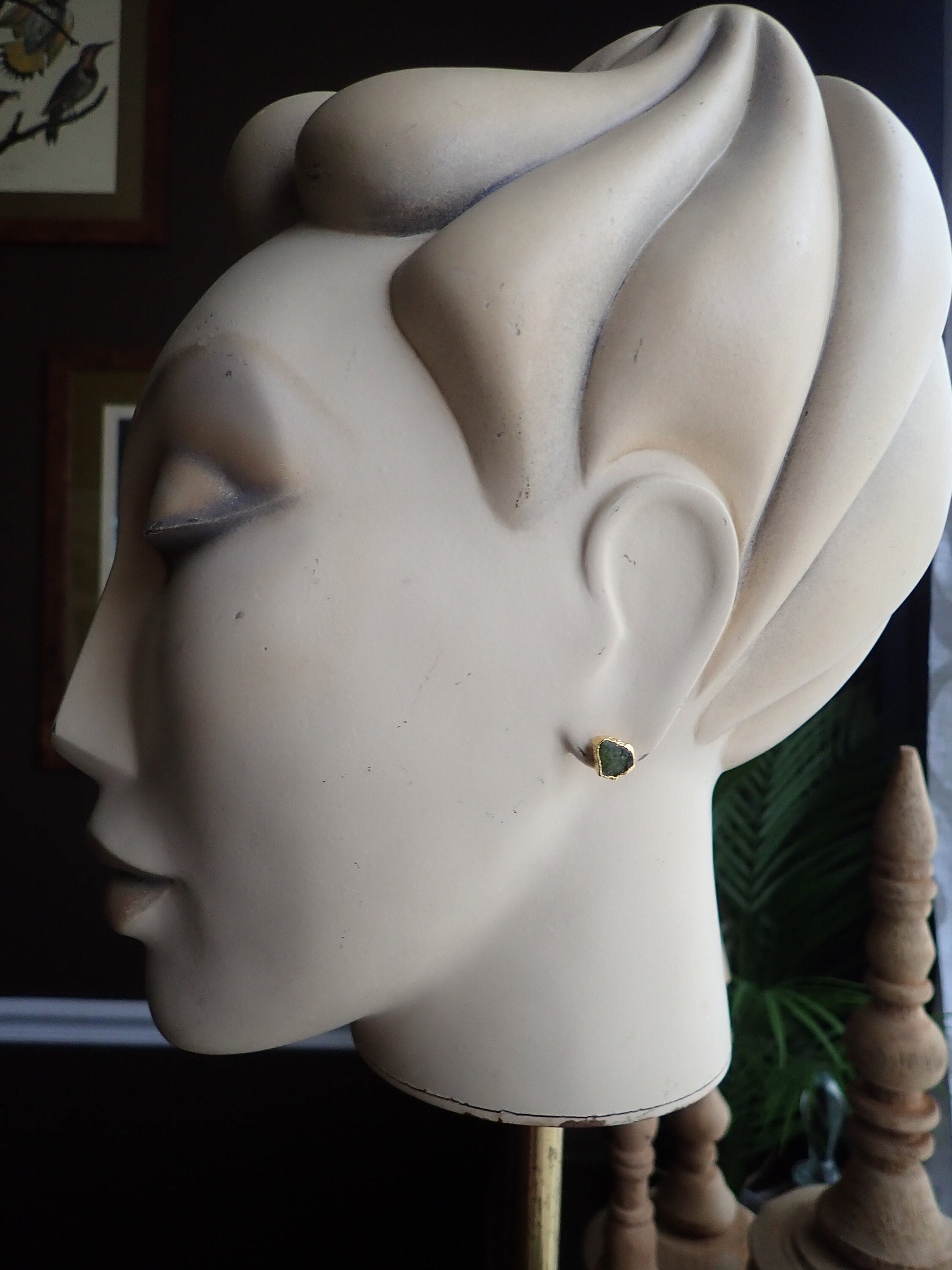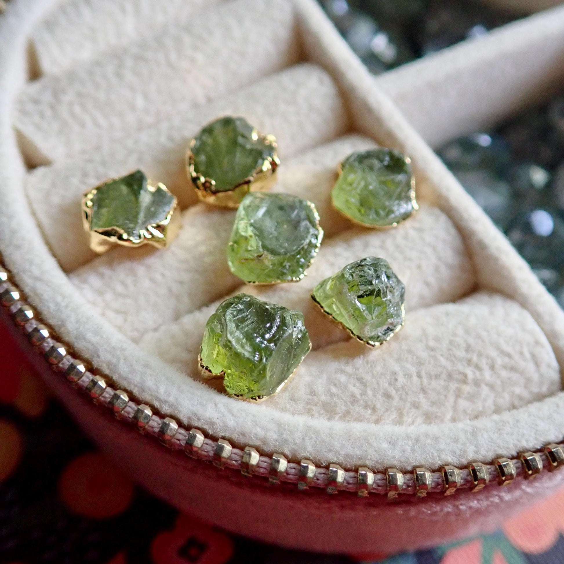 Gorgeous little raw peridot stud earrings electroplated in 14k gold.
